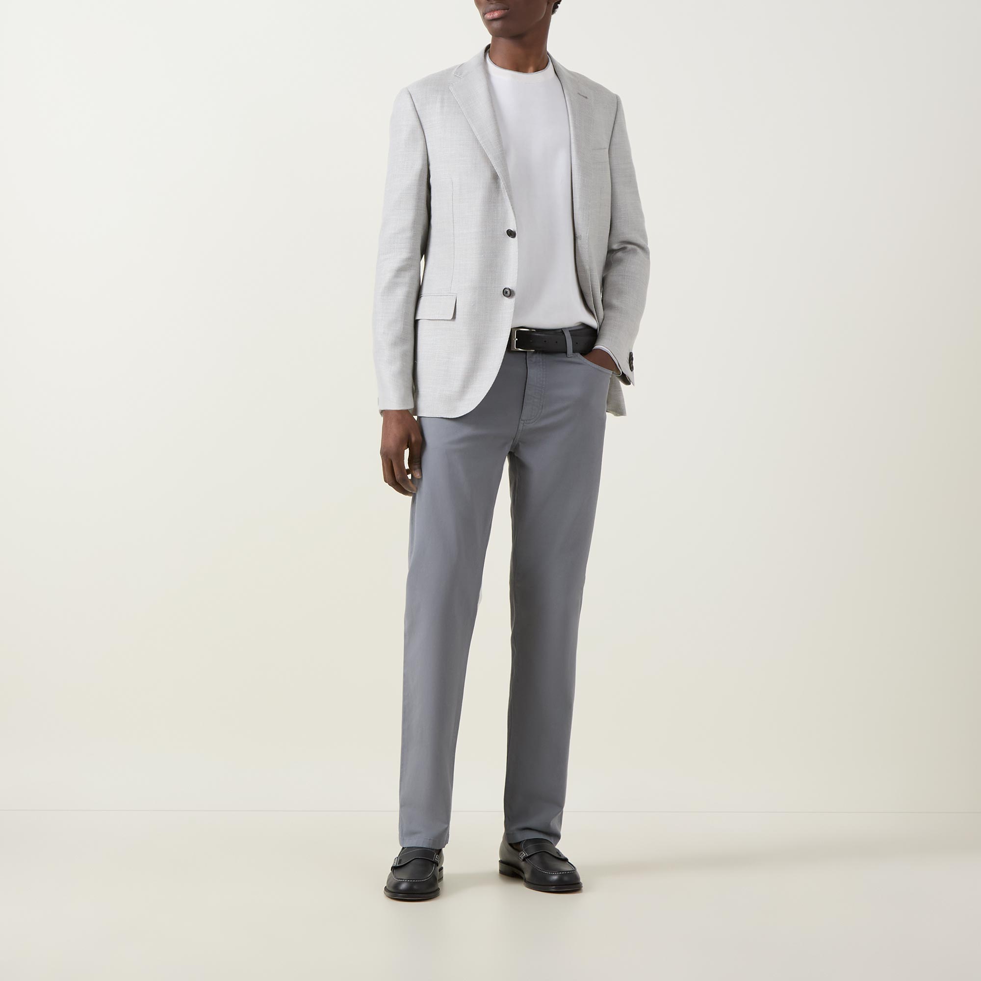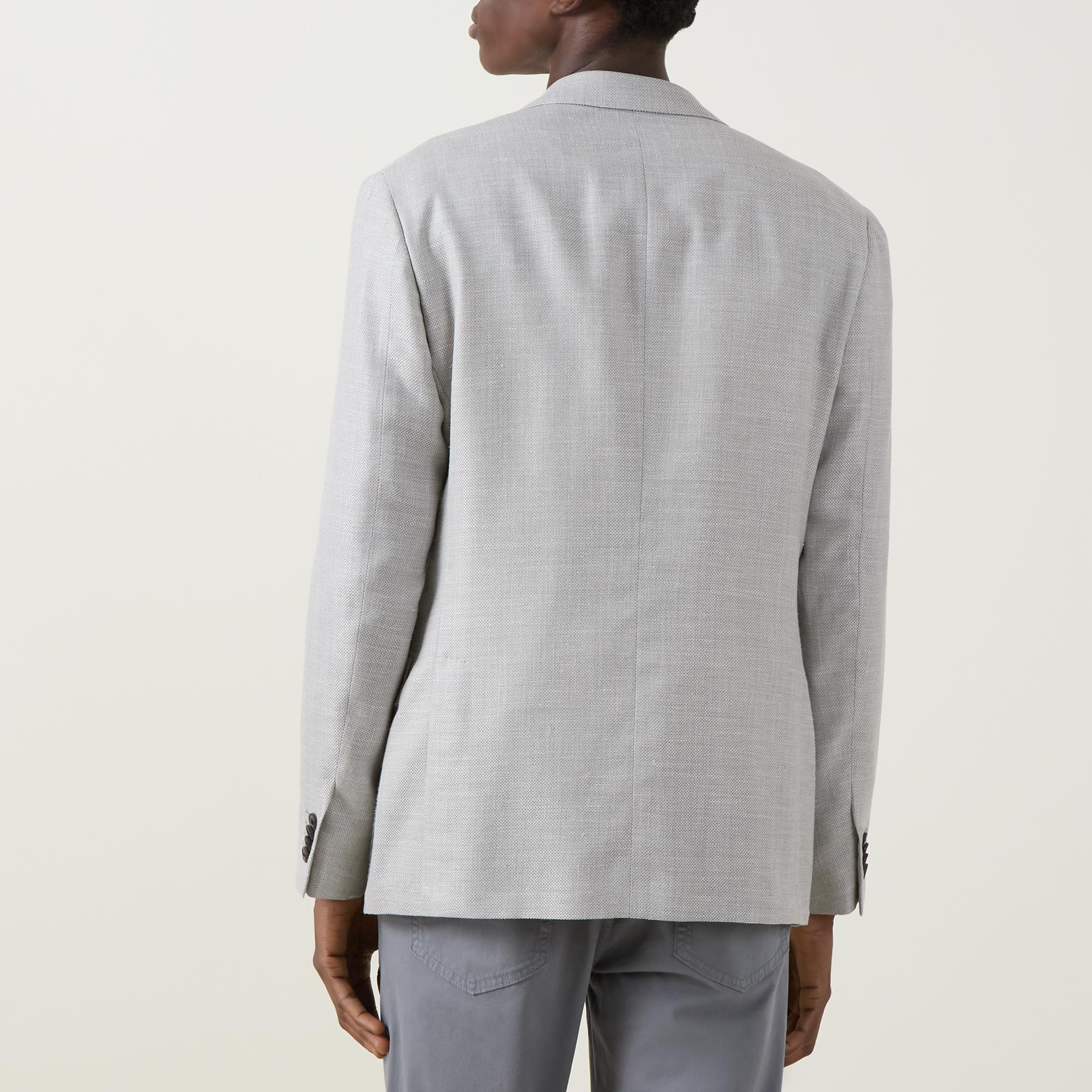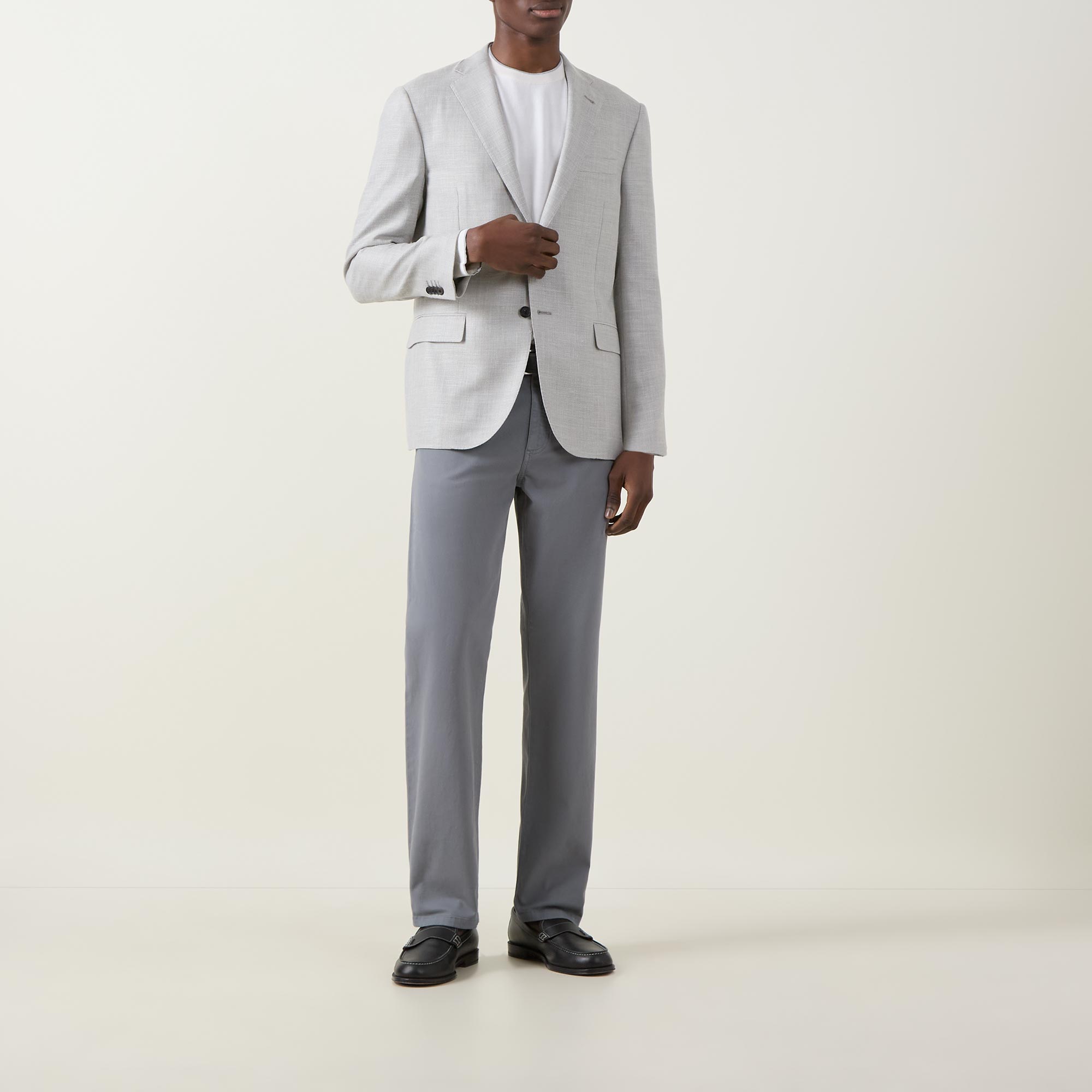 - Single-breasted front, long sleeves, notched-lapel collar, button fastening, one chest welt pocket, two side flap pockets, buttoned cuffs, smooth fabric