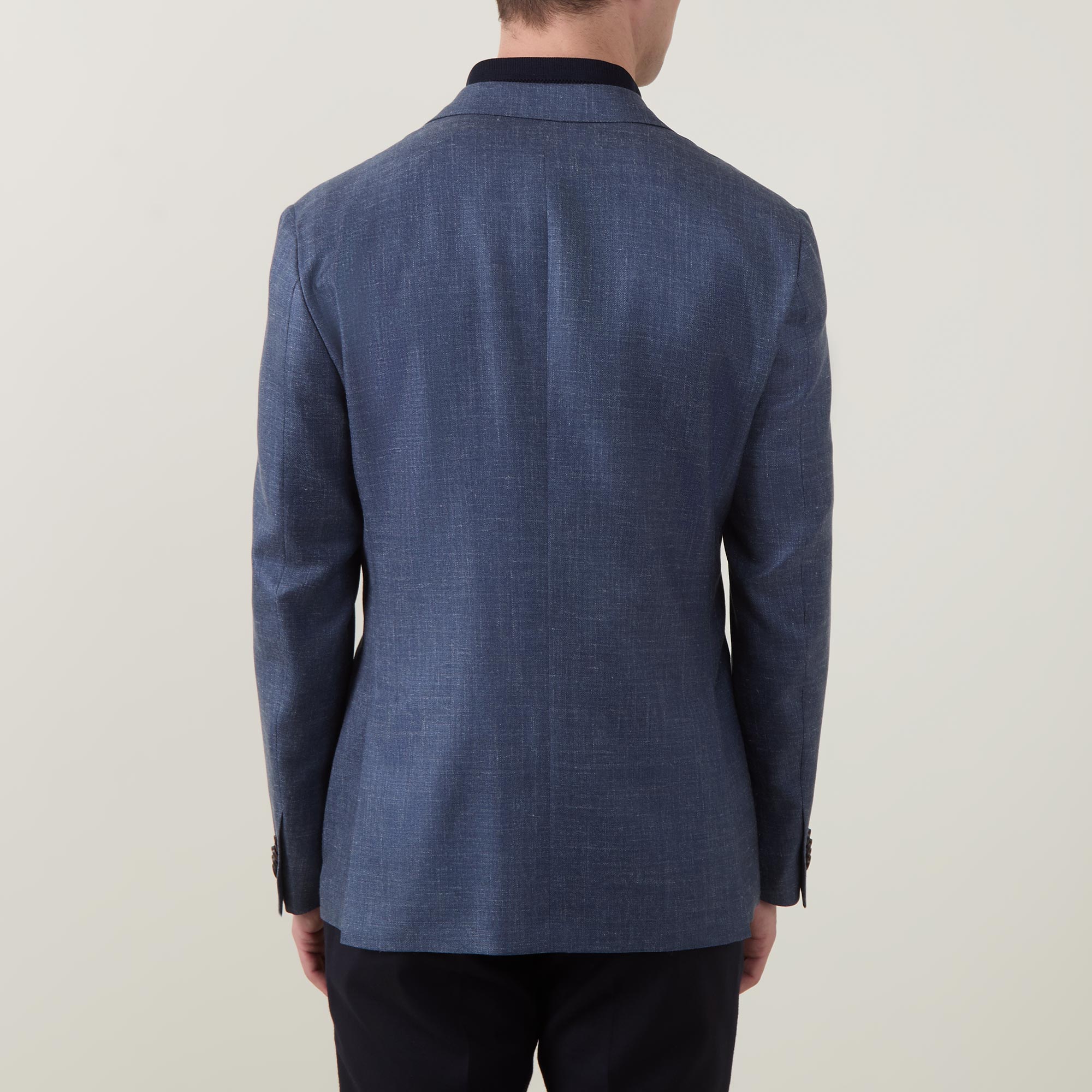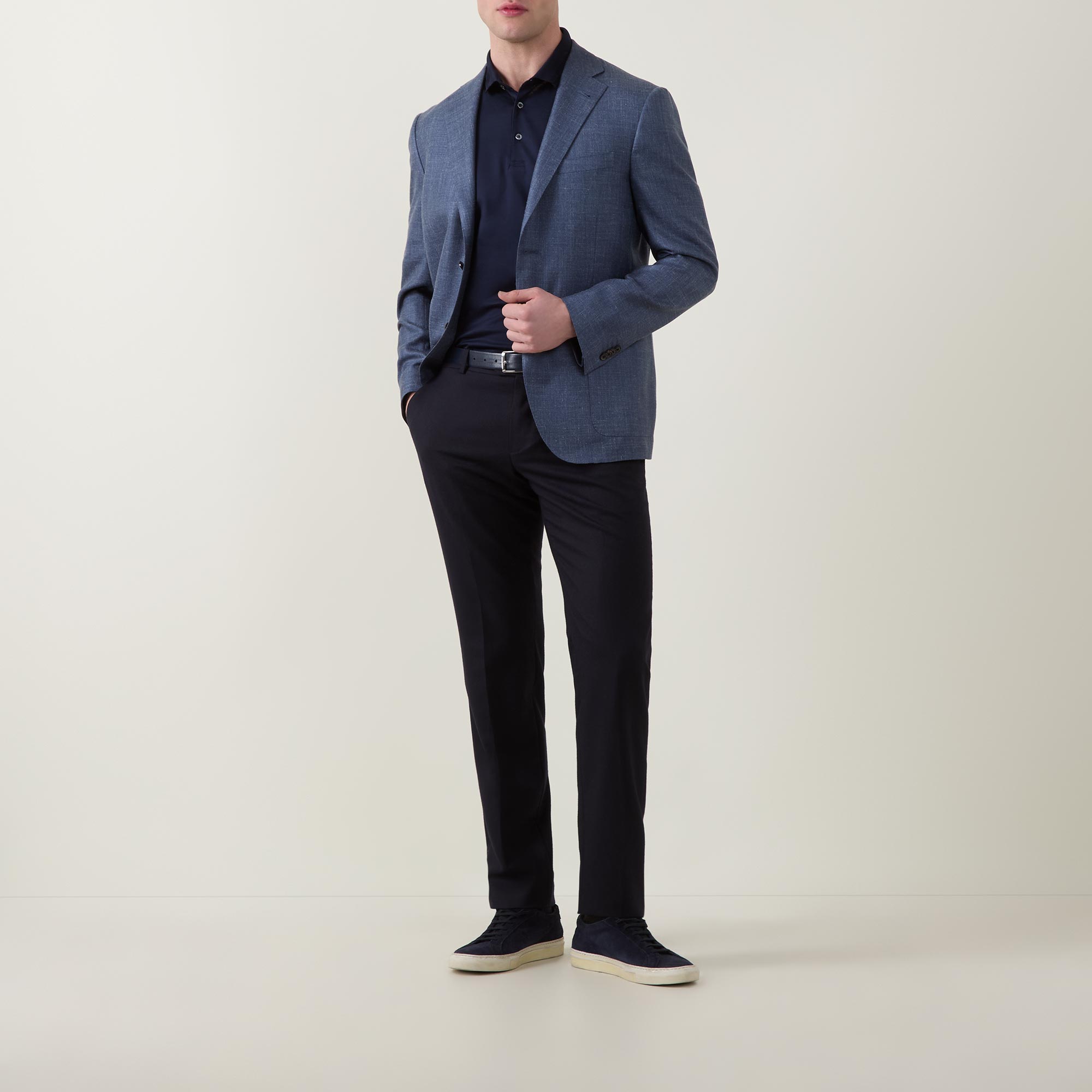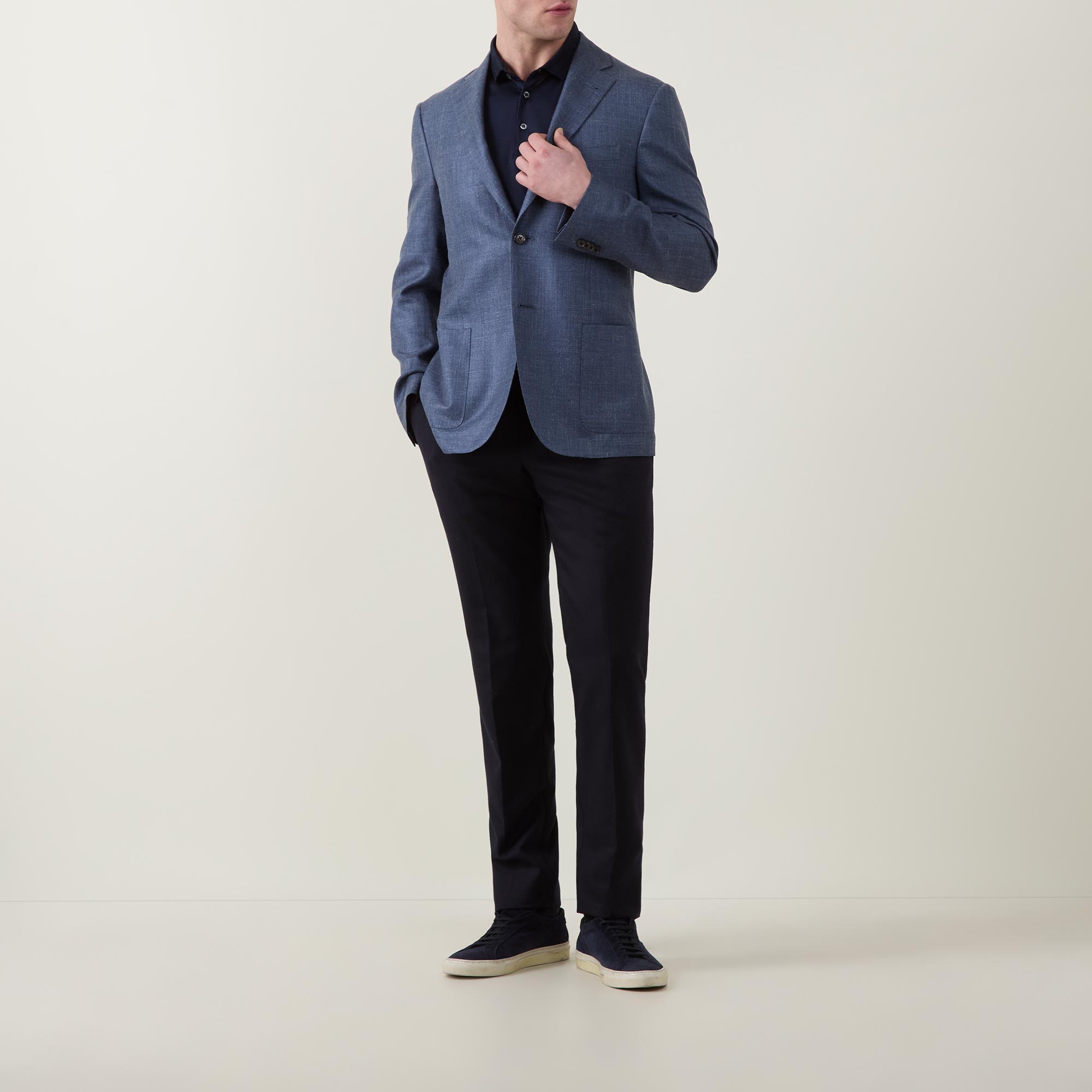 - Single-breasted front, long sleeves, notched-lapel collar, button fastening, one chest welt pocket, two side patch pockets, buttoned cuffs, side hem vents, smooth twill fabric