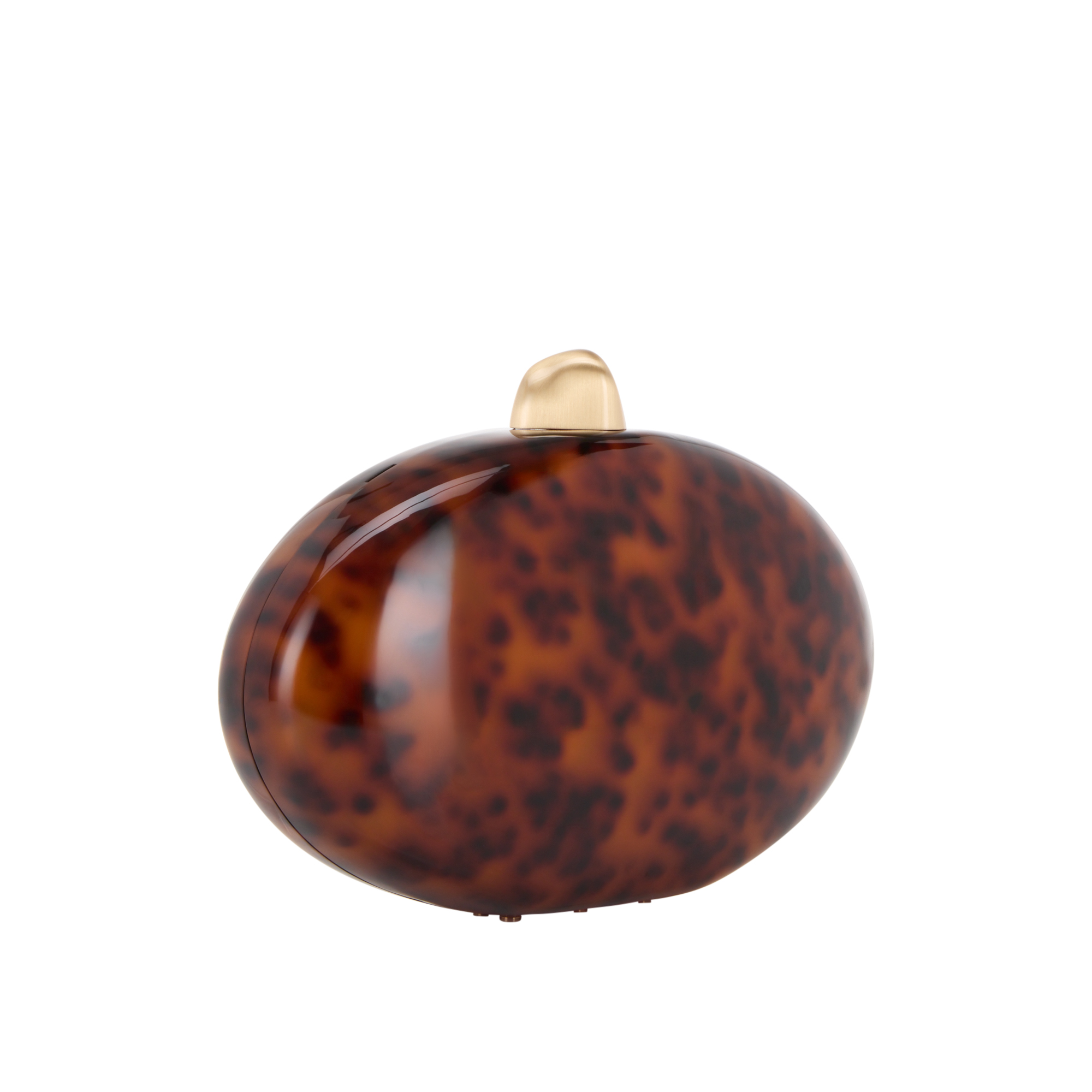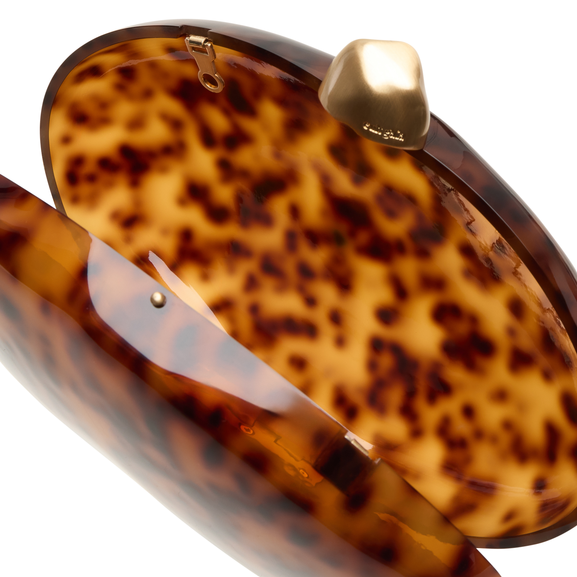 - Oval shape, clasp closure, detachable chain-link strap, gold-tone hardware, tortoise shell pattern, logo details