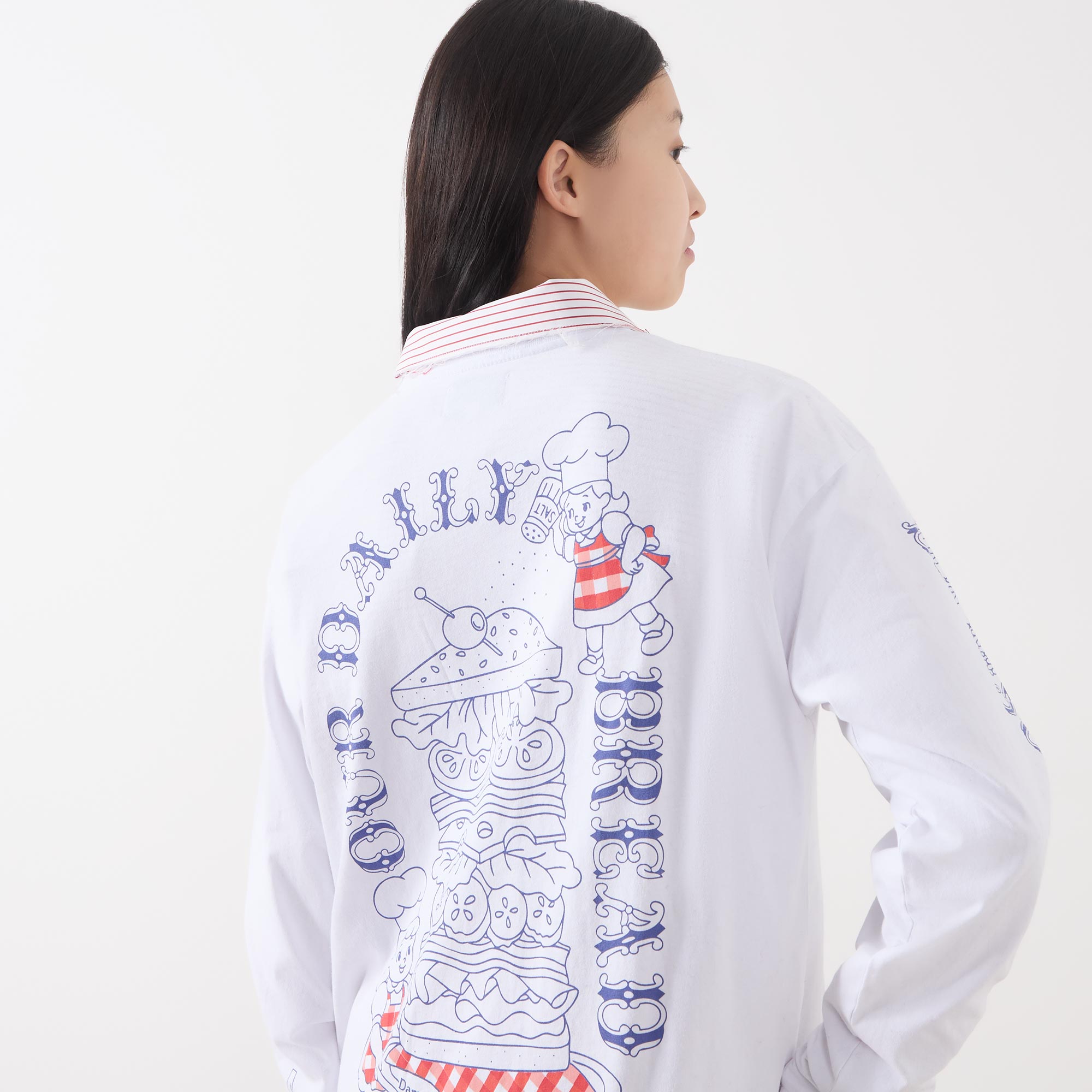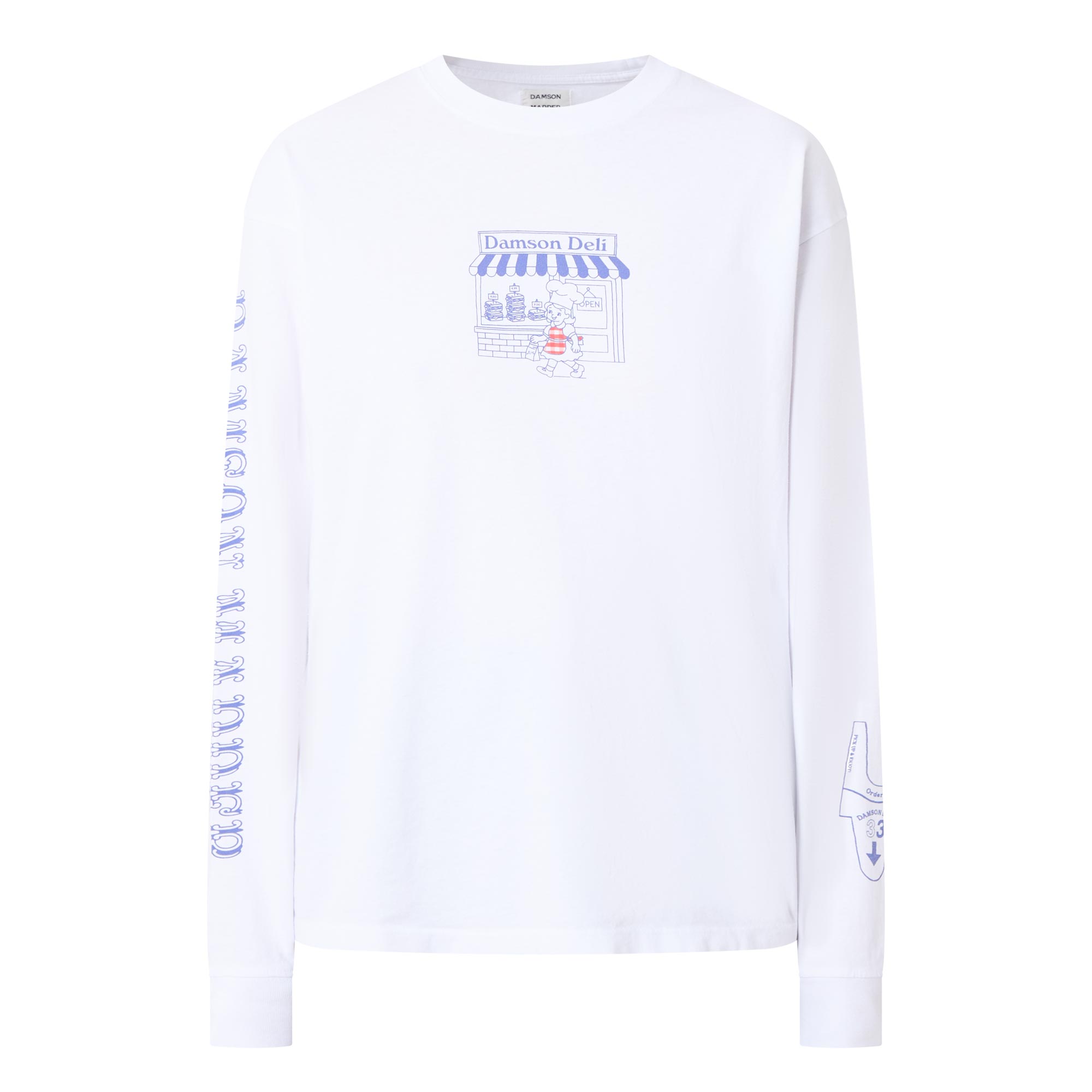 - Crew neckline, dropped shoulders, long sleeves, ribbed cuffs, straight hem, tonal stitching, Damson Deli graphic at the centre front, playful graphic printed design on the back