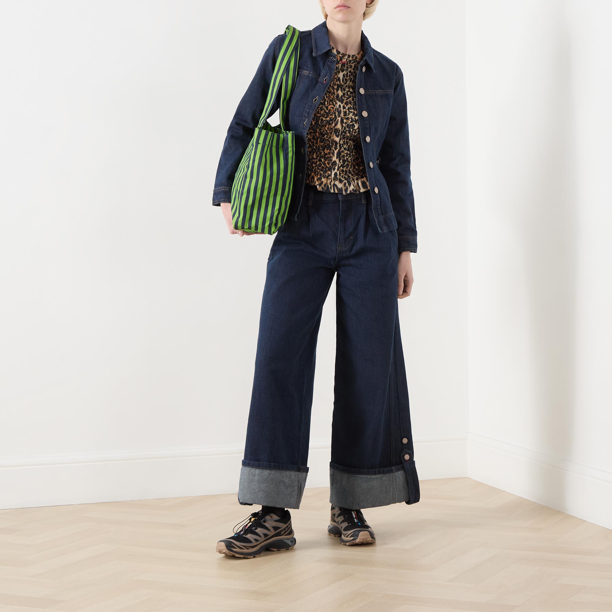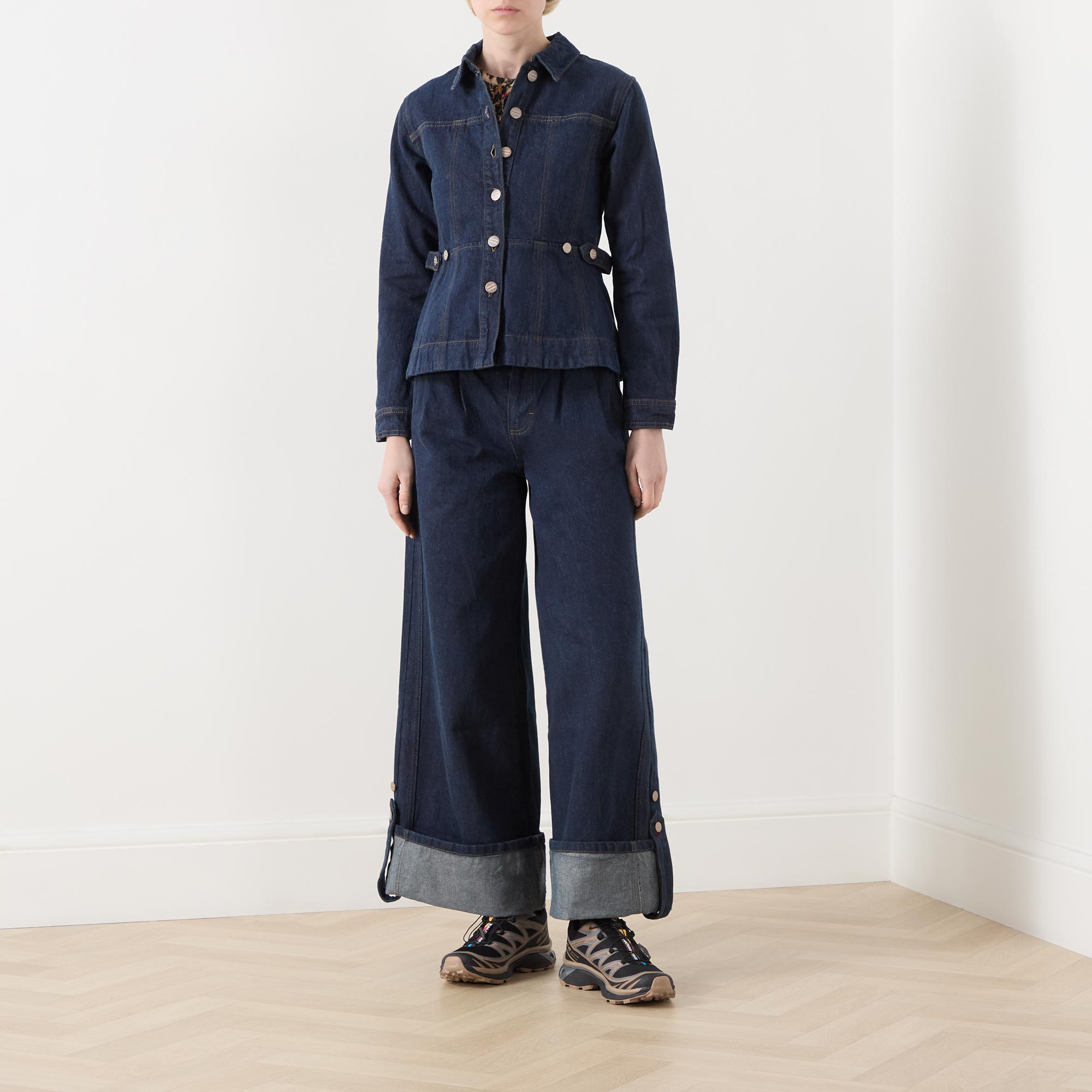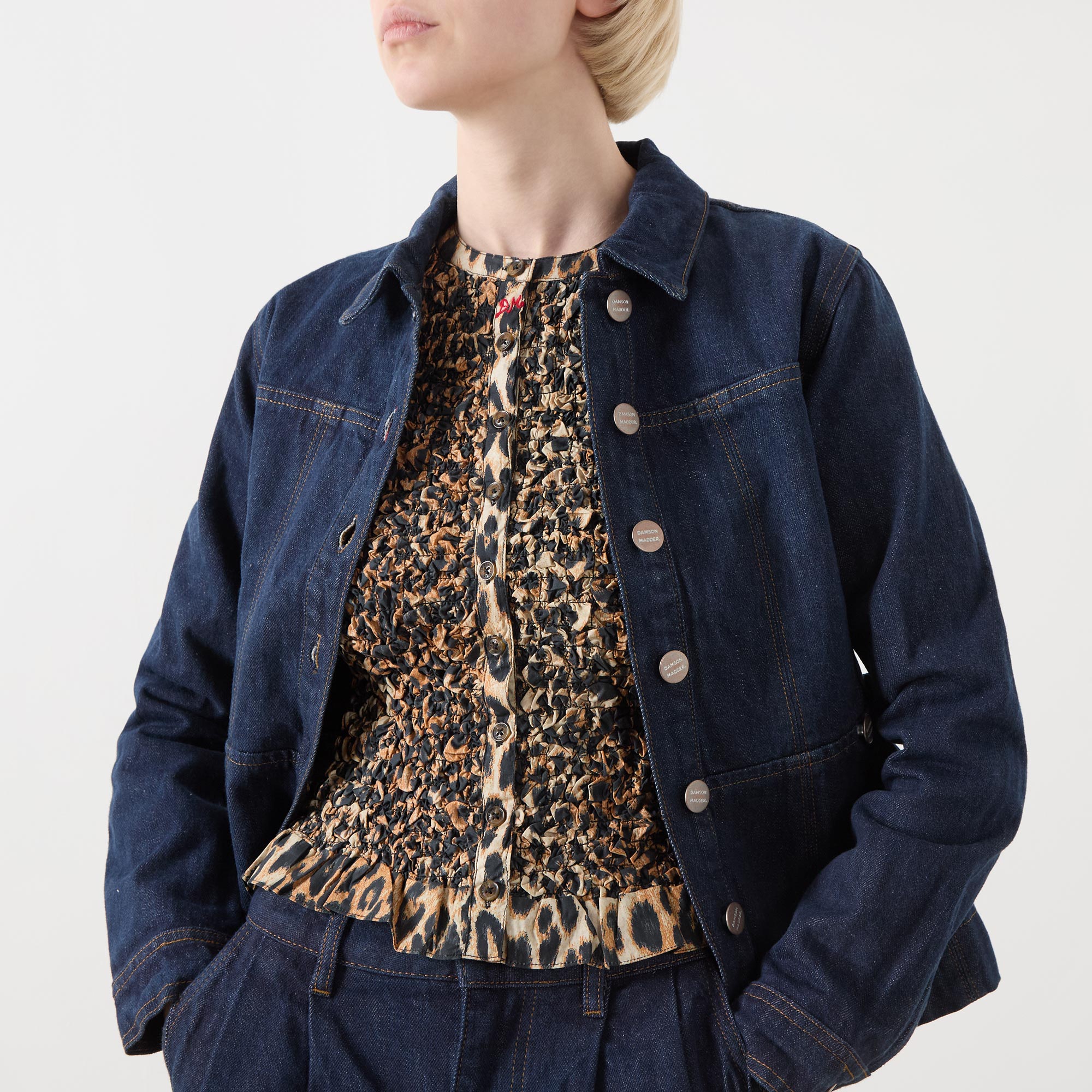 - Point collar, long sleeves, buttoned cuffs, front button fastening, adjustable waist, slight peplum hem, rear logo badge, tobacco stitching, dark wash finish