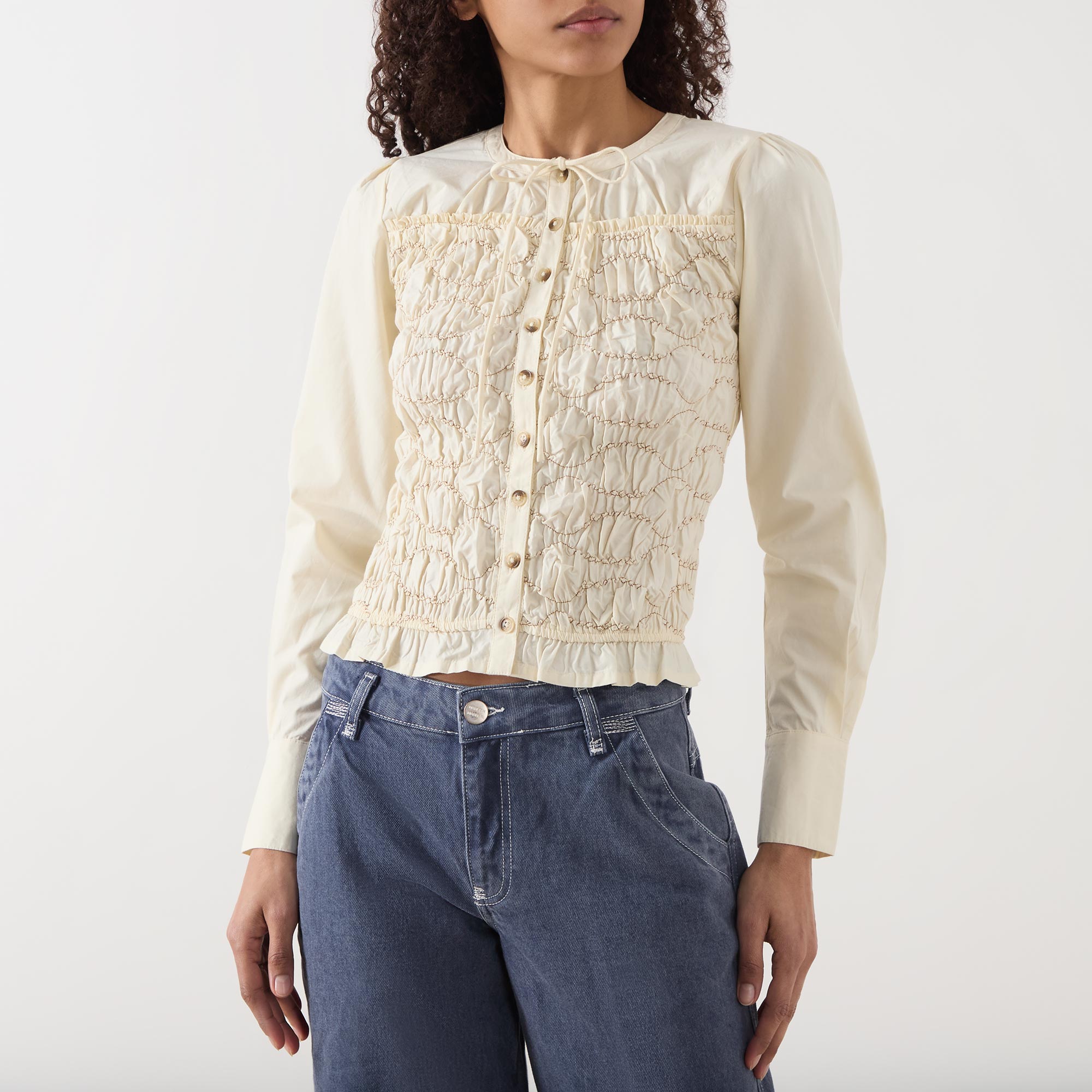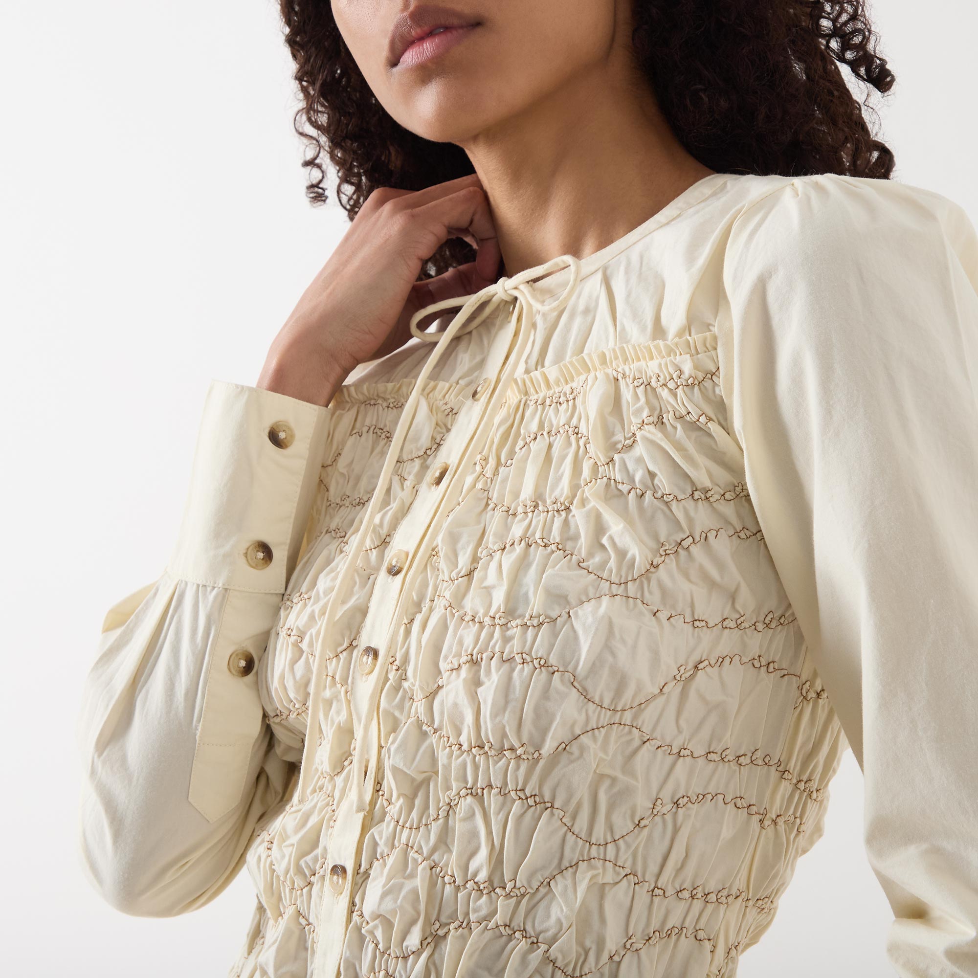 - Round neckline, long blouson-style sleeves, smocked front panel, button fastening, self-tie adjustable neck, buttoned cuffs, embroidered logo detail