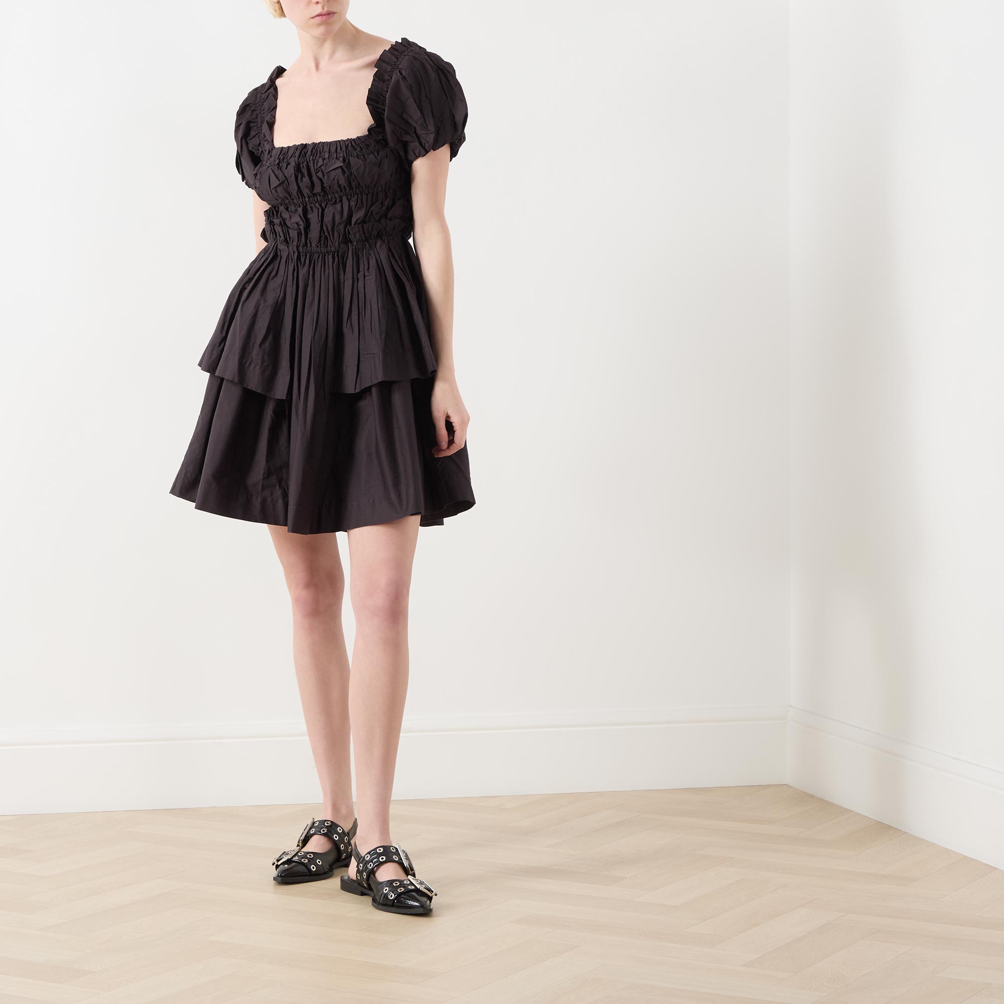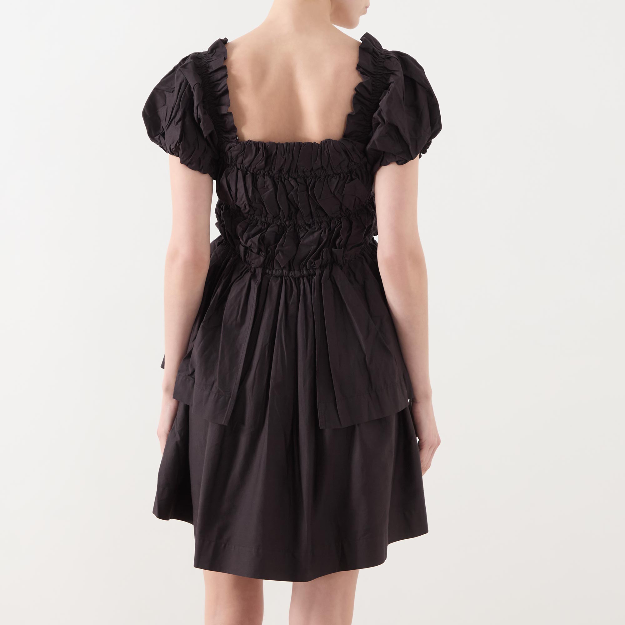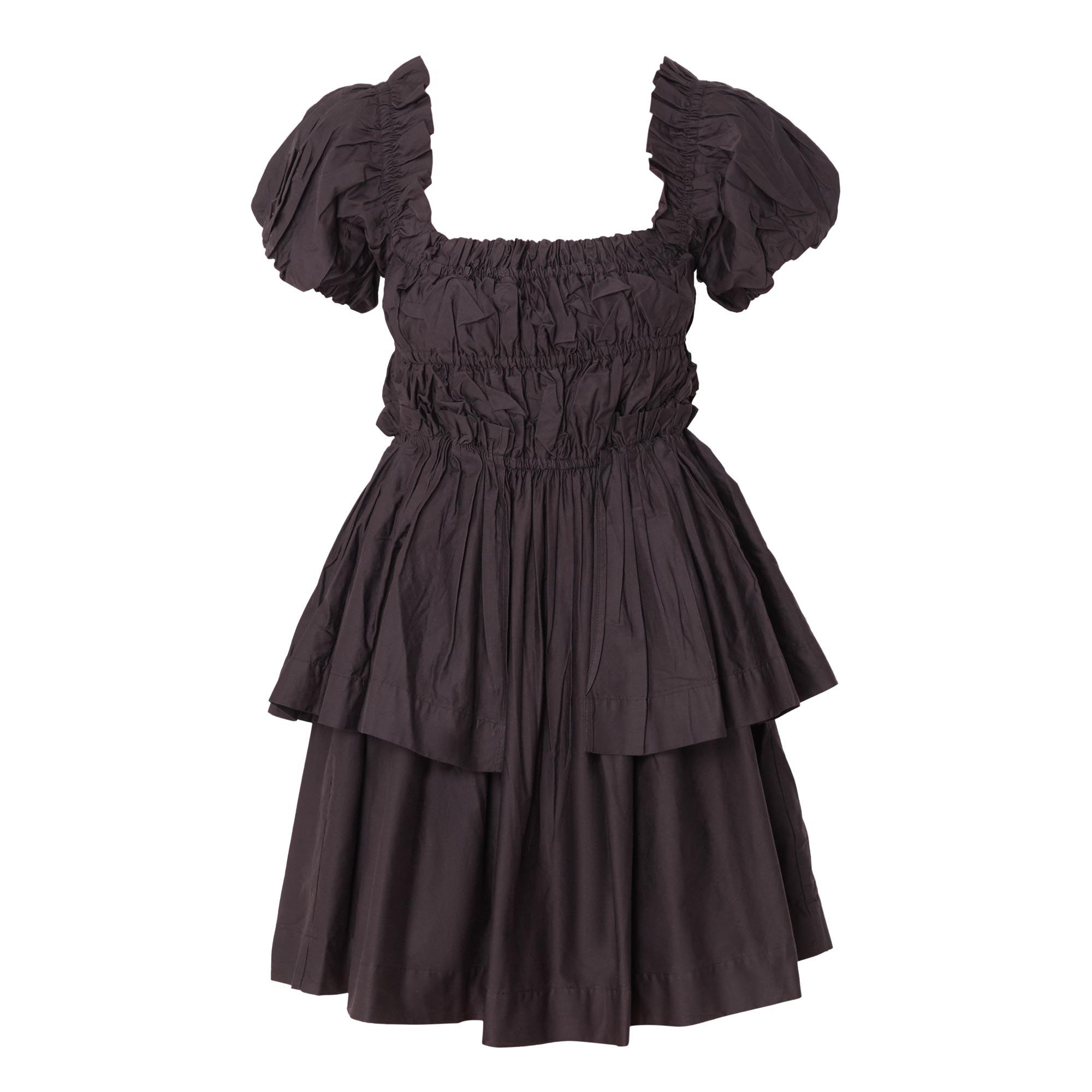 - Square neckline, short puff sleeves, elasticated ruched bodice, tiered skirt, ruched design, mini length