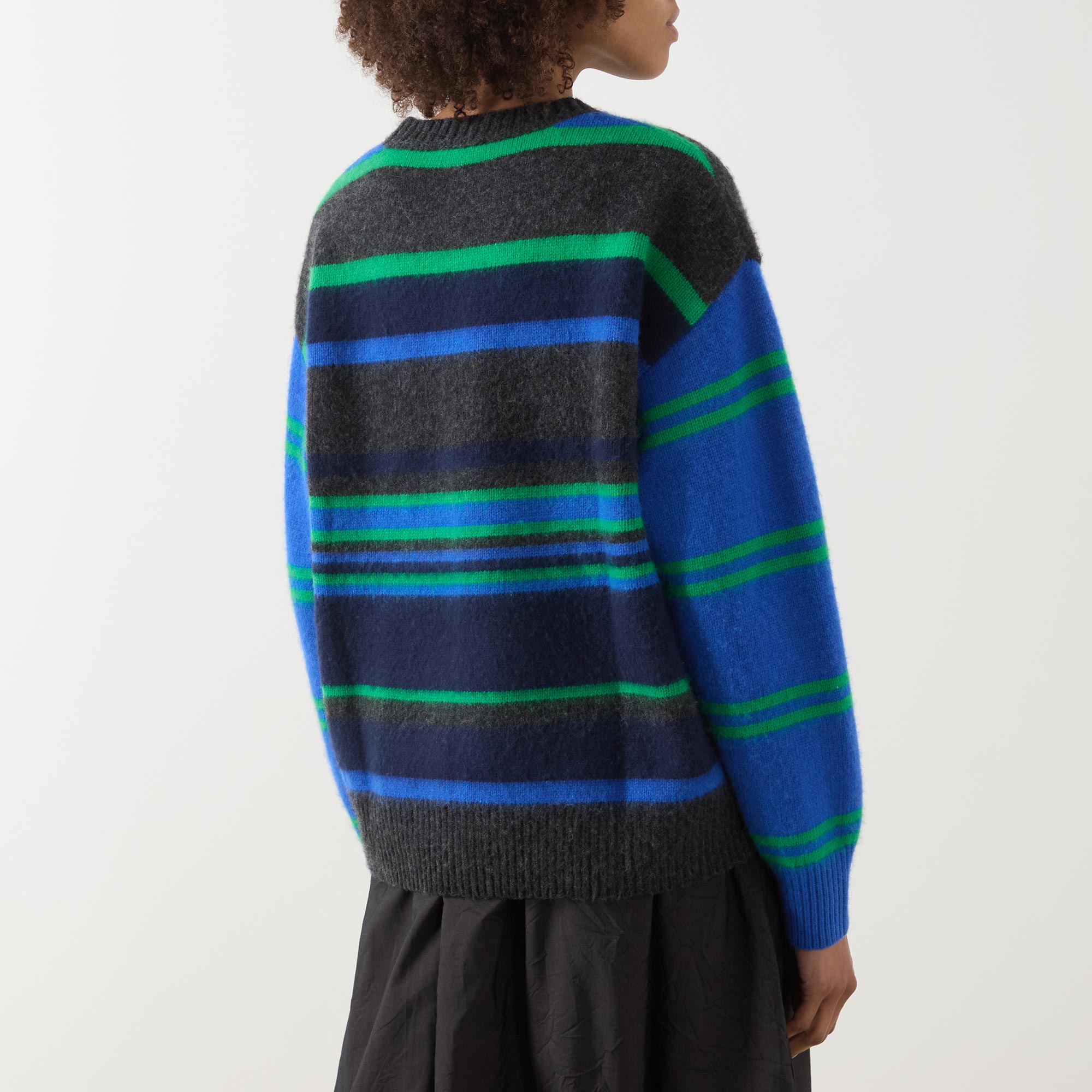 - Crew neckline, long sleeves, dropped shoulders, striped pattern, logo embroidery, ribbed trims, pullover style, knitted finish
