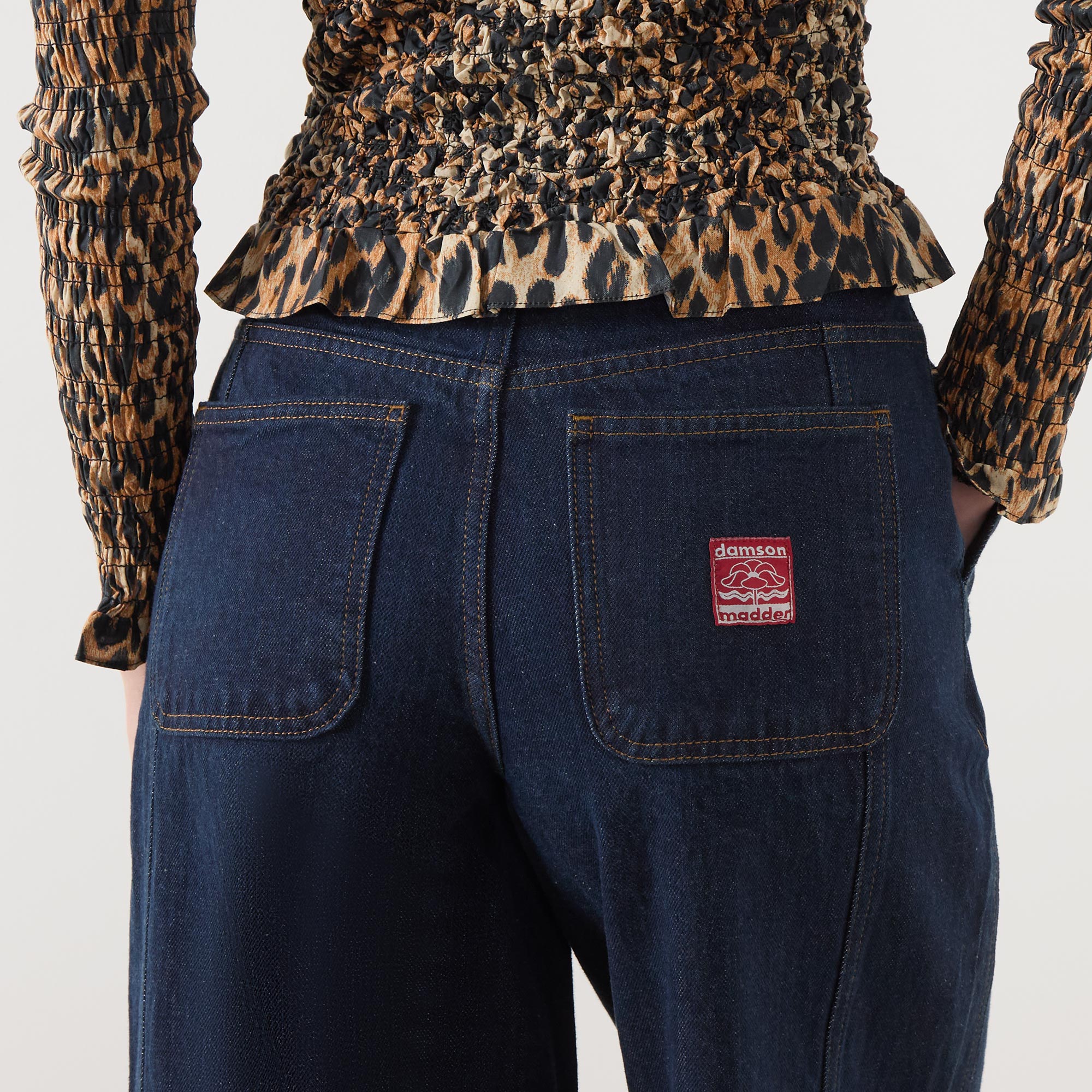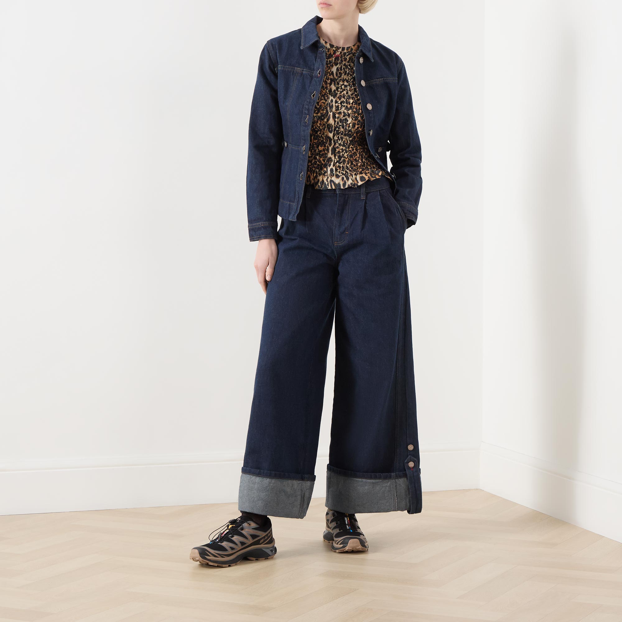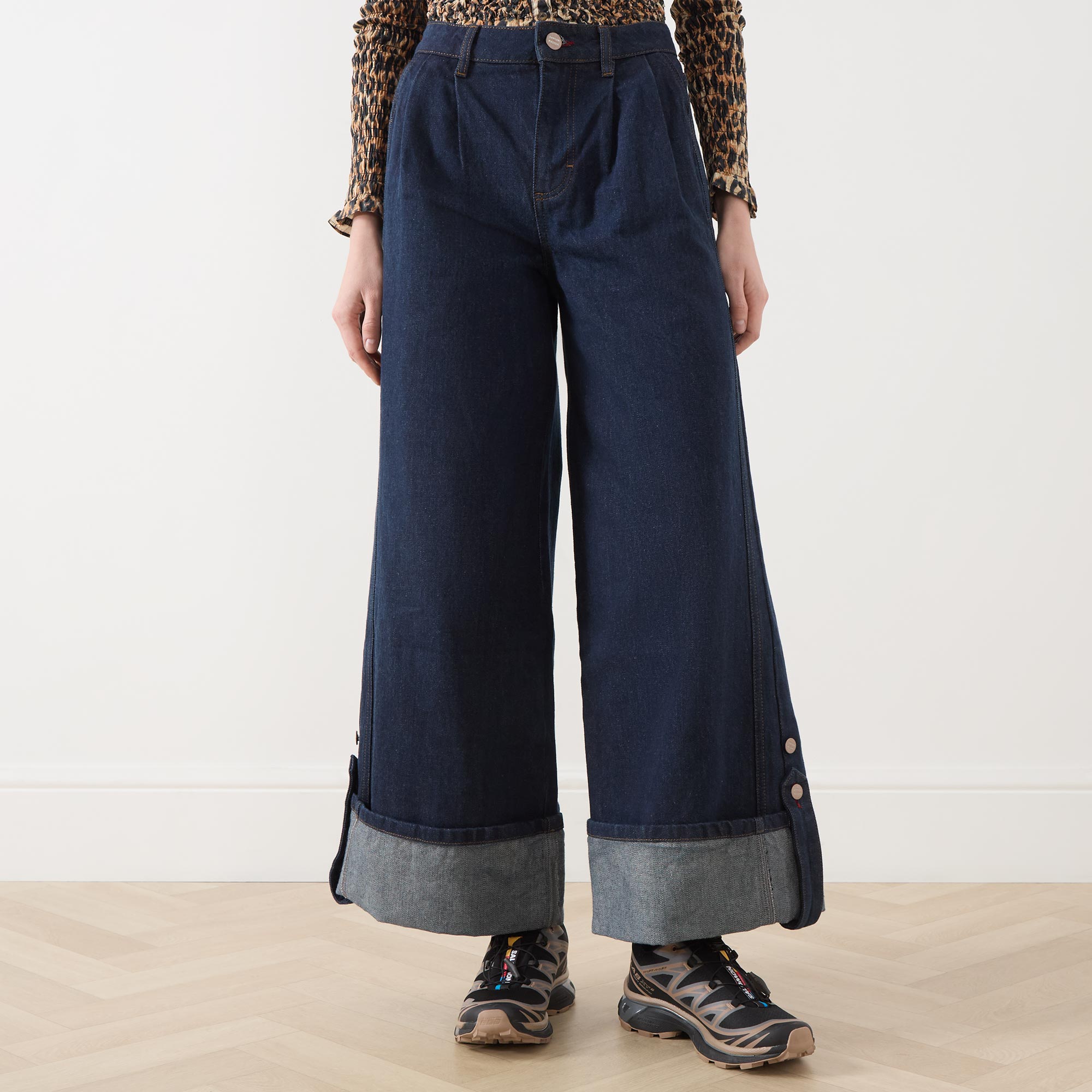 - Mid rise, wide leg, cropped length, belt loops, concealed fly and button fastening, front pleats, two side entry pockets, two rear patch pockets, turn up hems with button fastenings, logo badge, tobacco stitching, dark wash finish