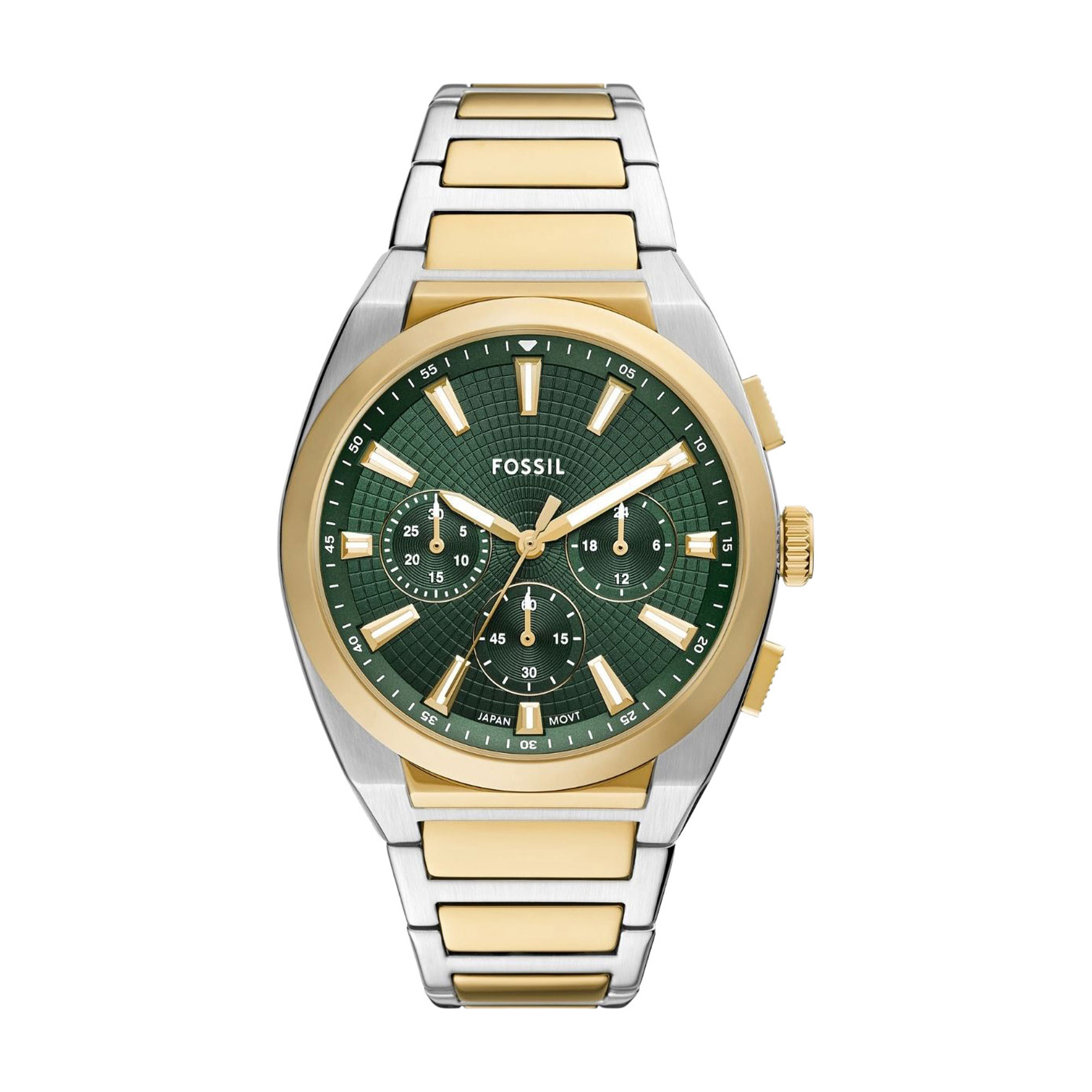 Exuding effortless style, the Everett Chronograph by Fossil. This sporty watch balances casual cool with refined sophistication. The sunray green dial, encased in a 44 mm round two-tone stainless steel case, lends a touch of modern inspiration. Functional details like Japanese chronograph quartz movement and a date window ensure this versatile timepiece keeps you on schedule. Slip on this iconic accessory and take on whatever comes your way.