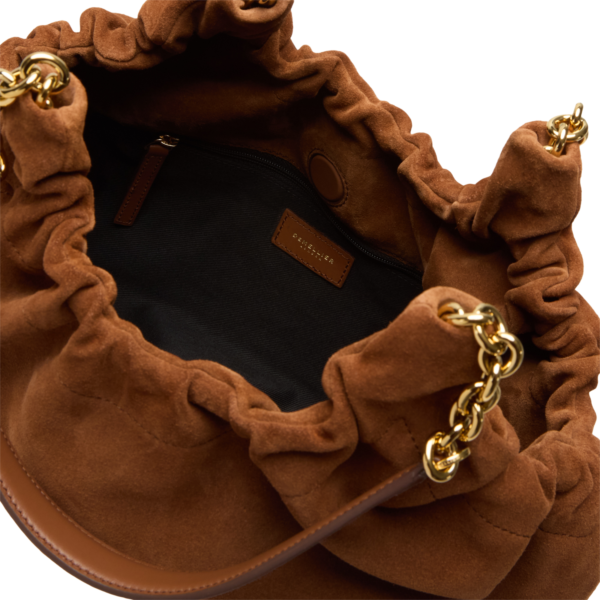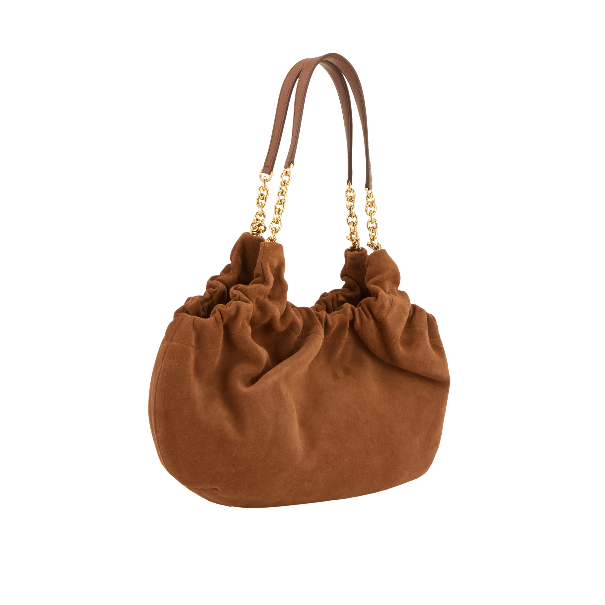 - Chain carry handles with shoulder guard detailing, ruched opening, magnetic dot fastening, slouched silhouette, foil embossed logo, gold-tone hardware, soft suede finish