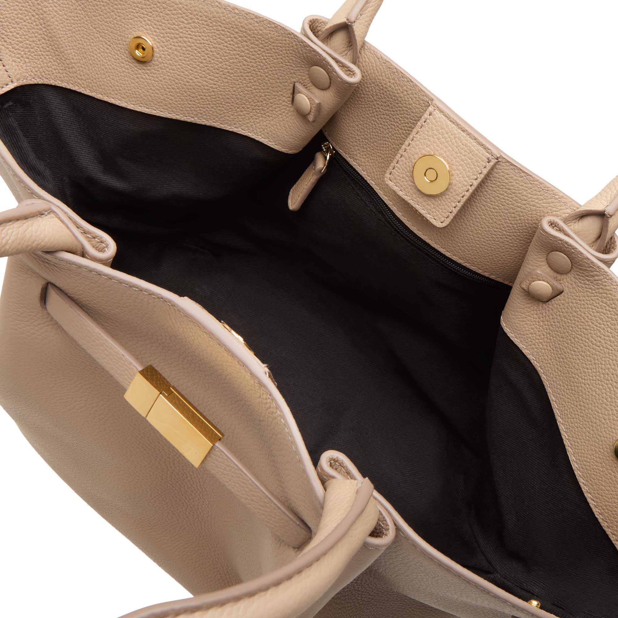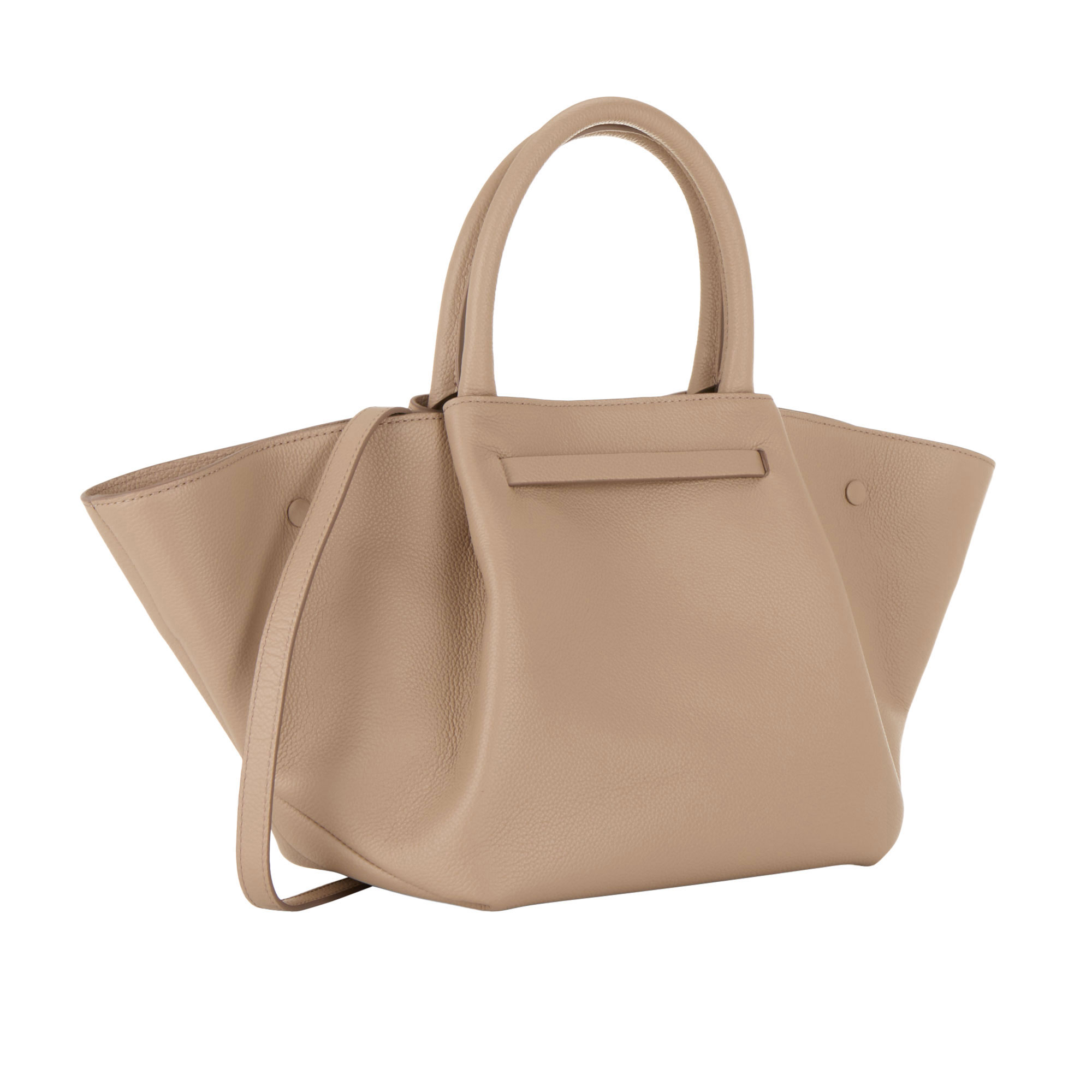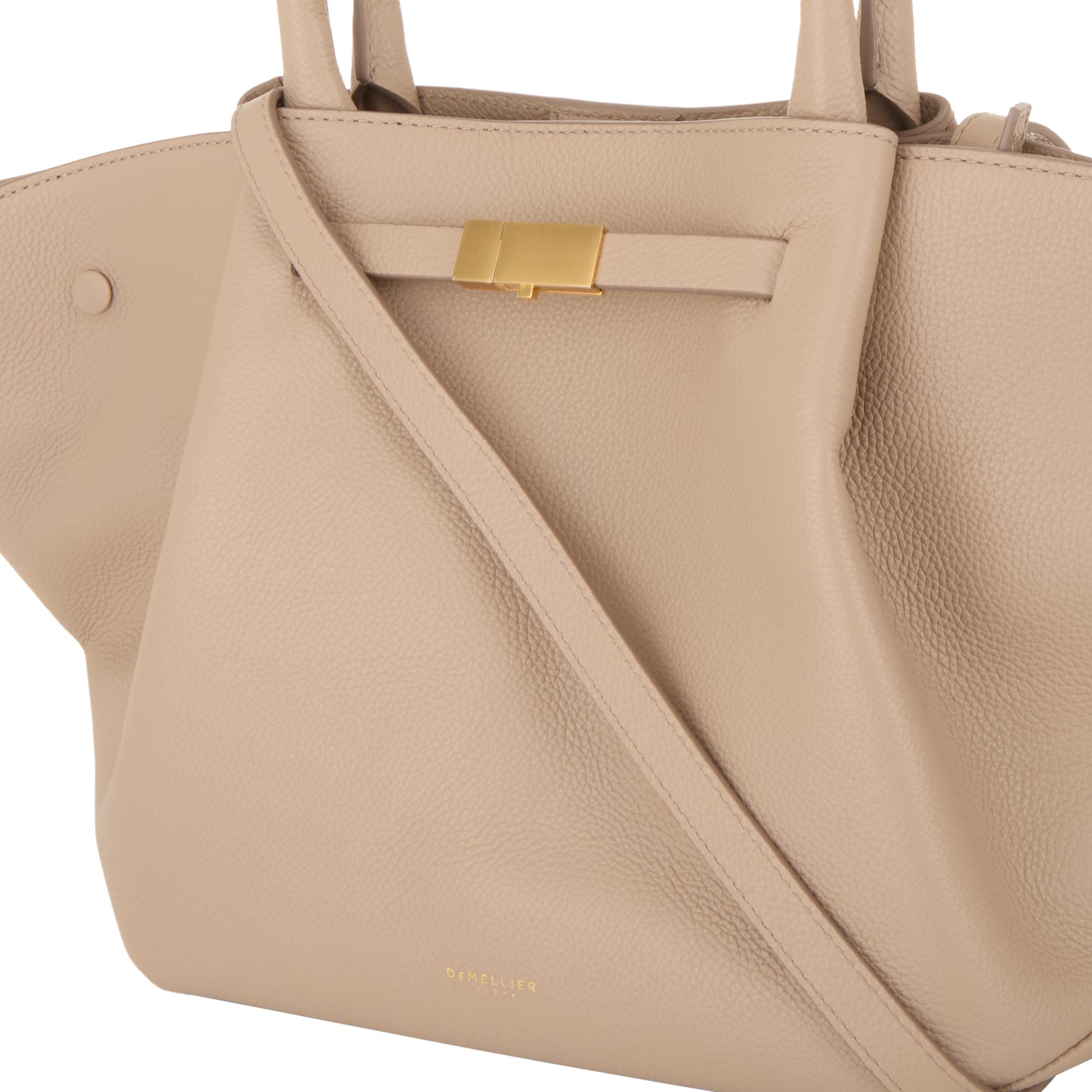 - Tubular top handles, central internal magnetic fastening, triangular folds on each side, metal foot studs, gold-tone hardware, contrast stitching, logo detail, grained leather finish