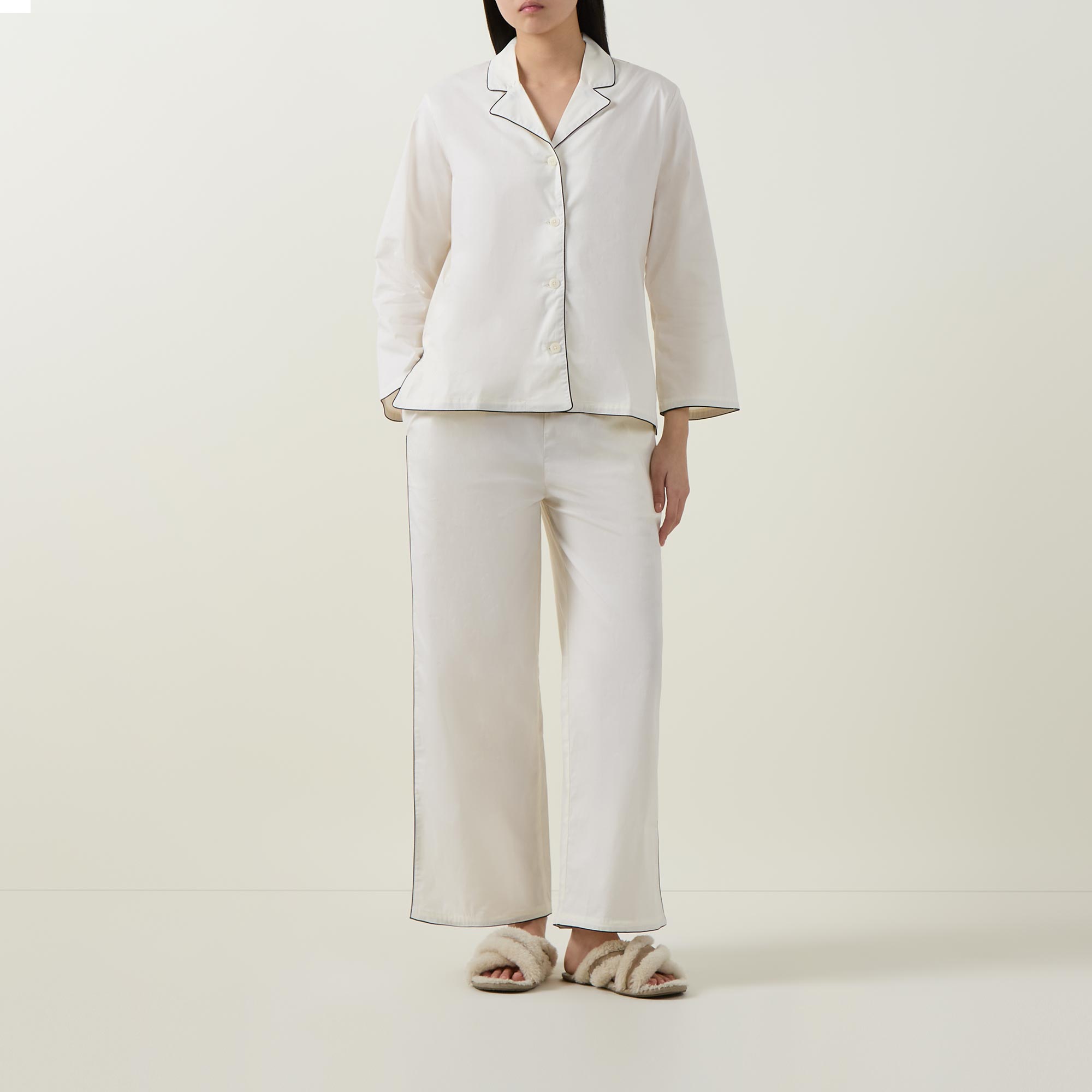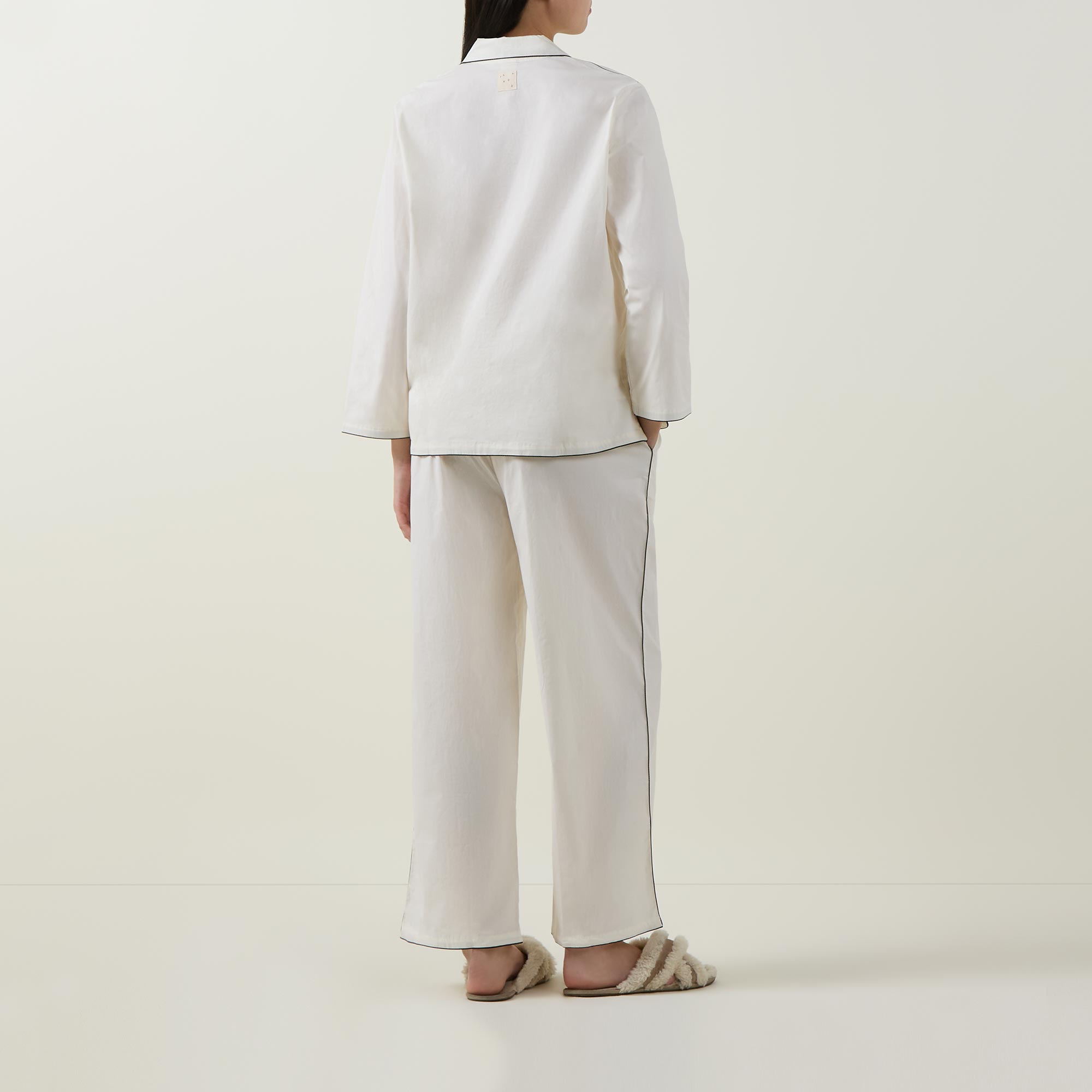 • Top: Notched lapel collar, three-quarter length sleeves, front button fastening, straight hem, contrast piping, smooth finish. Bottoms: Straight leg, elasticated waistband, logo patch, two side in-seam pockets, clean hems, contrast piping, smooth finish