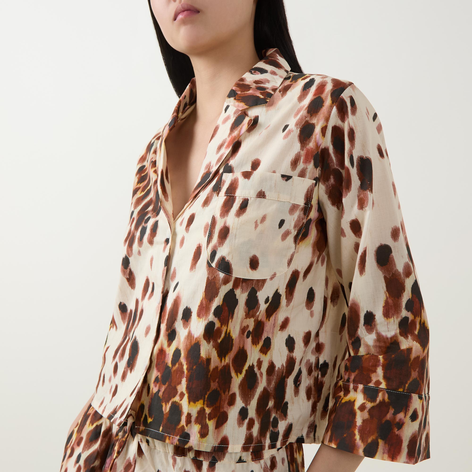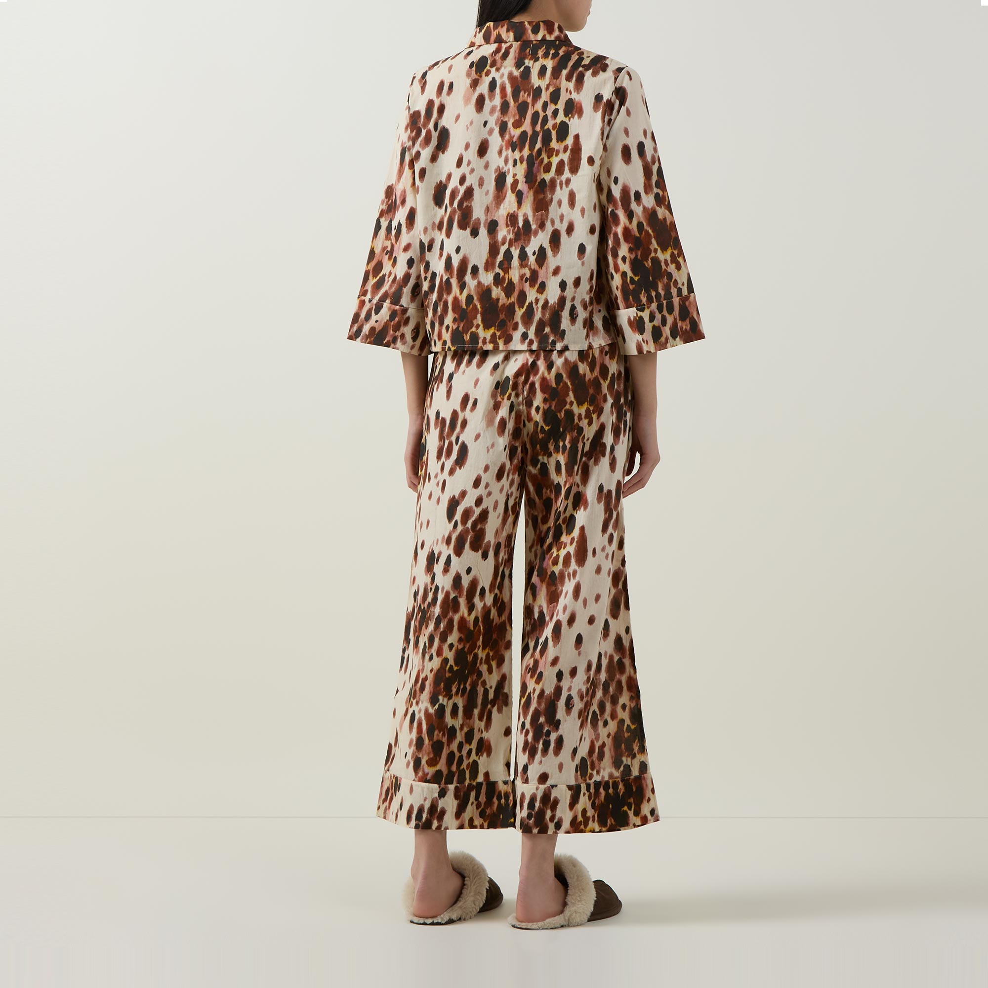 - Top: Notched lapel collar, three-quarter length sleeves, one chest patch pocket, front button fastening, straight hem, cropped length, hand-painted leopard print, smooth finish. Bottoms: Wide flared leg, cropped length, elasticated waistband, two side in-seam pockets, clean hems, hand-painted leopard print, smooth finish