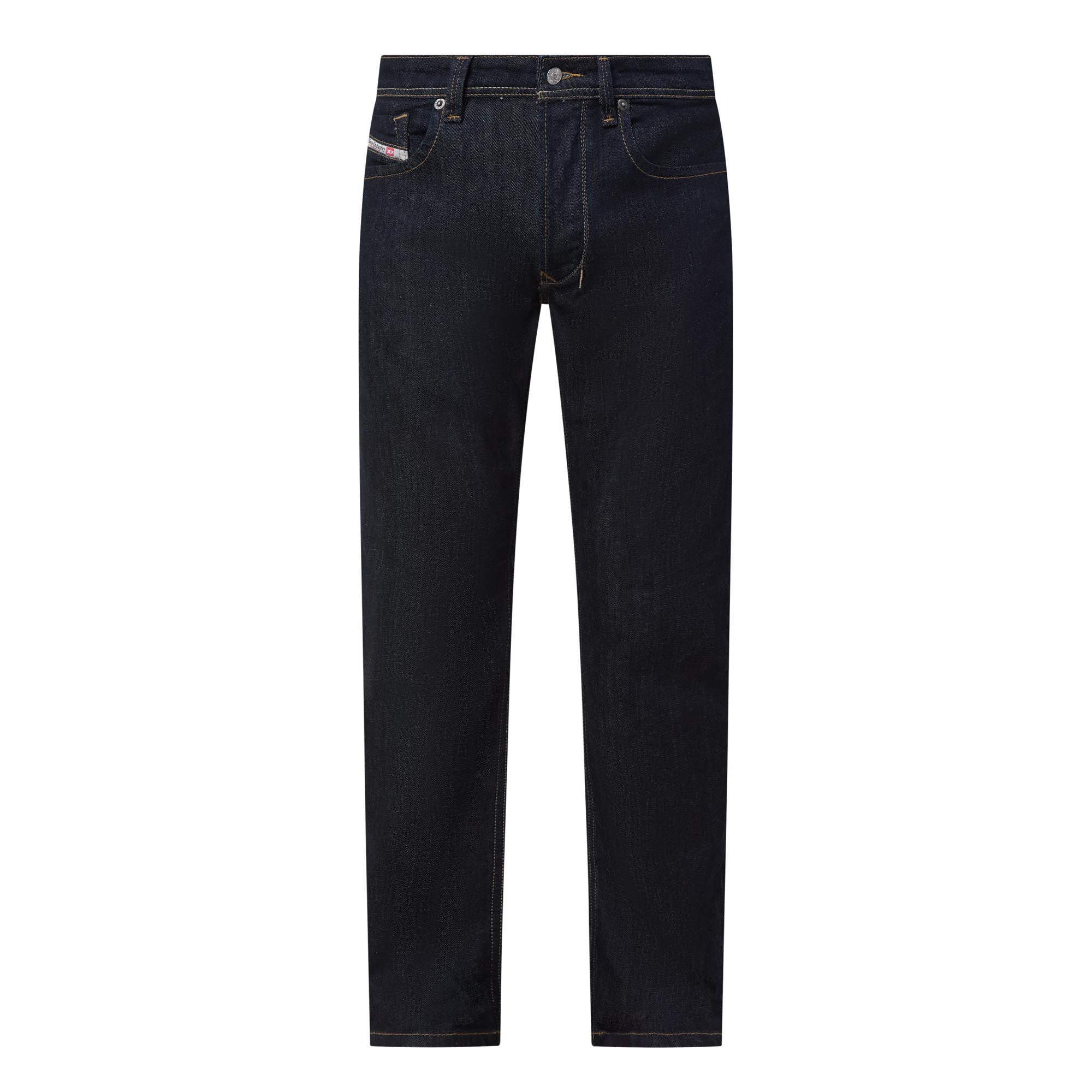 - Mid rise, straight leg, relaxed waist, belt loops, zip and button fastening, five pocket styling, clean hems, logo patch, stitched seams, dark wash finish
