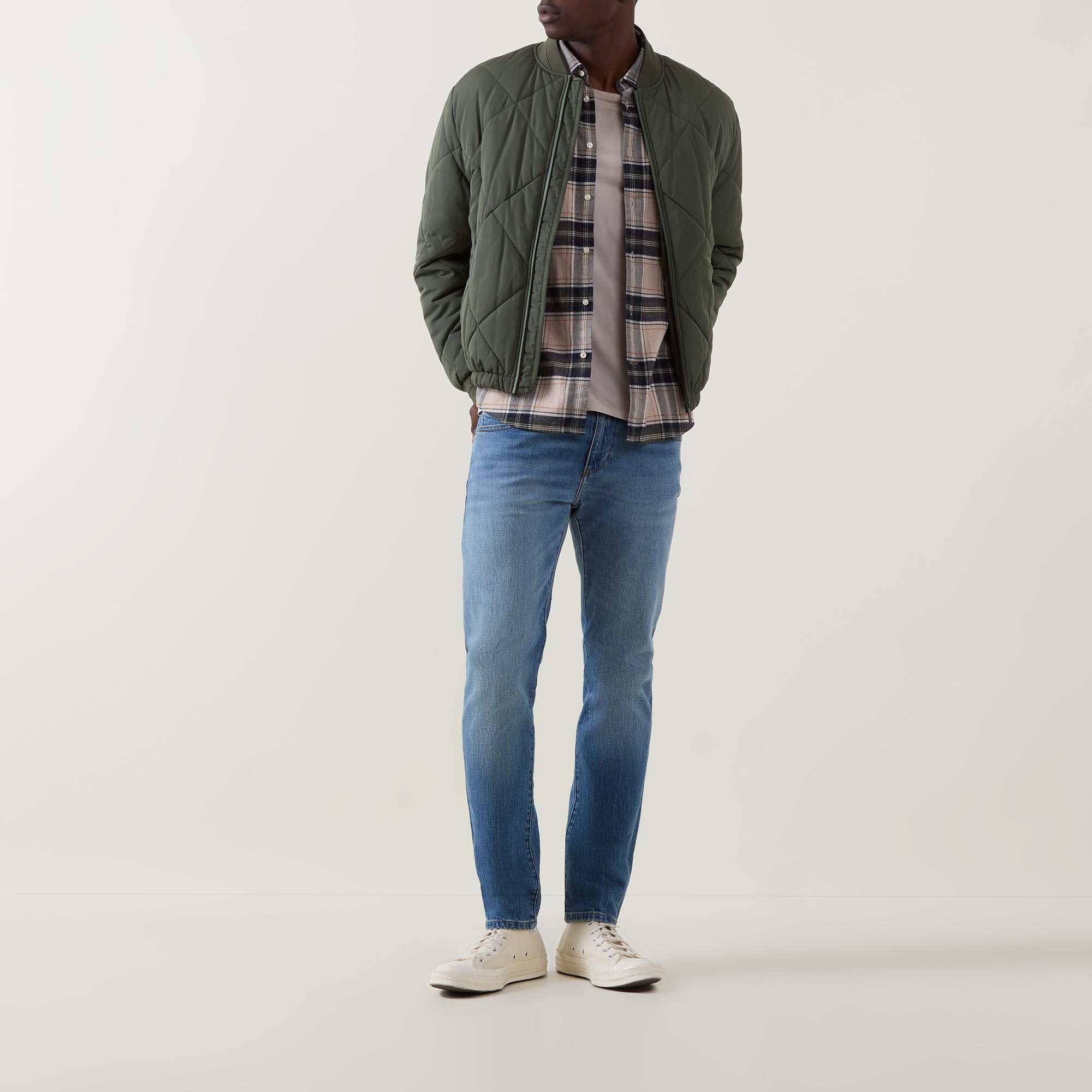 • Mid rise, slim leg, belt loops, zip fly and button fastening, five-pocket design, contrast top stitching, rear logo patch, whiskering and faded patches, light wash finish