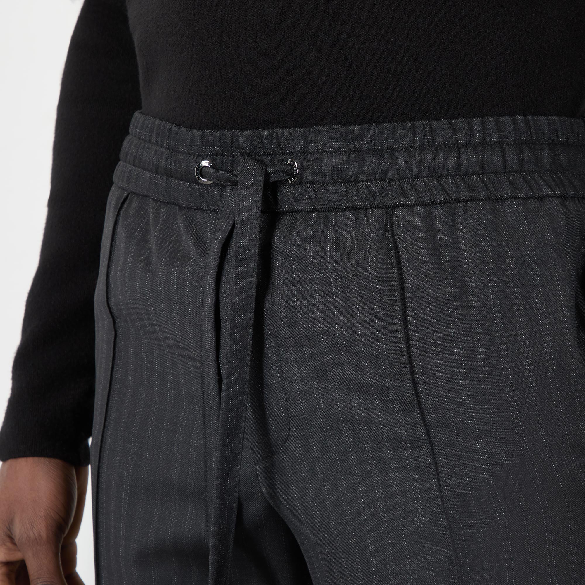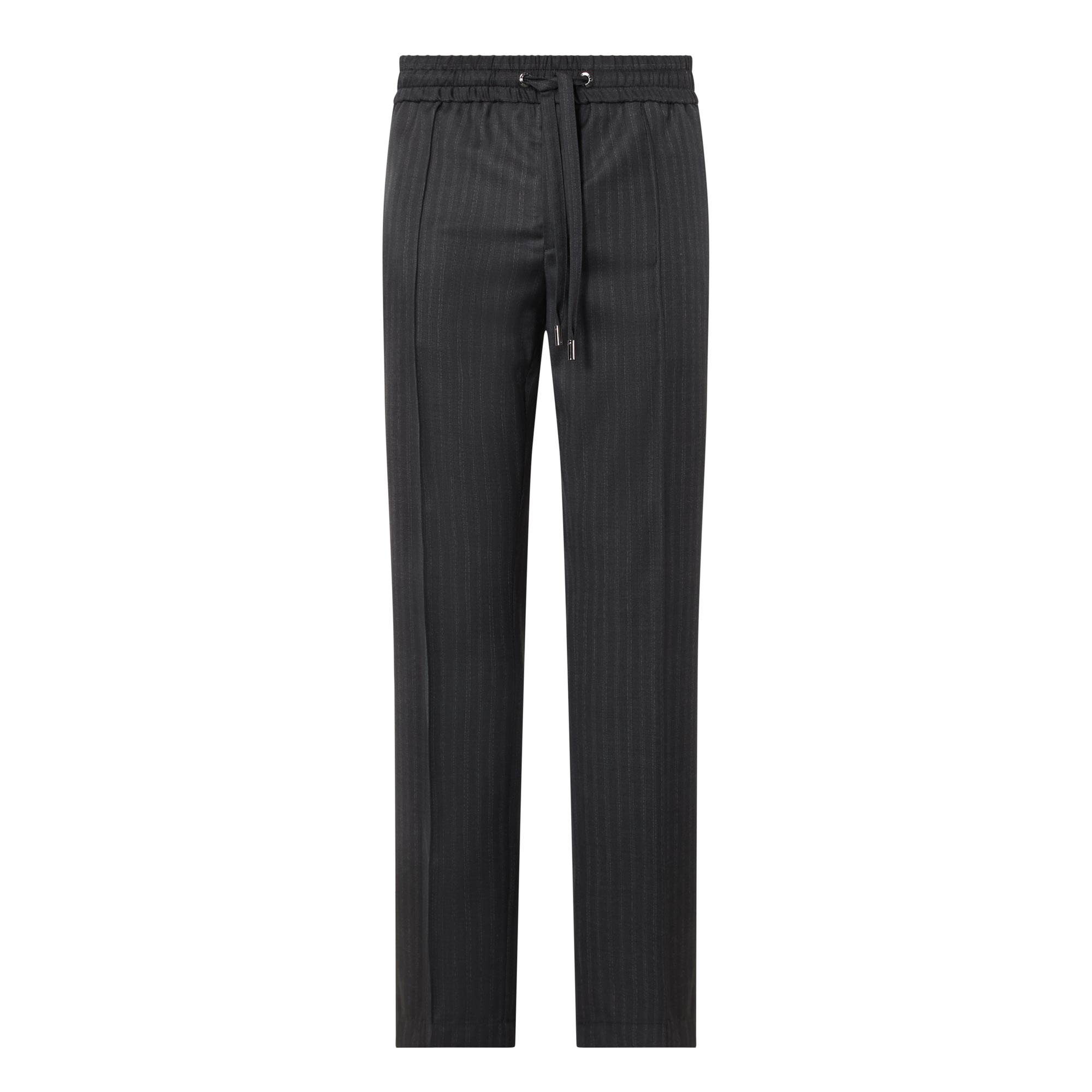 - Mid rise, straight leg, elasticated waistband, adjustable drawstring fastening, two side entry pockets, one rear pocket with zip fastening, clean hems, pressed creases, tonal striped design