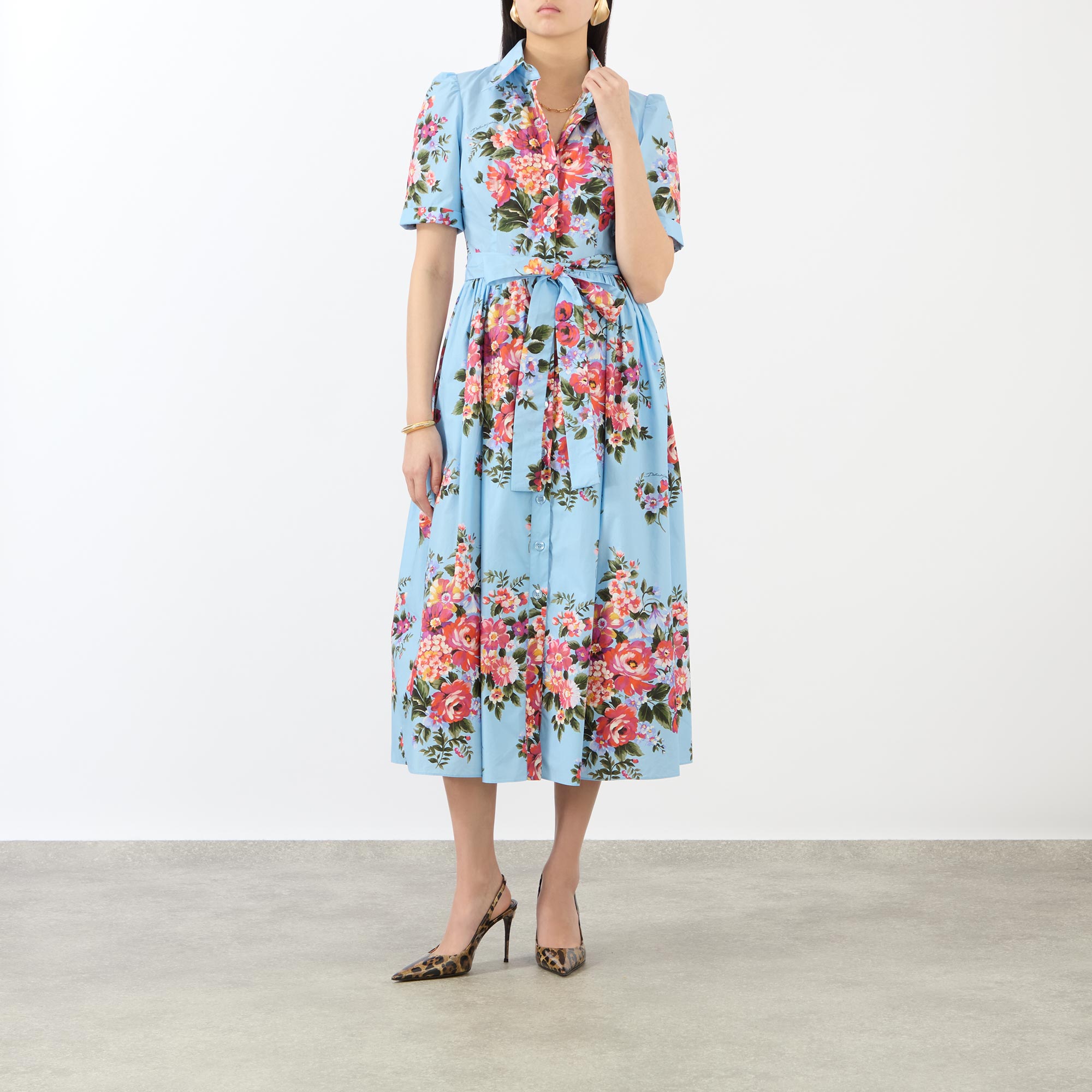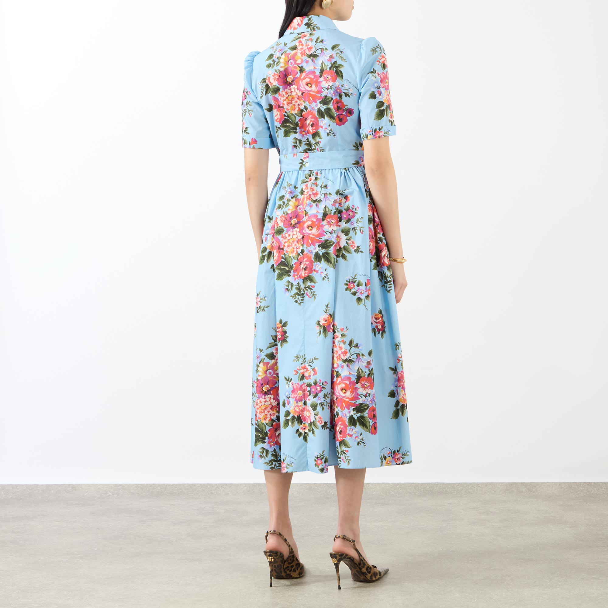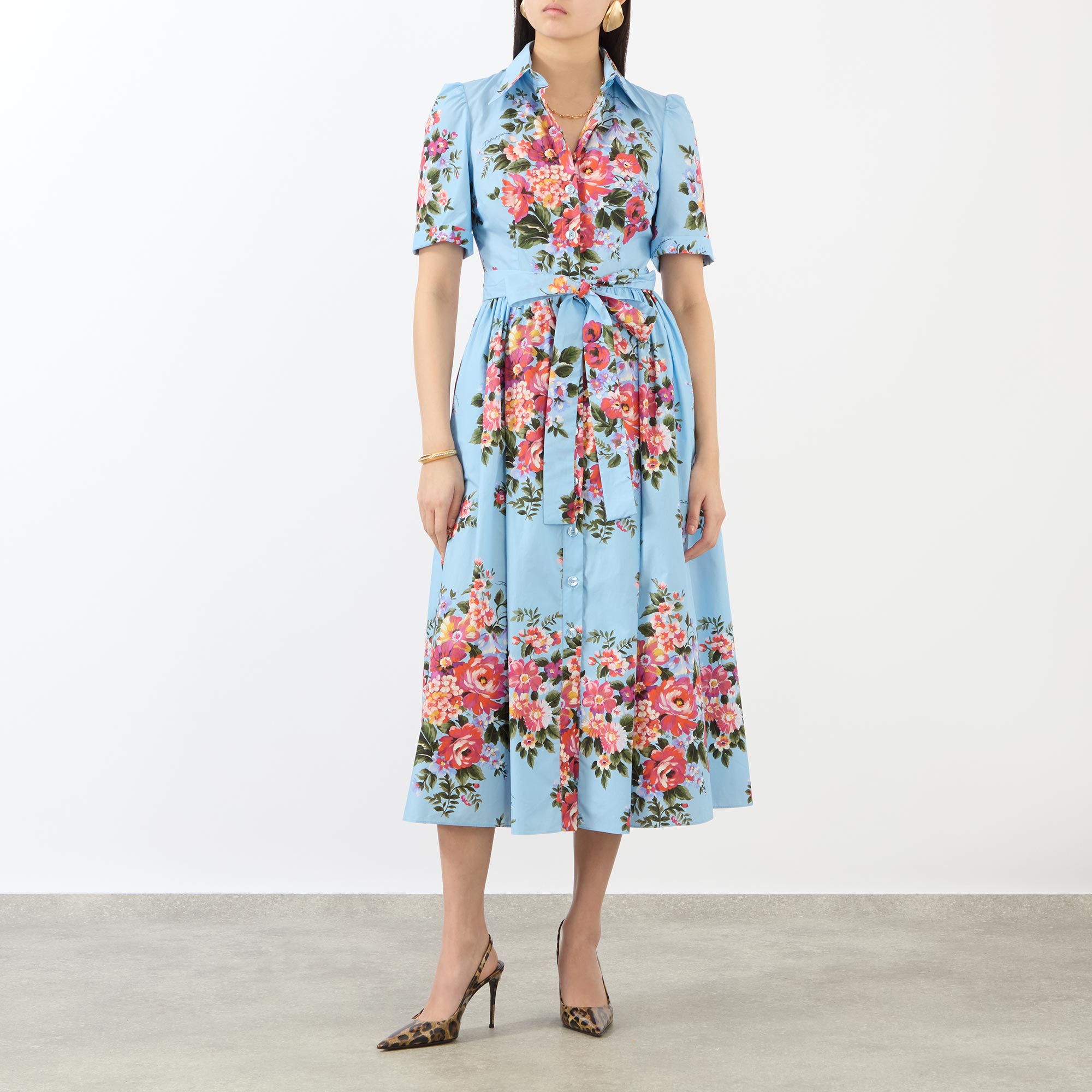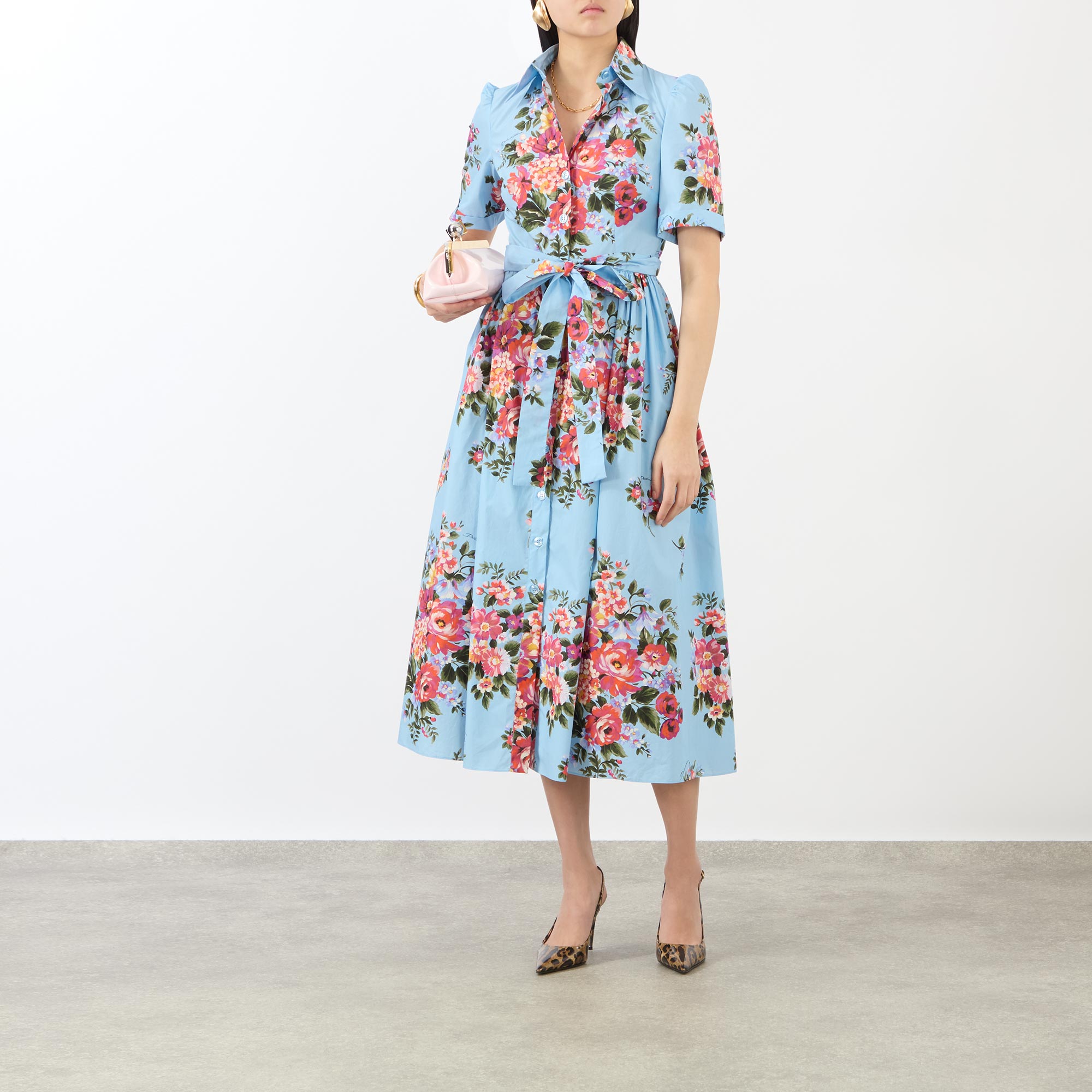 Dolce & Gabbana’s SS26 collection pairs clean cuts with luxurious details, bringing a fresh feel to the season. This shirt dress is crafted from soft, breathable cotton in a vibrant blue, featuring a point collar, short sleeves, and a neat button placket. Finished with a striking floral pattern, it includes discreet in-seam pockets and a waist-cinching belt, flowing into a flared, pleated midi-length silhouette.