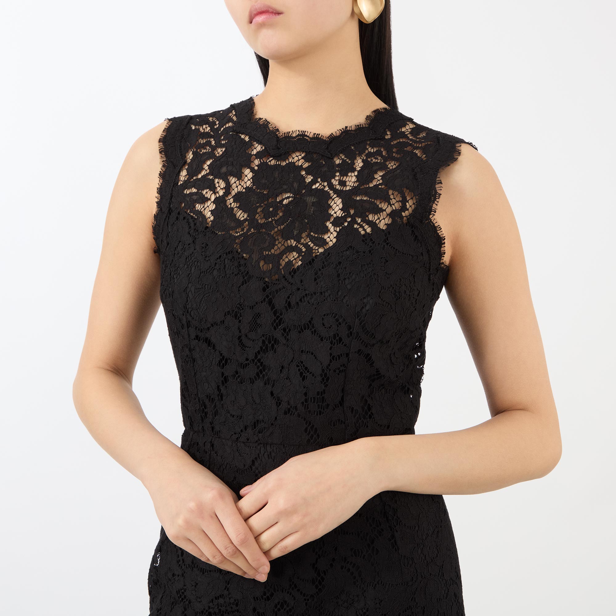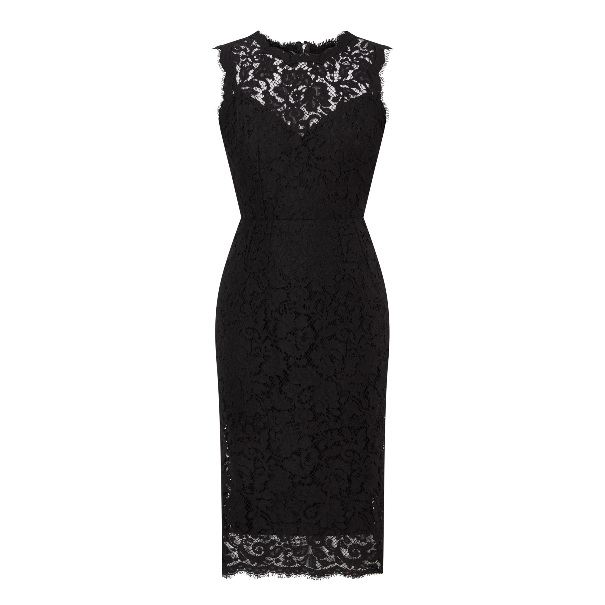 - Sleeveless, round neckline, floral lace design, back zip-fastening closure, scalloped edges, fitted silhouette, rear slit, midi length