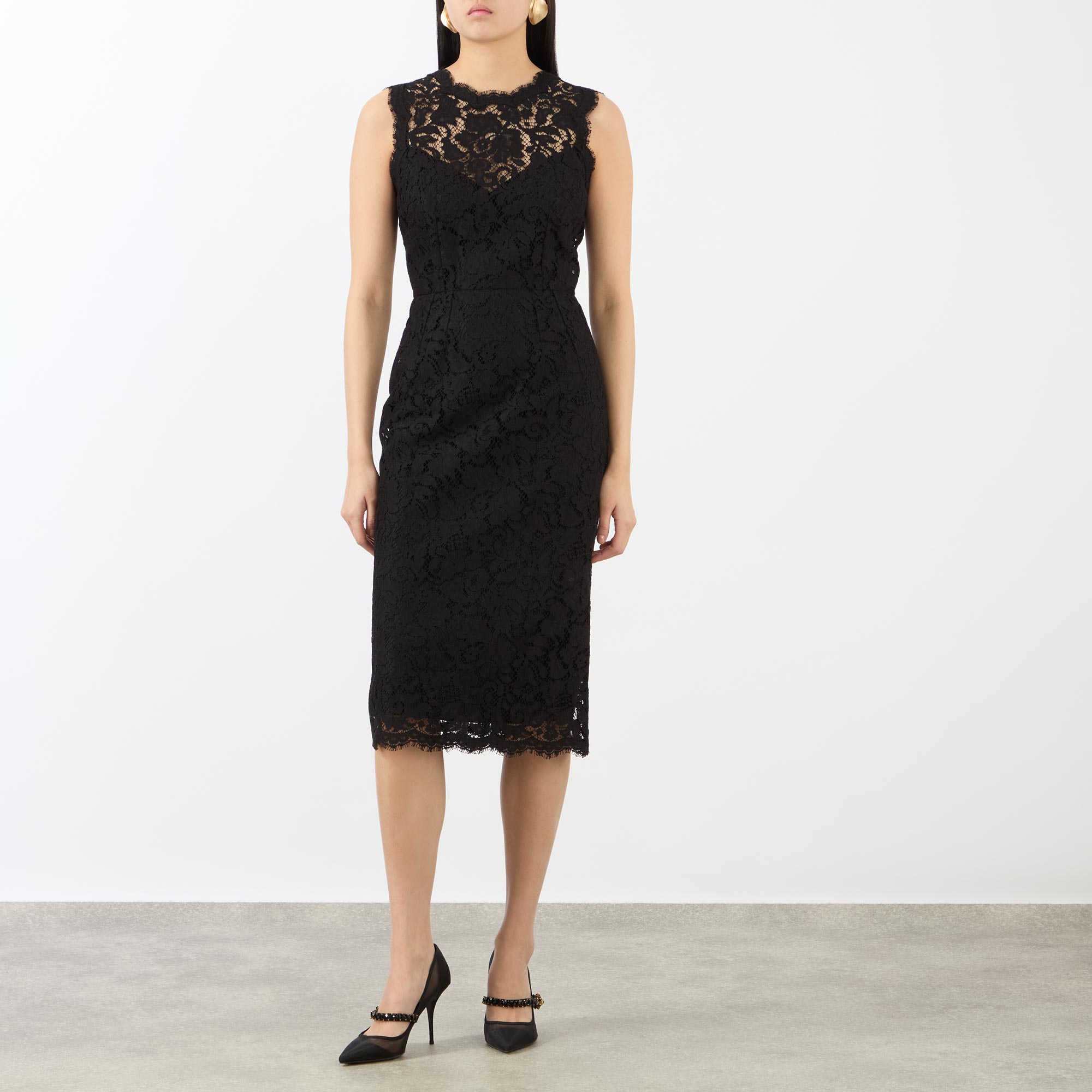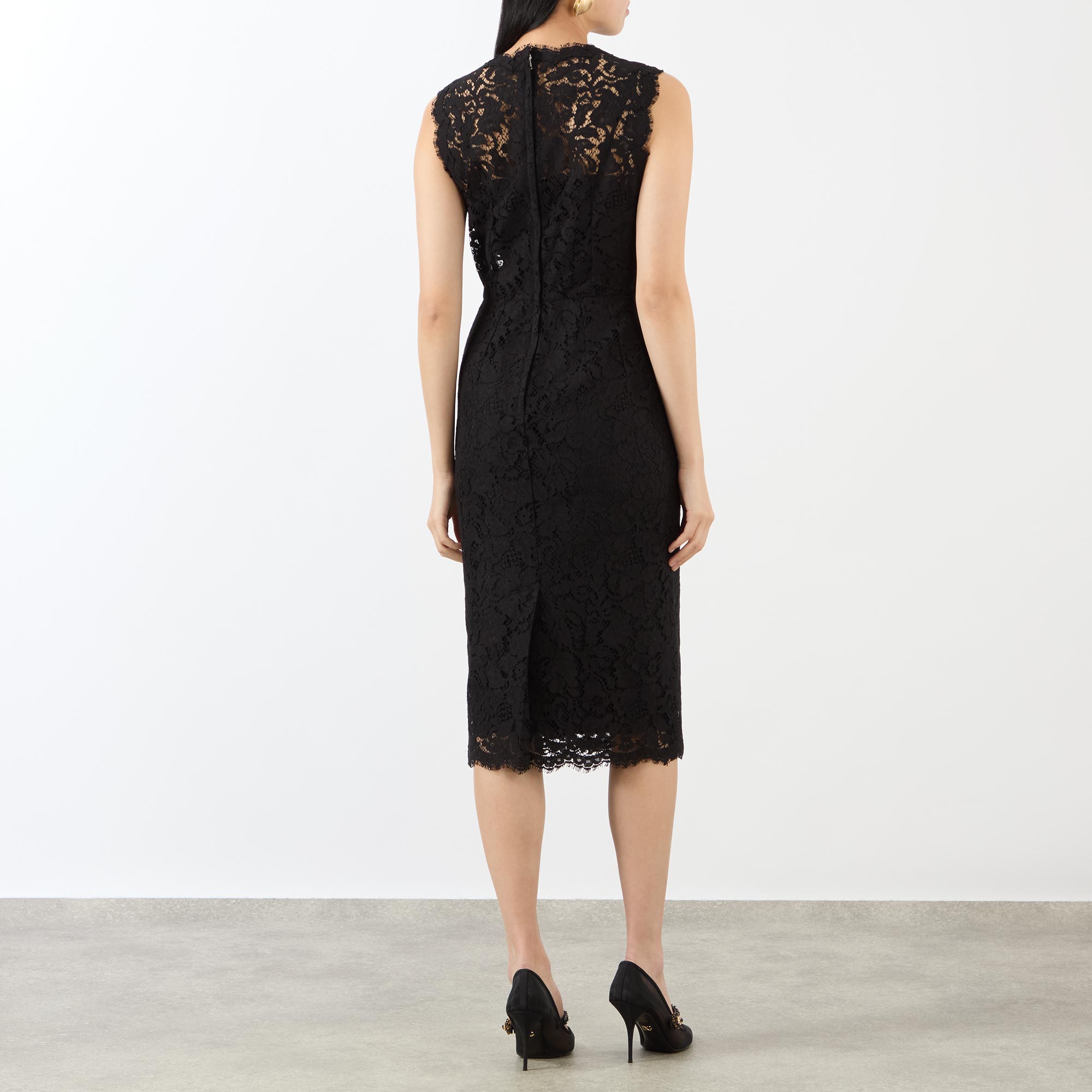 Artistry and precision define Dolce & Gabbana’s SS26 collection, exemplified by this dress. Crafted with delicate floral lace, it features a fitted silhouette secured by a back zip, a sleeveless profile with a round neckline, and an elegant midi-length finish.