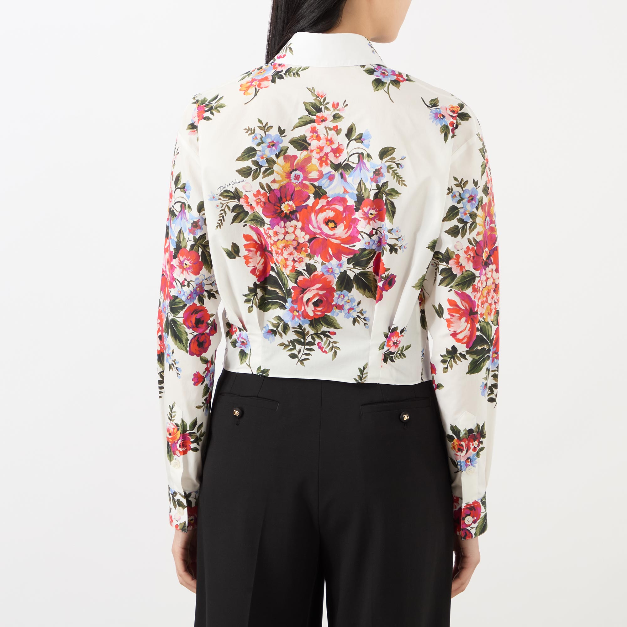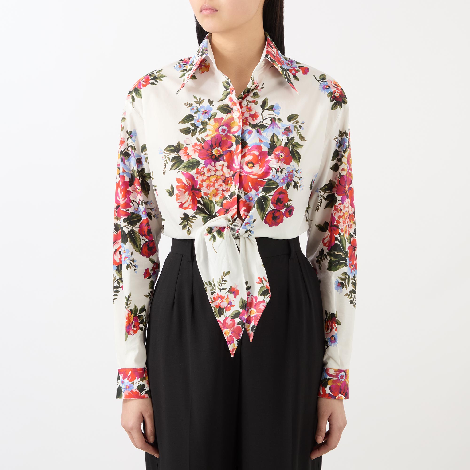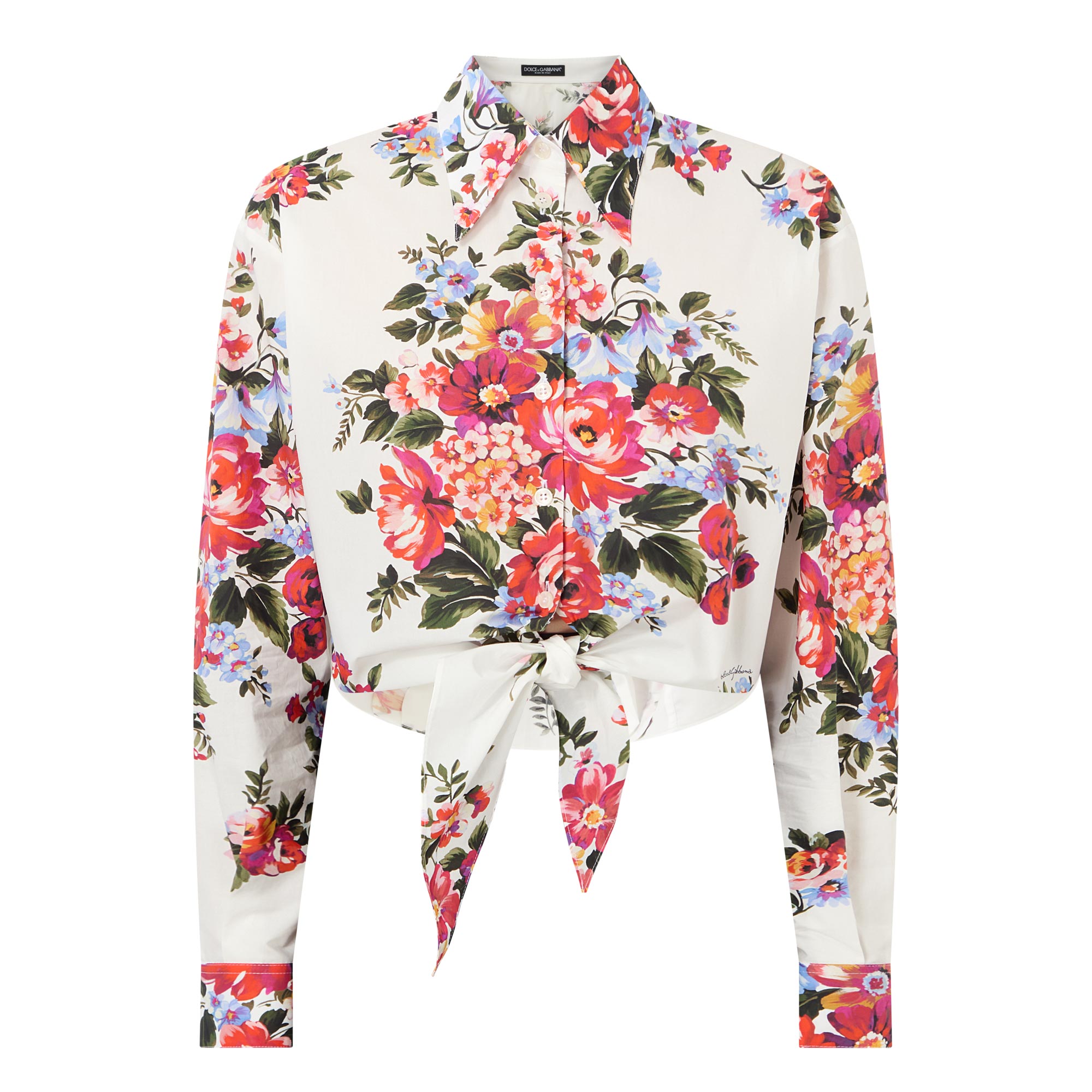 Dolce & Gabbana's SS26 collection interweaves relaxed silhouettes with handcrafted bouquet prints, bringing a vivid floral narrative to this blouse. Spun from pure cotton and cut to a cropped length, it's framed by a point collar and features long sleeves, while securing with a front placket and boasting an additional tie-front fastening for versatile styling.