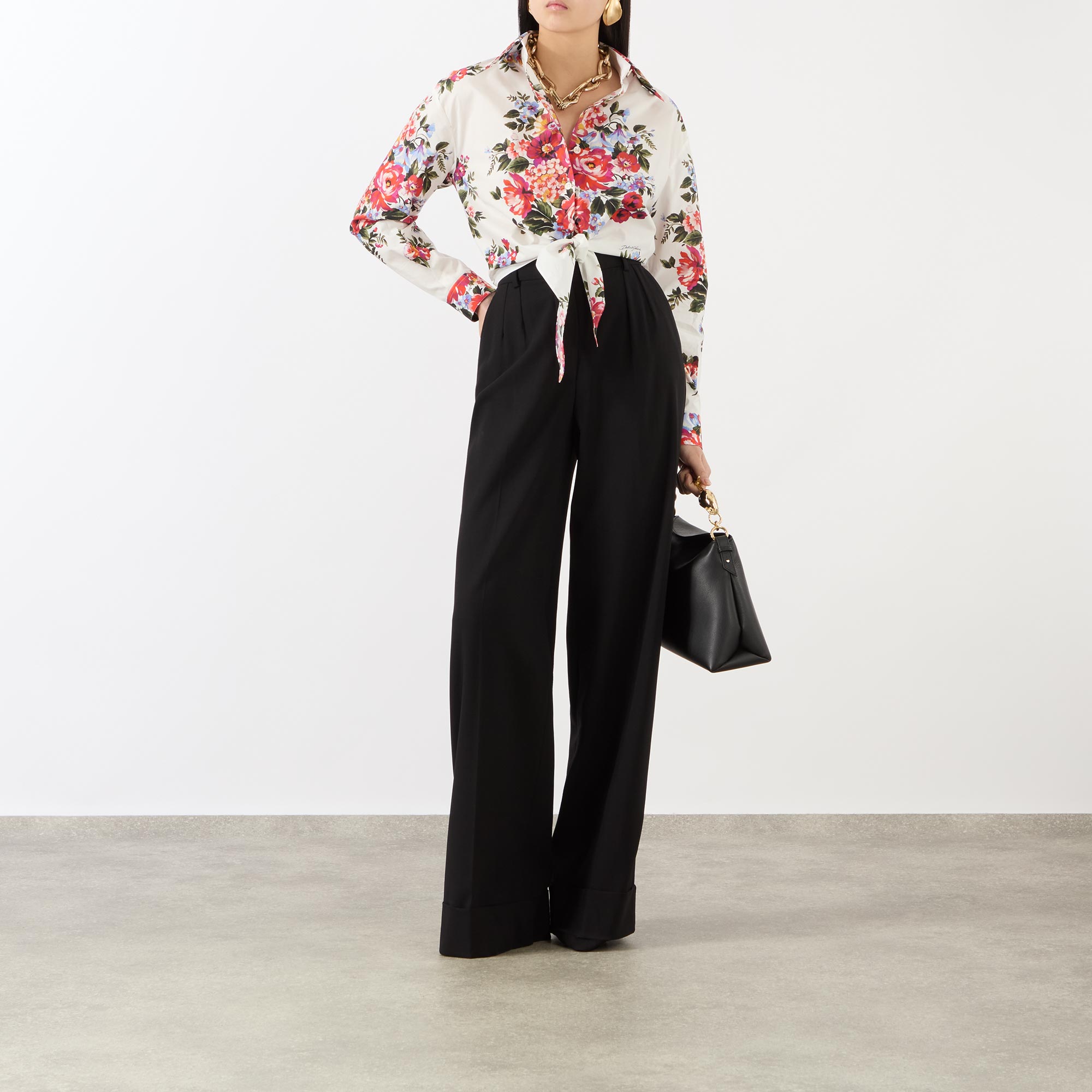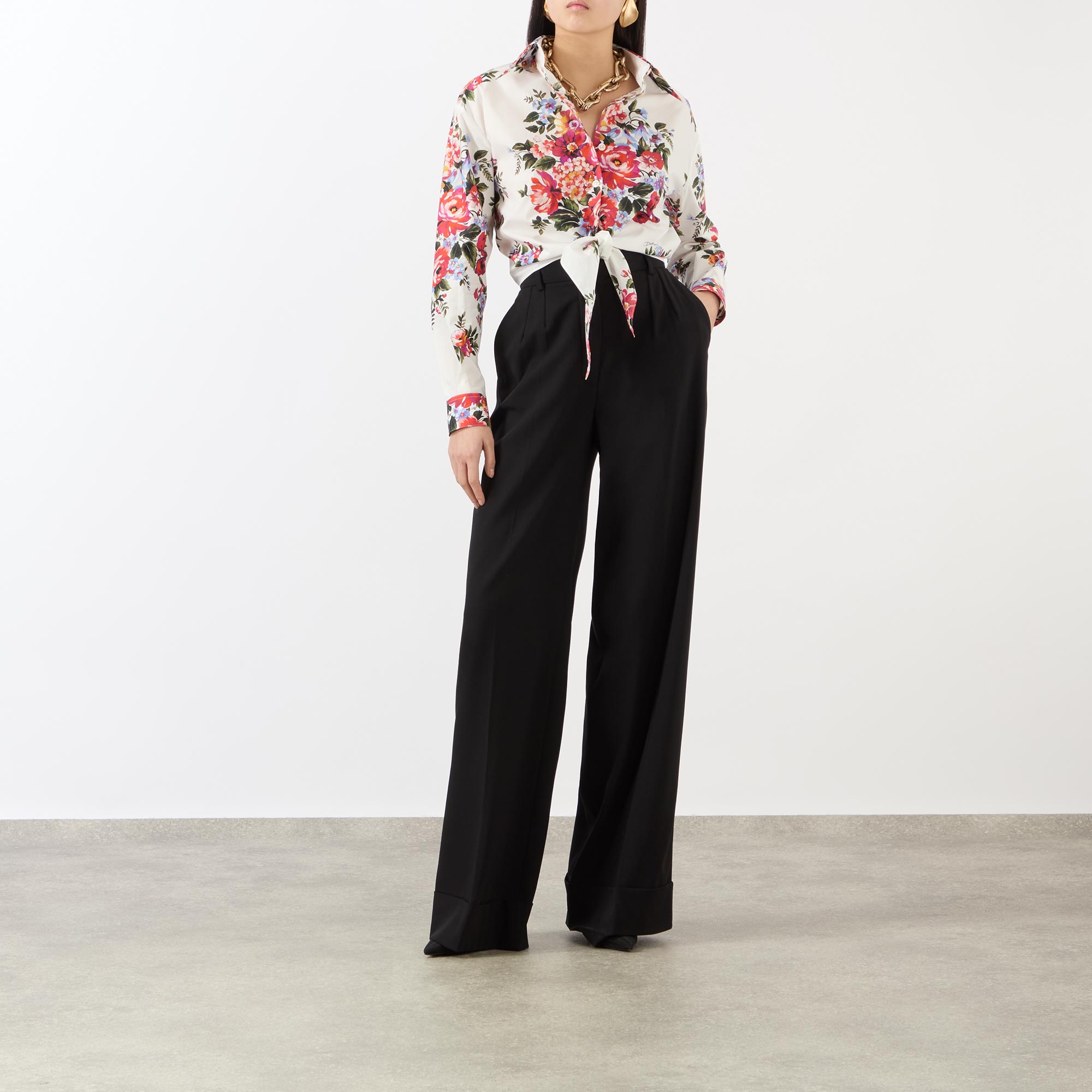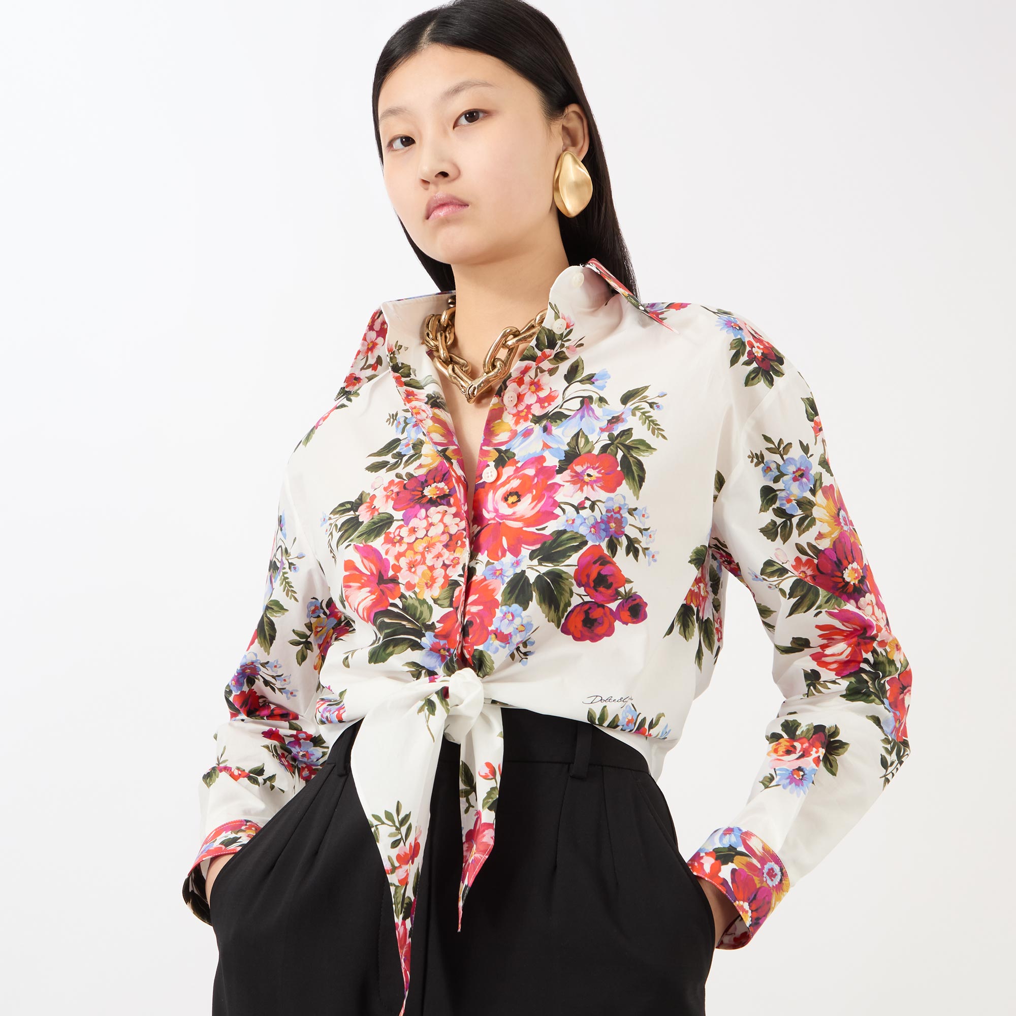 Dolce & Gabbana's SS26 collection interweaves relaxed silhouettes with handcrafted bouquet prints, bringing a vivid floral narrative to this blouse. Spun from pure cotton and cut to a cropped length, it's framed by a point collar and features long sleeves, while securing with a front placket and boasting an additional tie-front fastening for versatile styling.