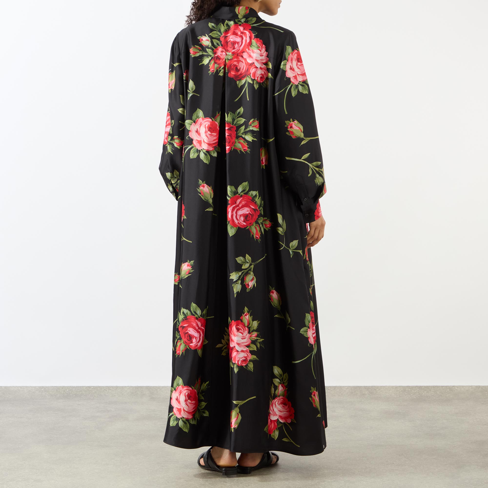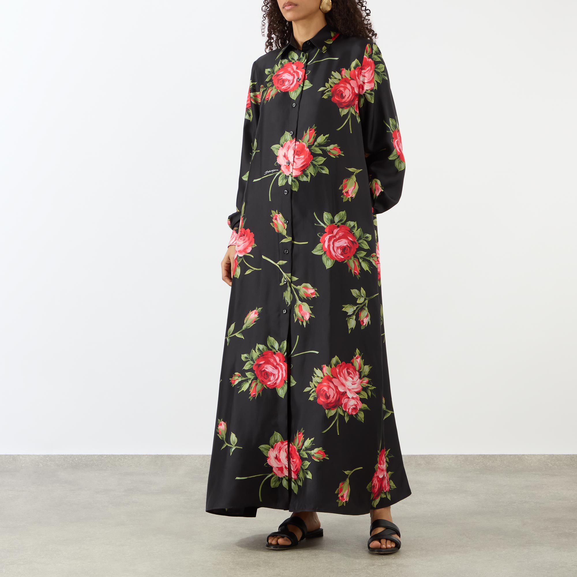 - Point collar, long sleeves, buttoned cuffs, front button fastening, slightly fitted waist, two side in seam pockets, flared hem, side split detailing, rear knife pleat, rose bouquet print, maxi length