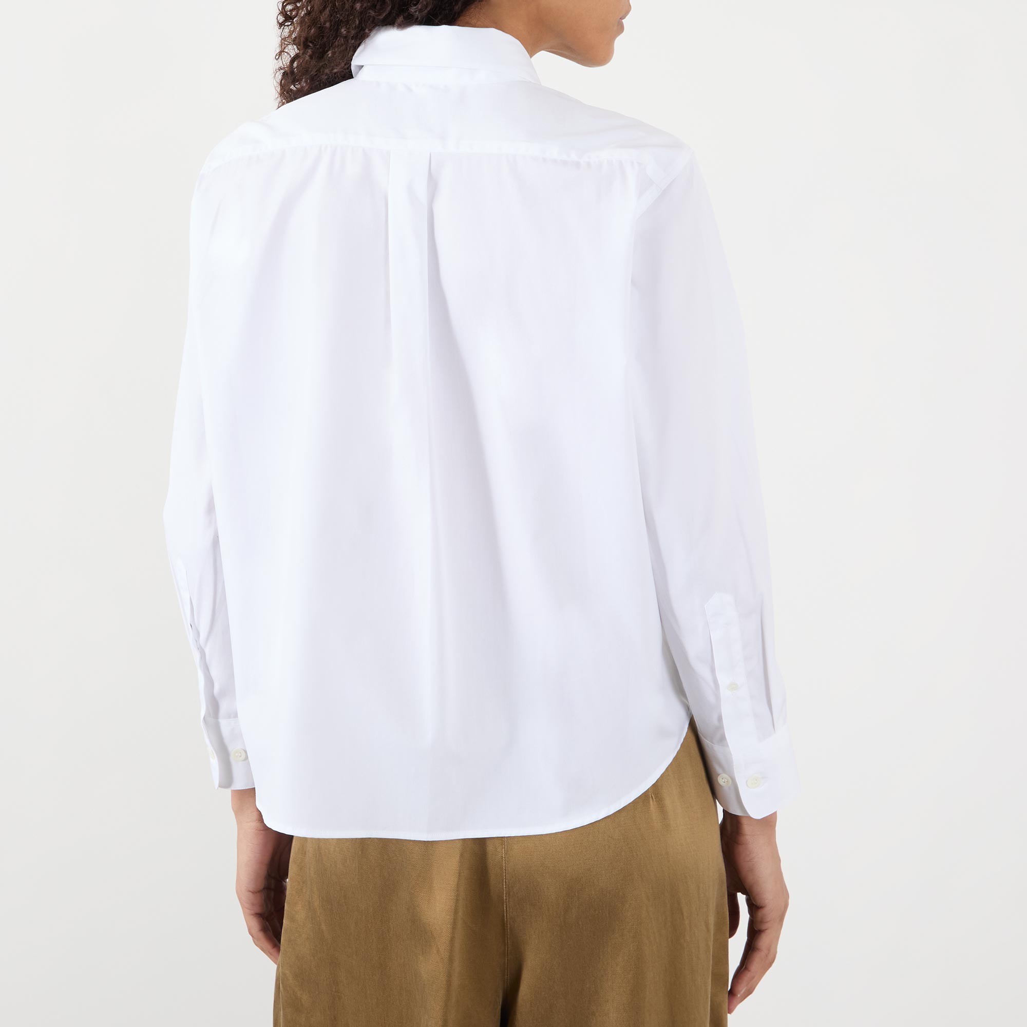 - Point collar, long sleeves, concealed button placket, tonal stitching, single-button cuffs, back box pleat, curved hemline, smooth fabric