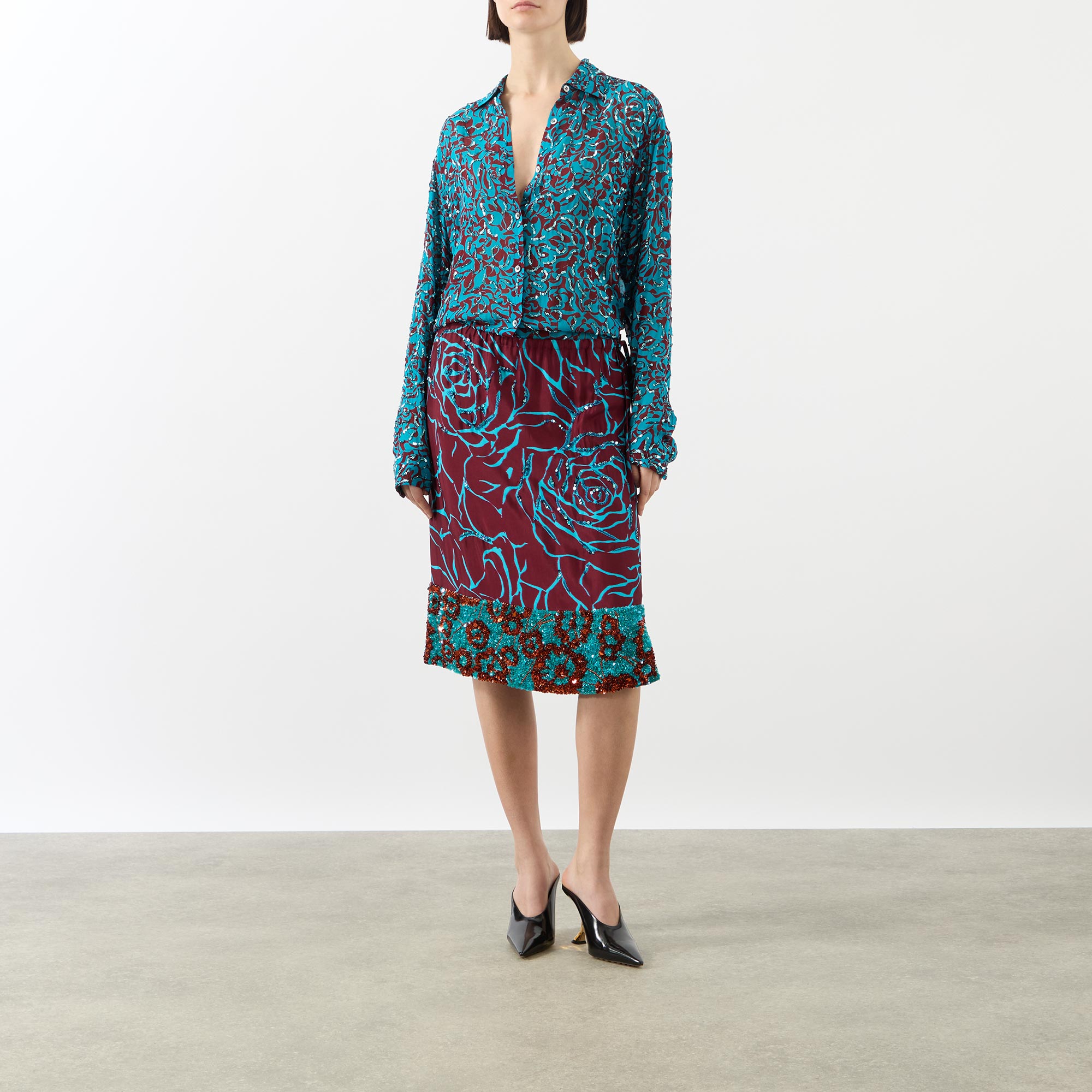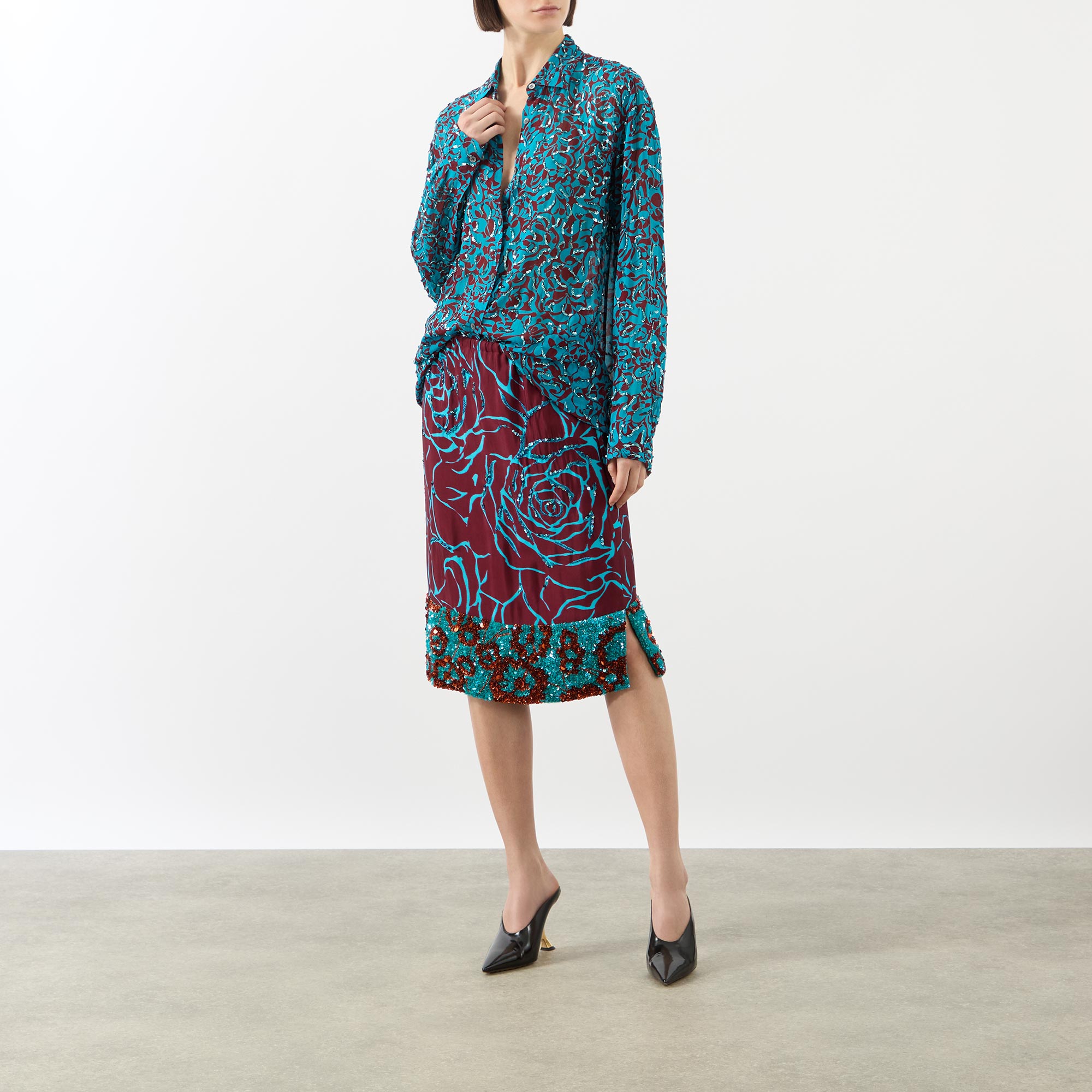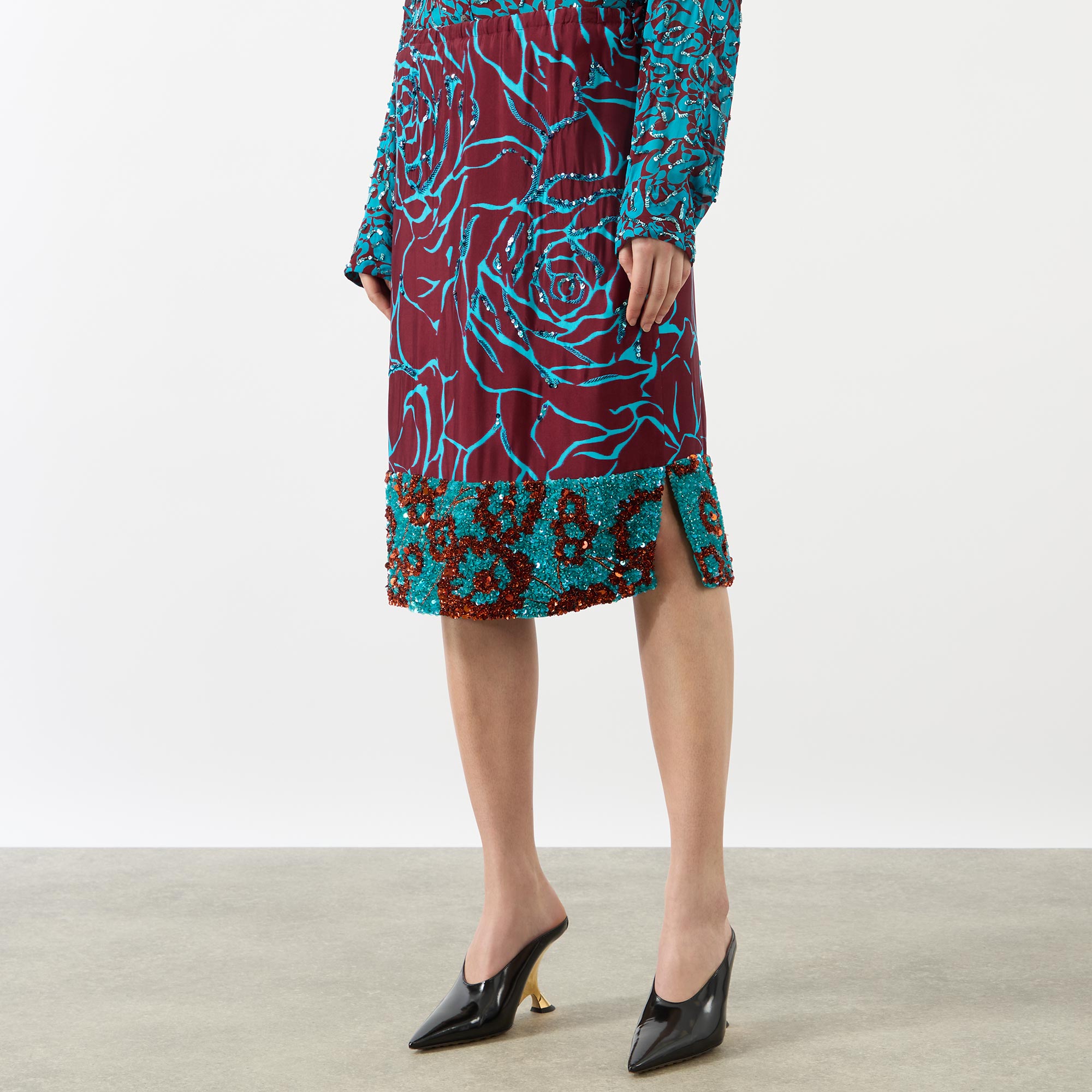 Floral motifs appear across the SS26 collection by Dries Van Noten, seen in the design of this skirt. Falling to a knee length and a column-inspired silhouette, it is finished with a sequin embellished hemline.