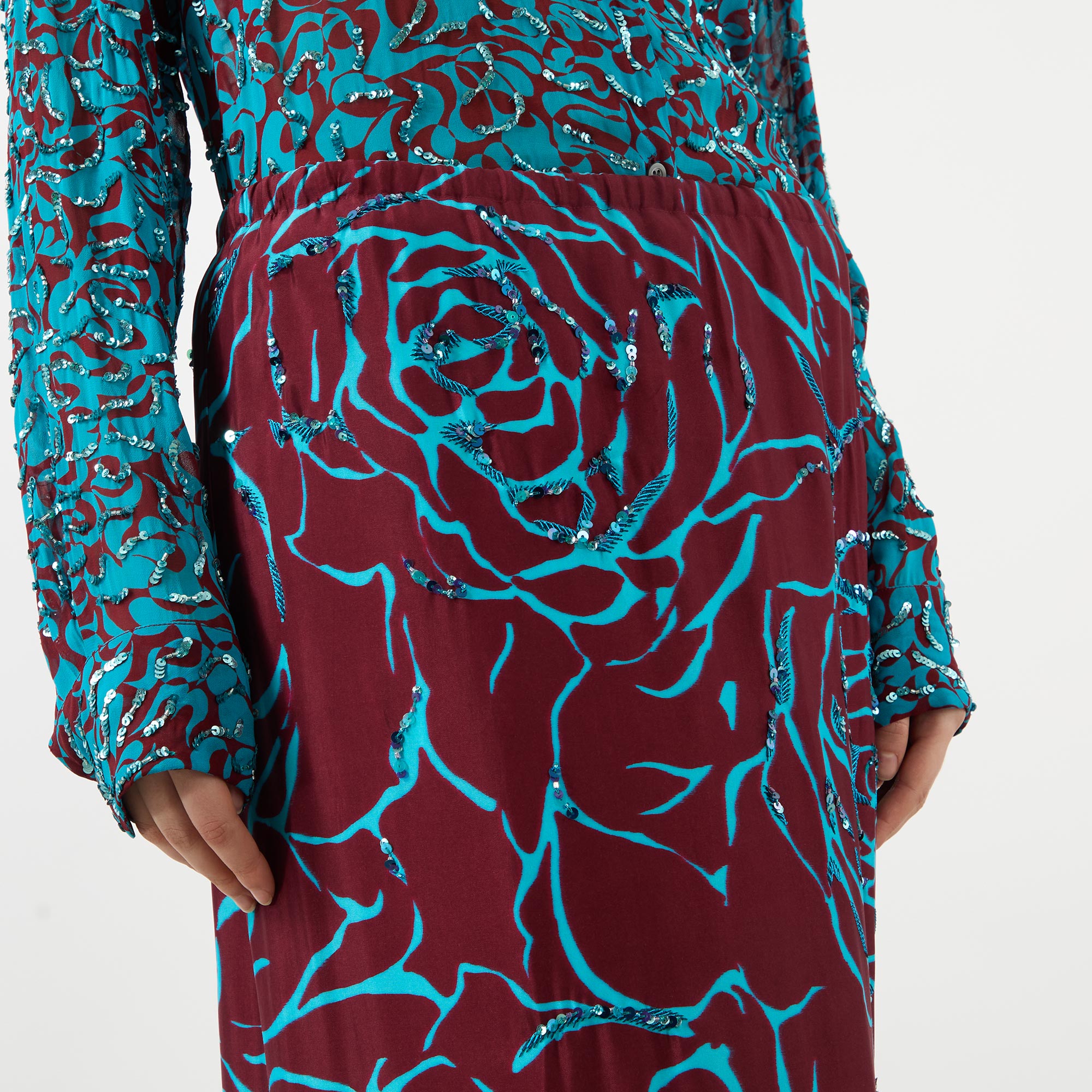 - Elasticated waistband, knee length, floral pattern, sequin embellishment