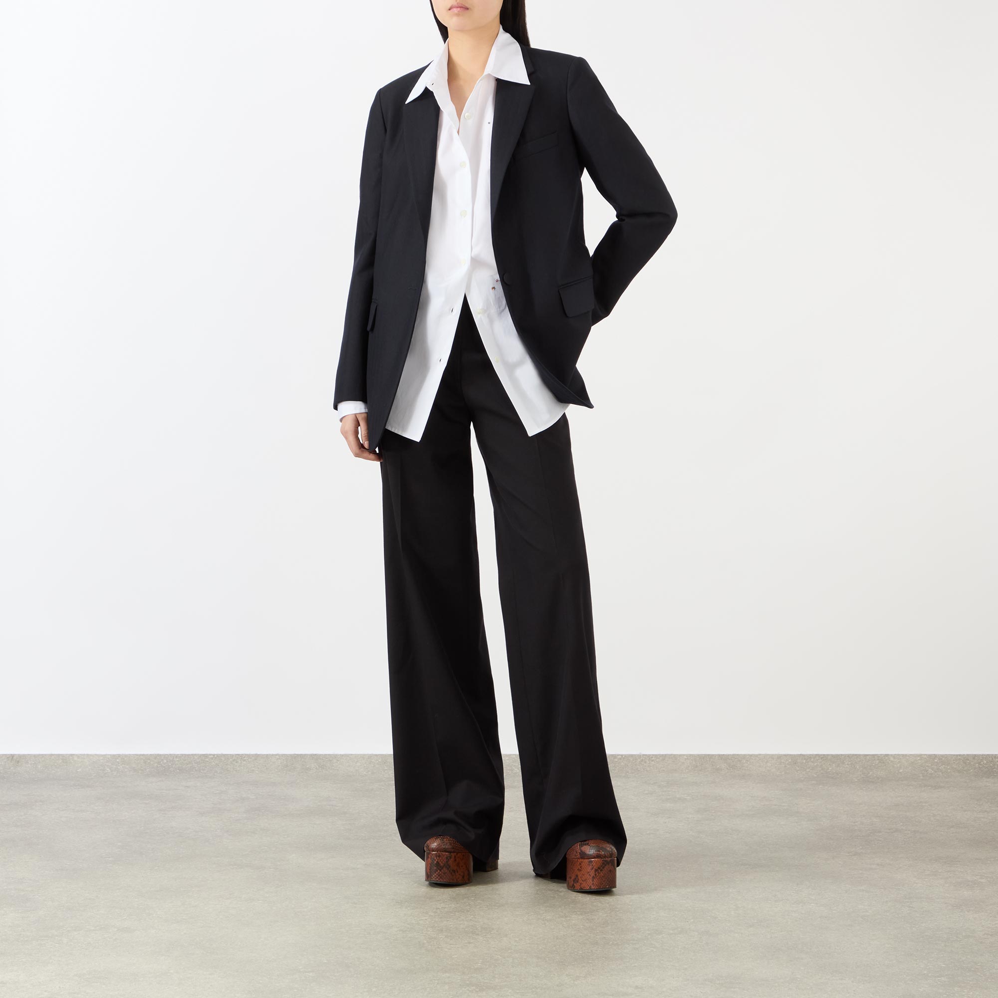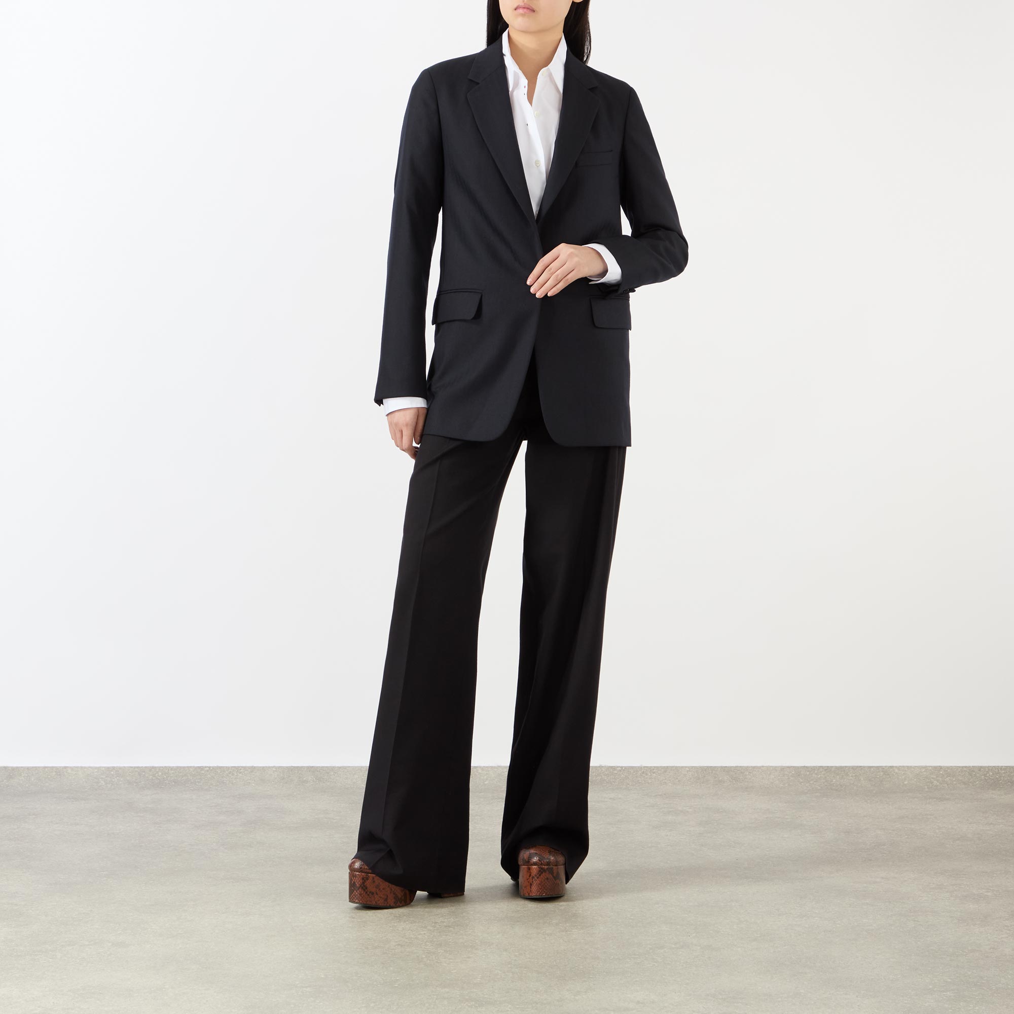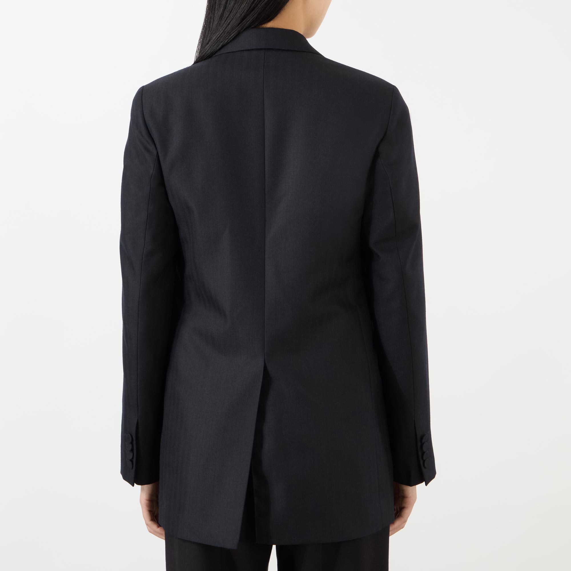 - Single-breasted, button fastening, notched lapels, flap pockets, chest pocket, vent at rear, buttoned cuffs