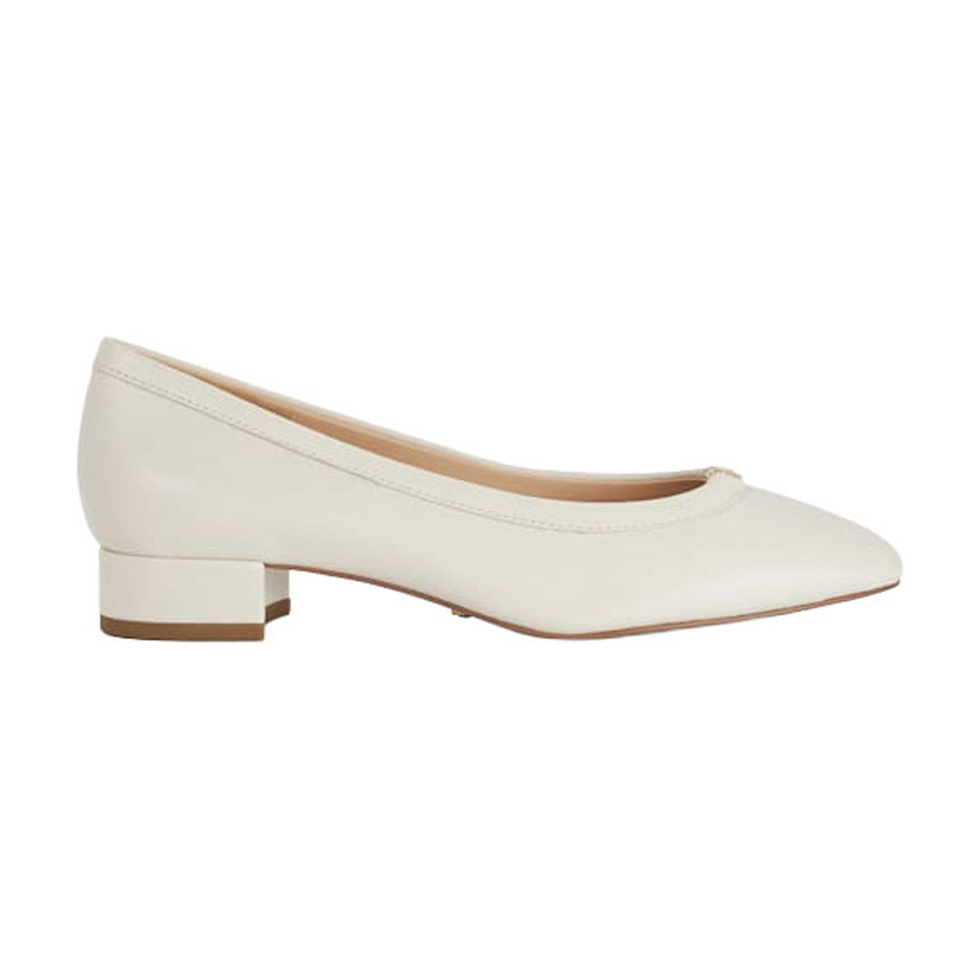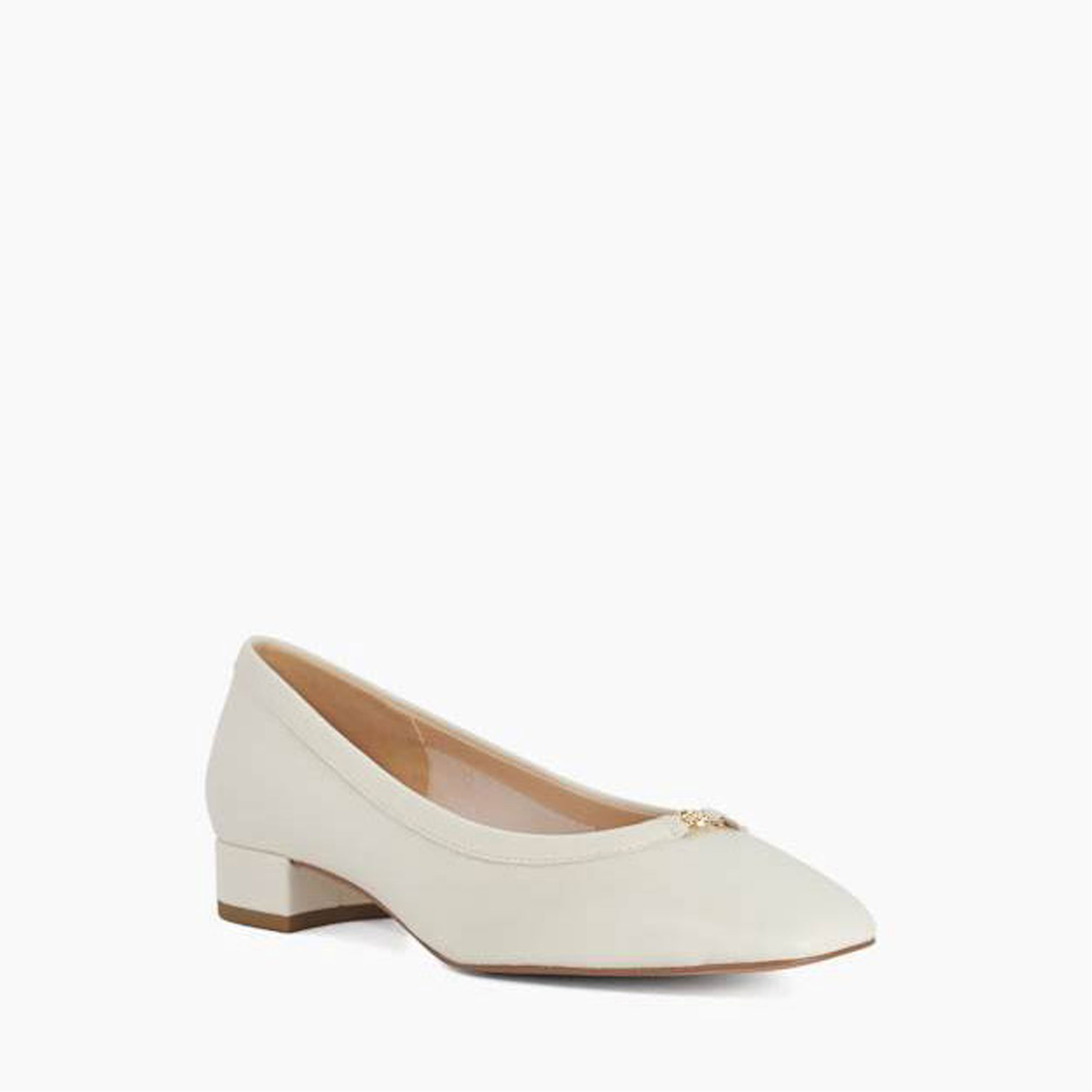 - Low block heel, almond-shape toe, double D logo hardware, cushioned footbed
