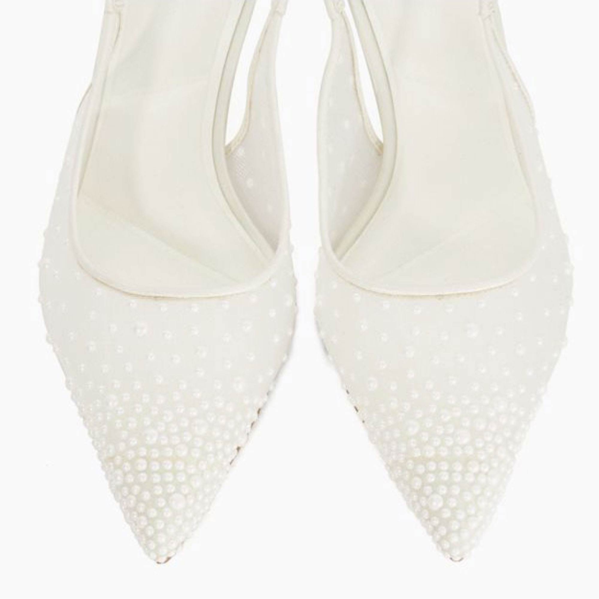 • Flared heel, pointed toe, pearl embellished sheer fabric, foam sock lining, discreet blue jewel on the sole
