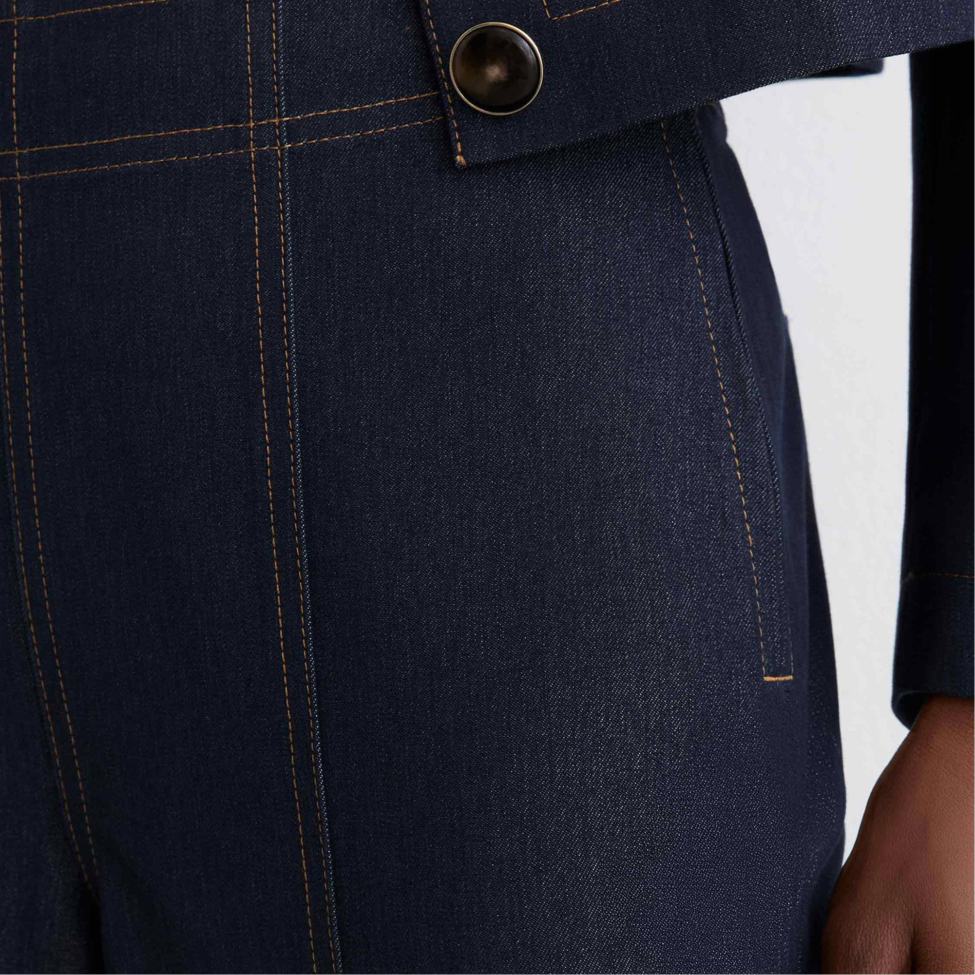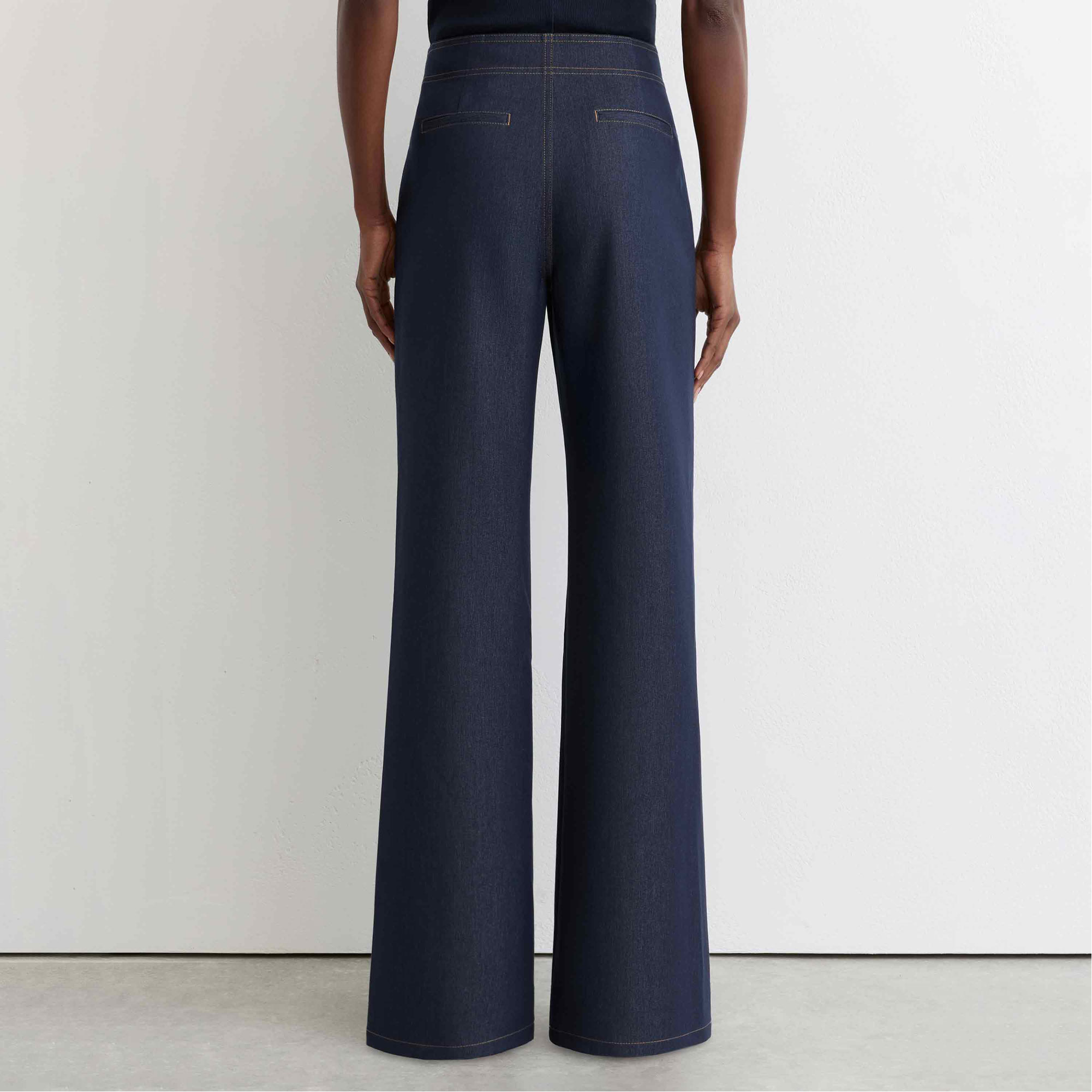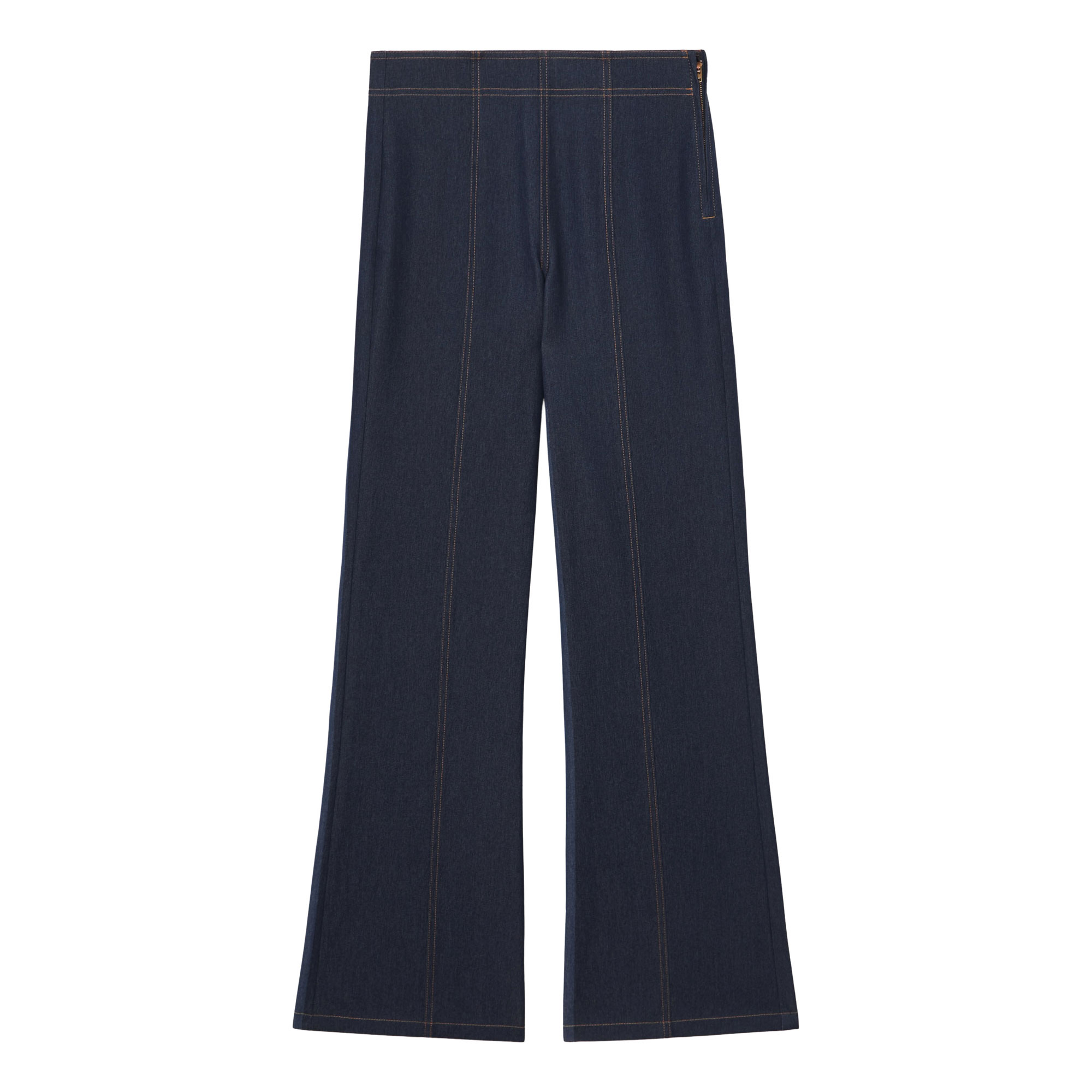 - Smooth, lightweight, denim-look fabric, flared silhouette, contrast topstitching, concealed side zip fastening, back welt pockets