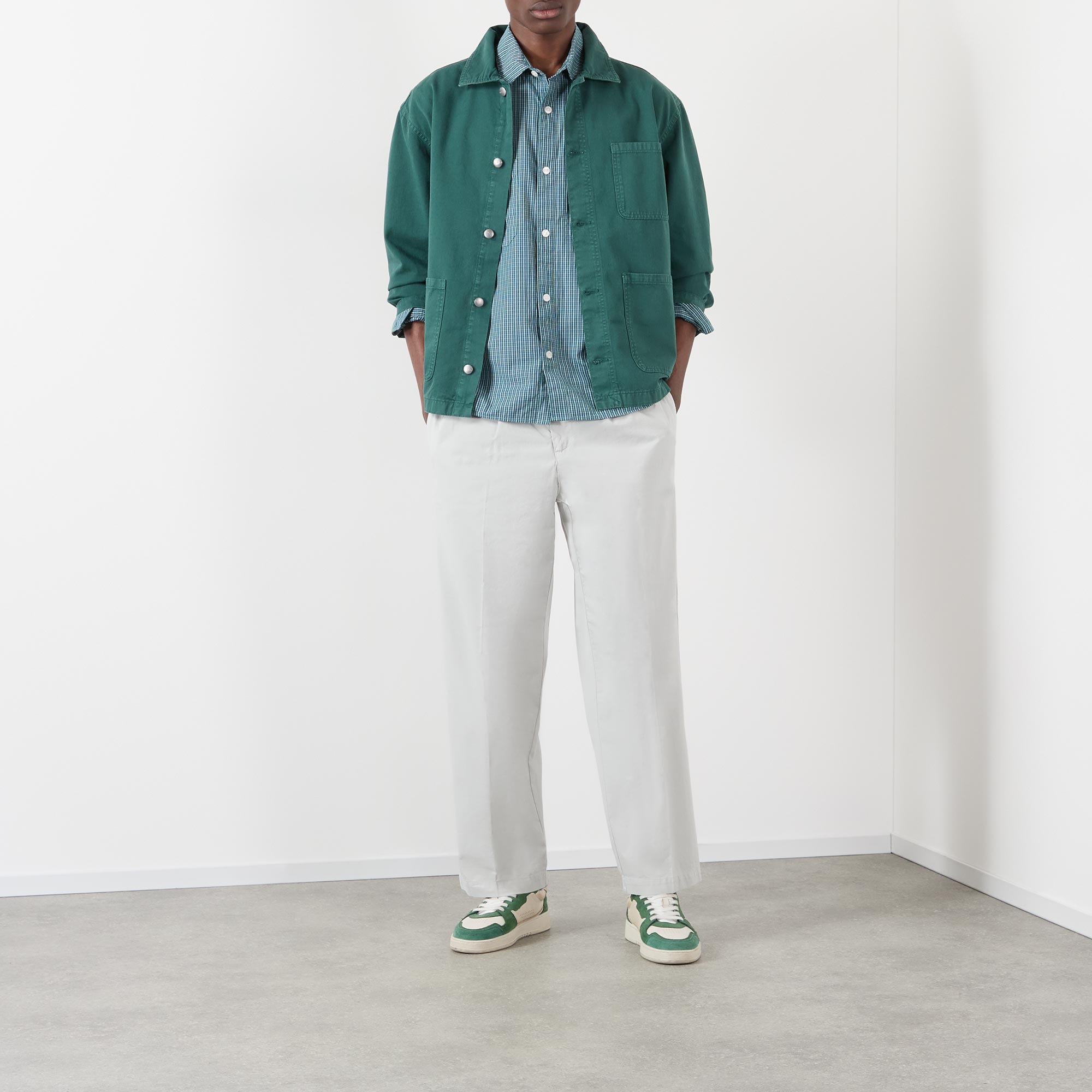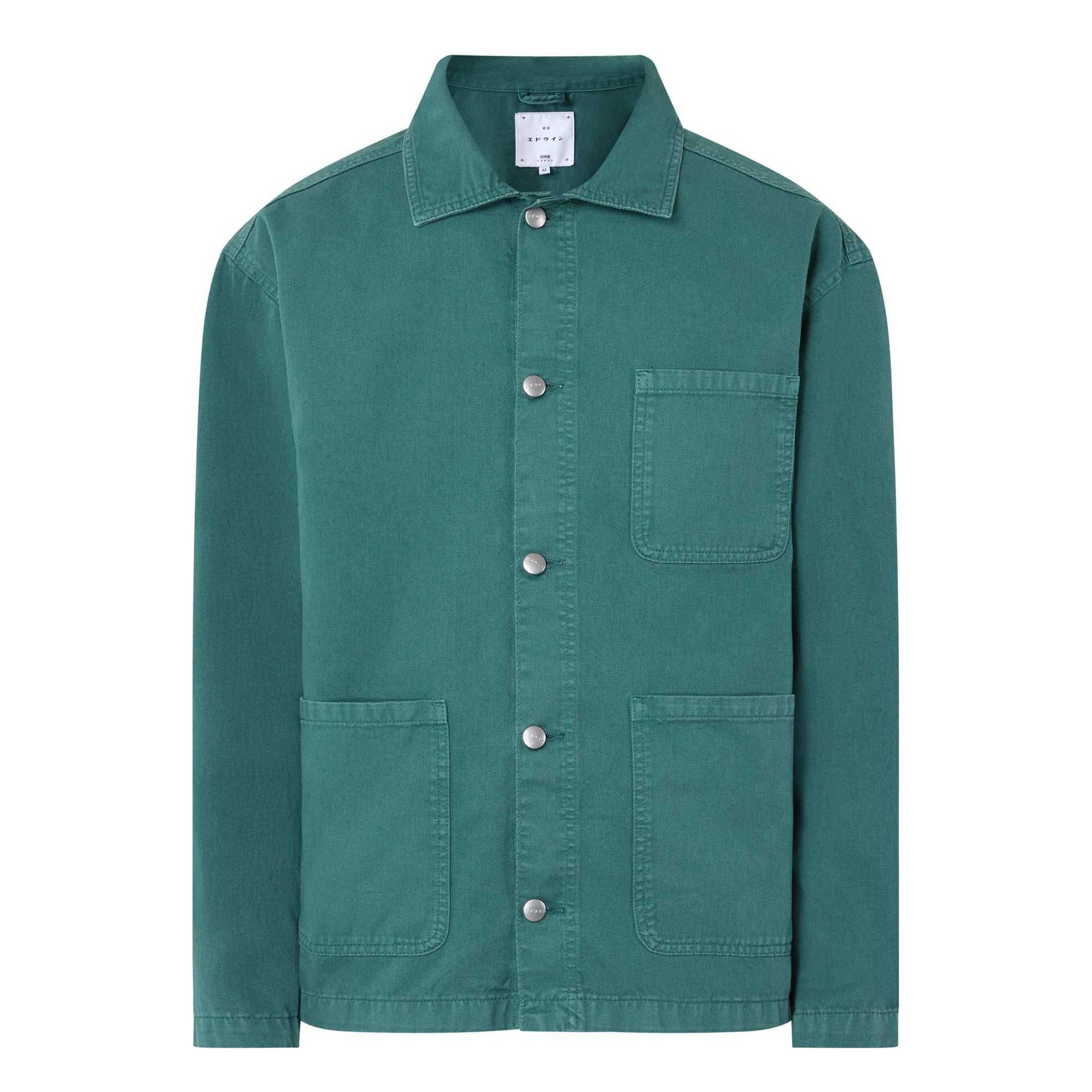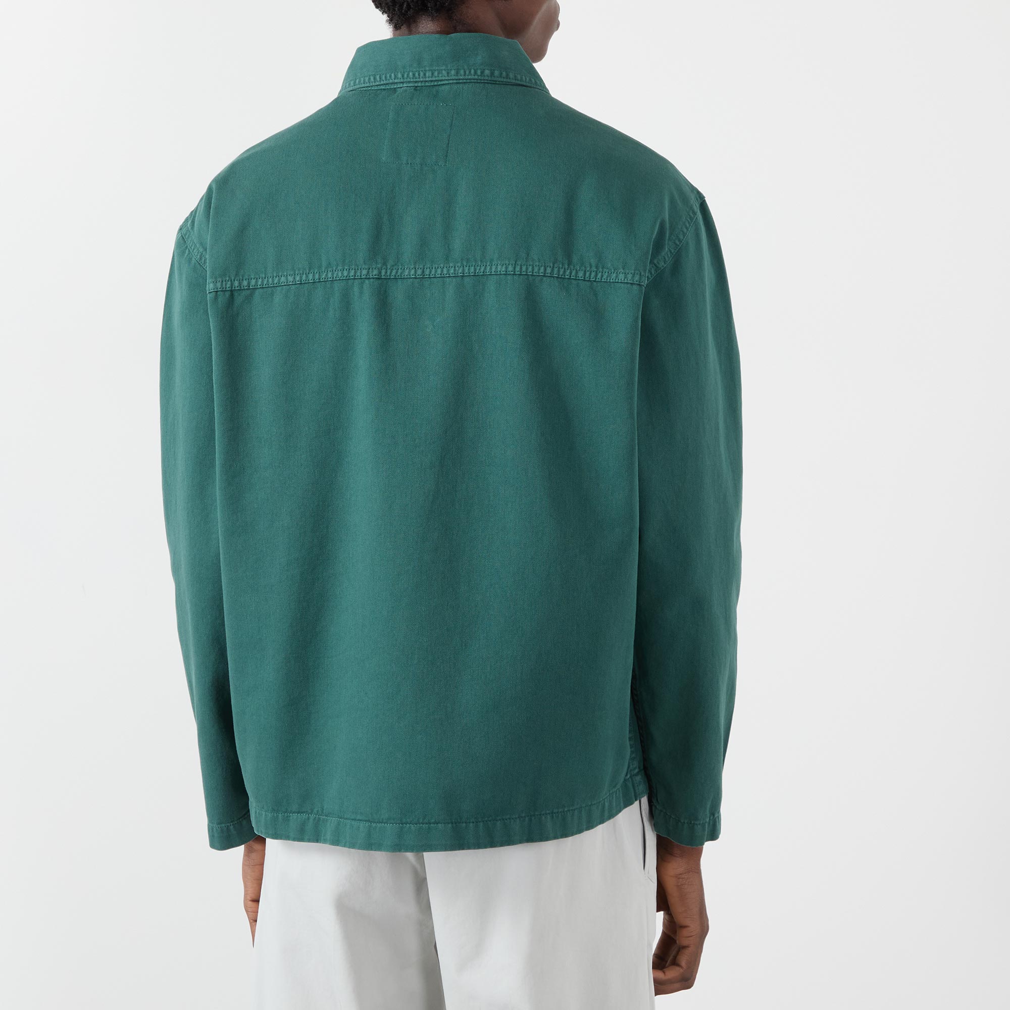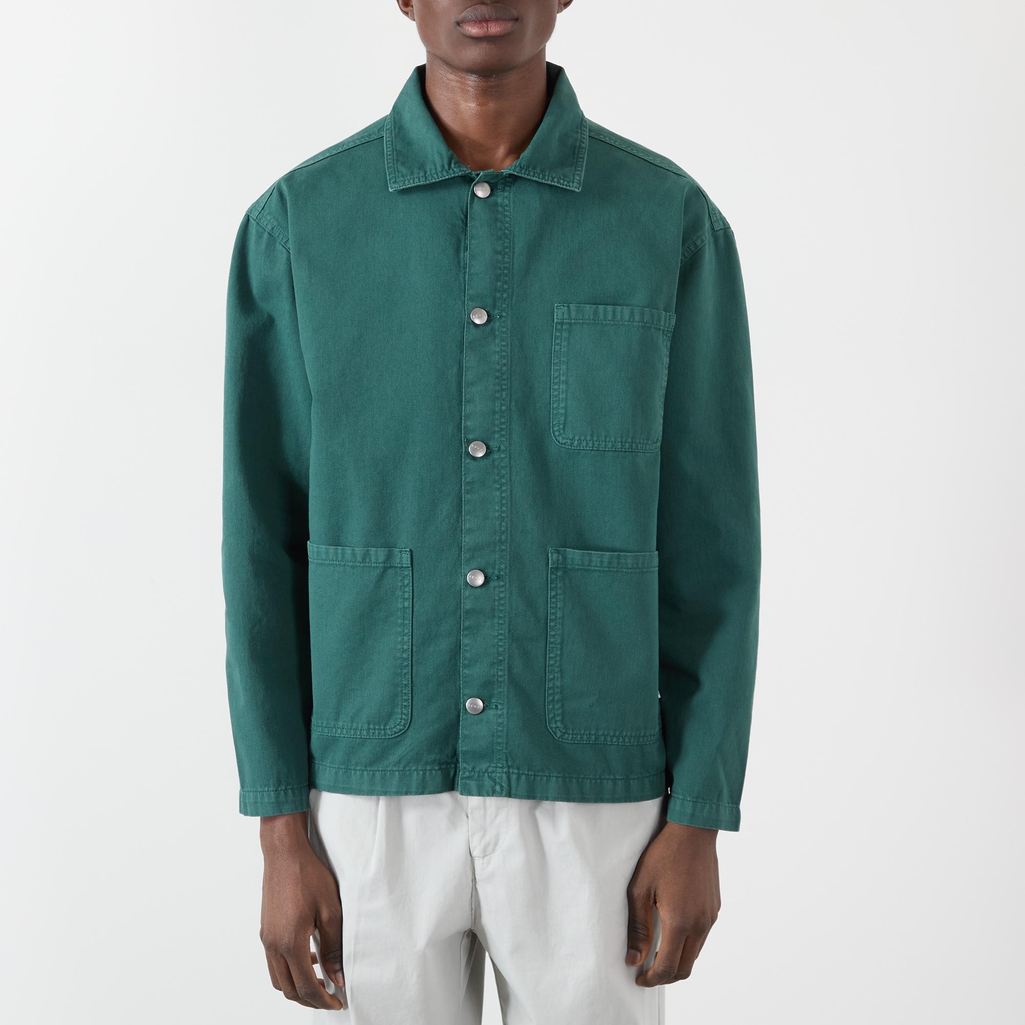 - Collared neckline, long sleeves, chest pocket, patch pockets, slightly dipped hem