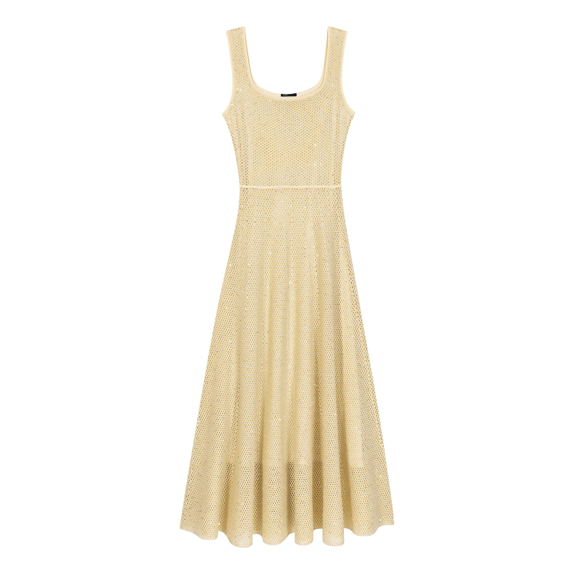 - Maxi length, rhinestone embellishment, square neckline, square back, wide straps, flared skater silhouette, shorter tone-on-tone lining, openwork knit, tone-on-tone sequins