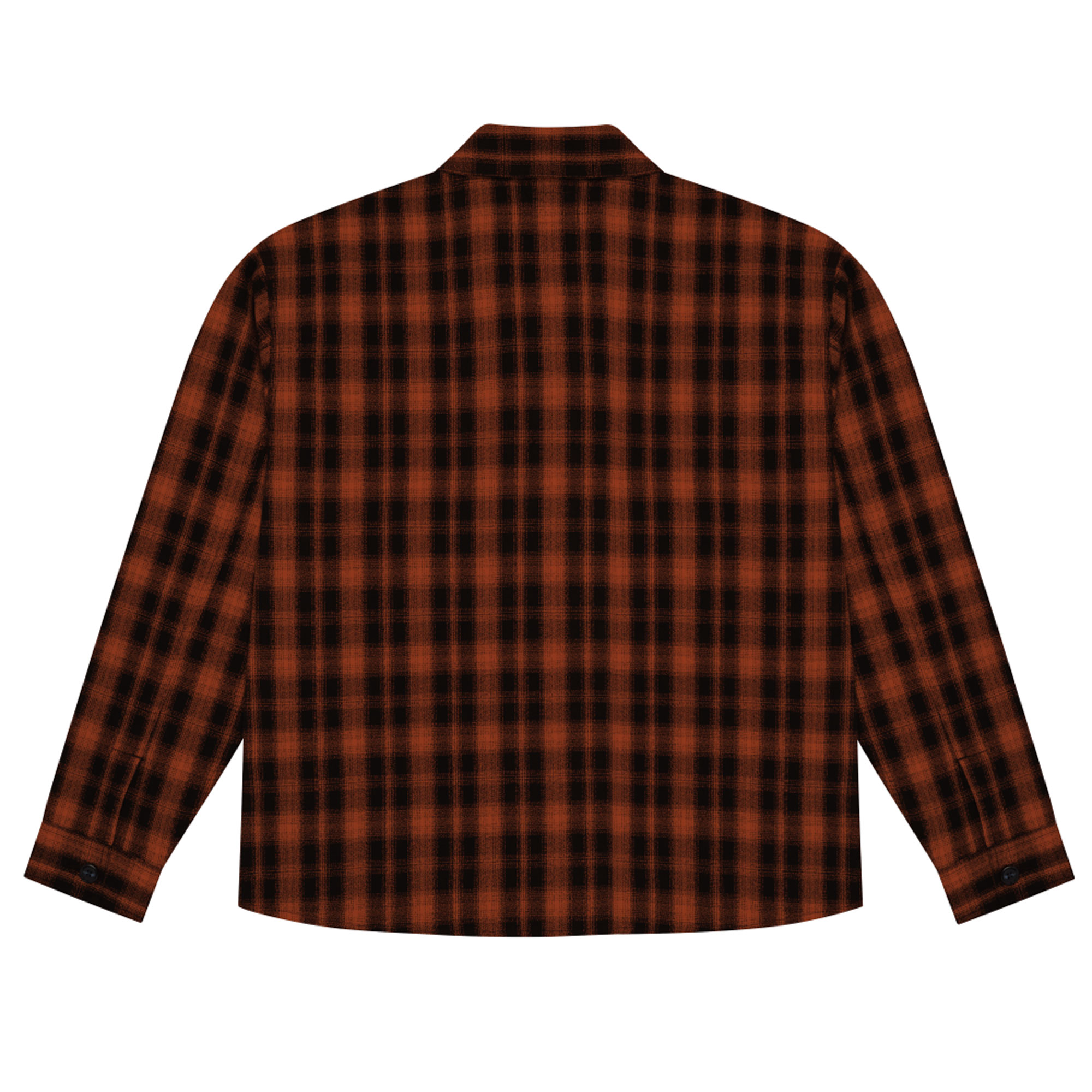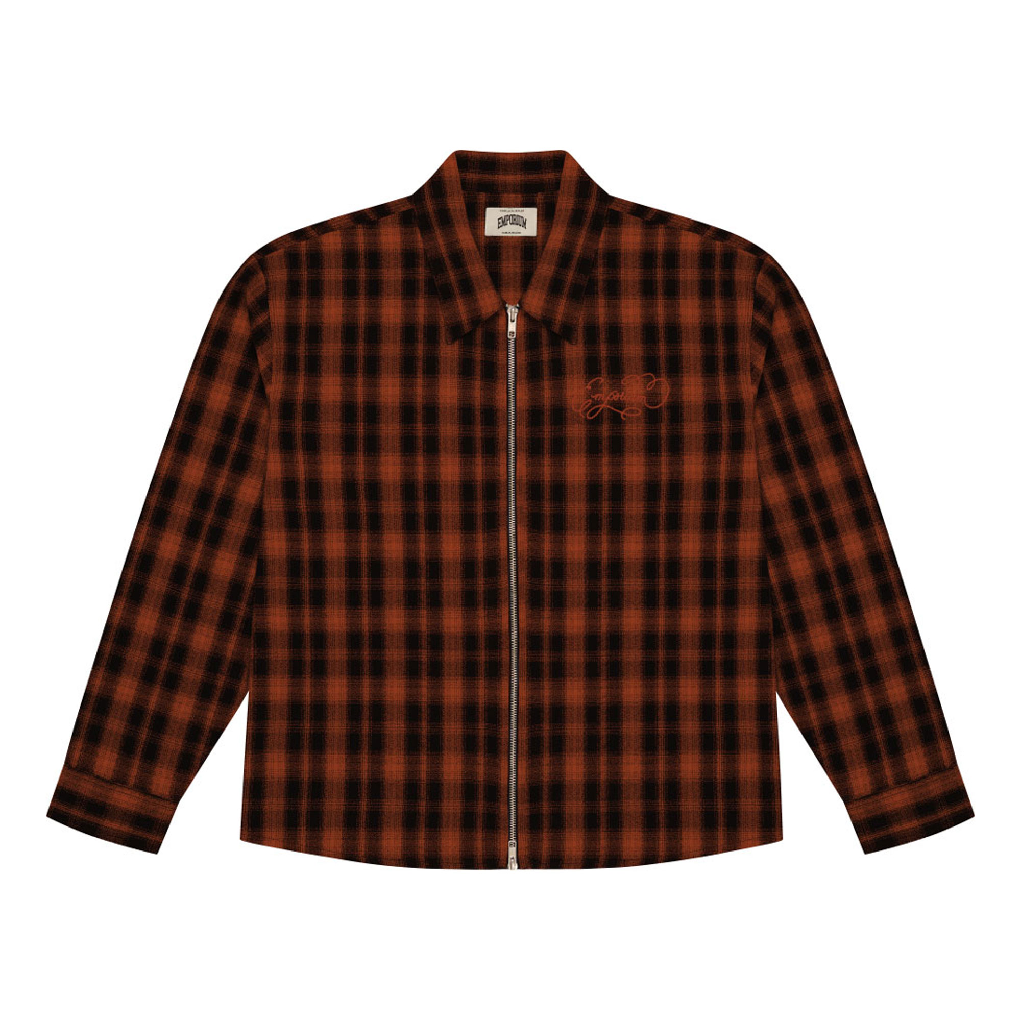 - Shirt collar, long sleeves, buttoned cuffs, YKK double zip, curved hem, check print, embroidered logo detail on the chest