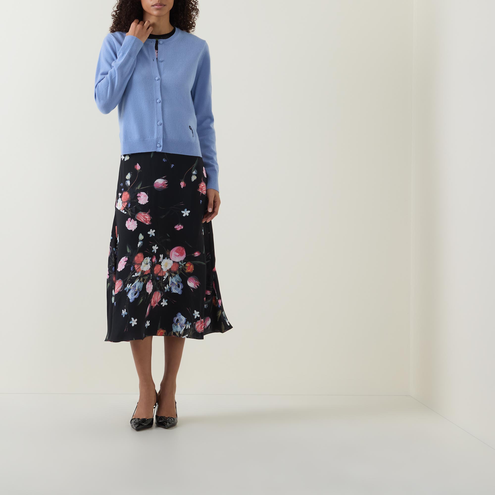 Erdem journeys into a bygone era for its SS26 collection, drawing inspiration from the historical figure Hélène Smith and the fluid, modern style of her designs. This cardigan, for example, is crafted from luxurious cashmere to a relaxed, casual fit, adorned with fabric-covered buttons down the front and finished with a delicate floral embroidery near the hem.