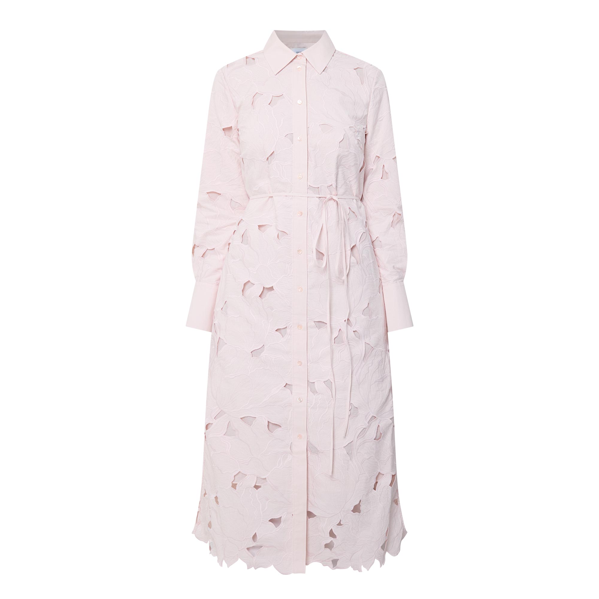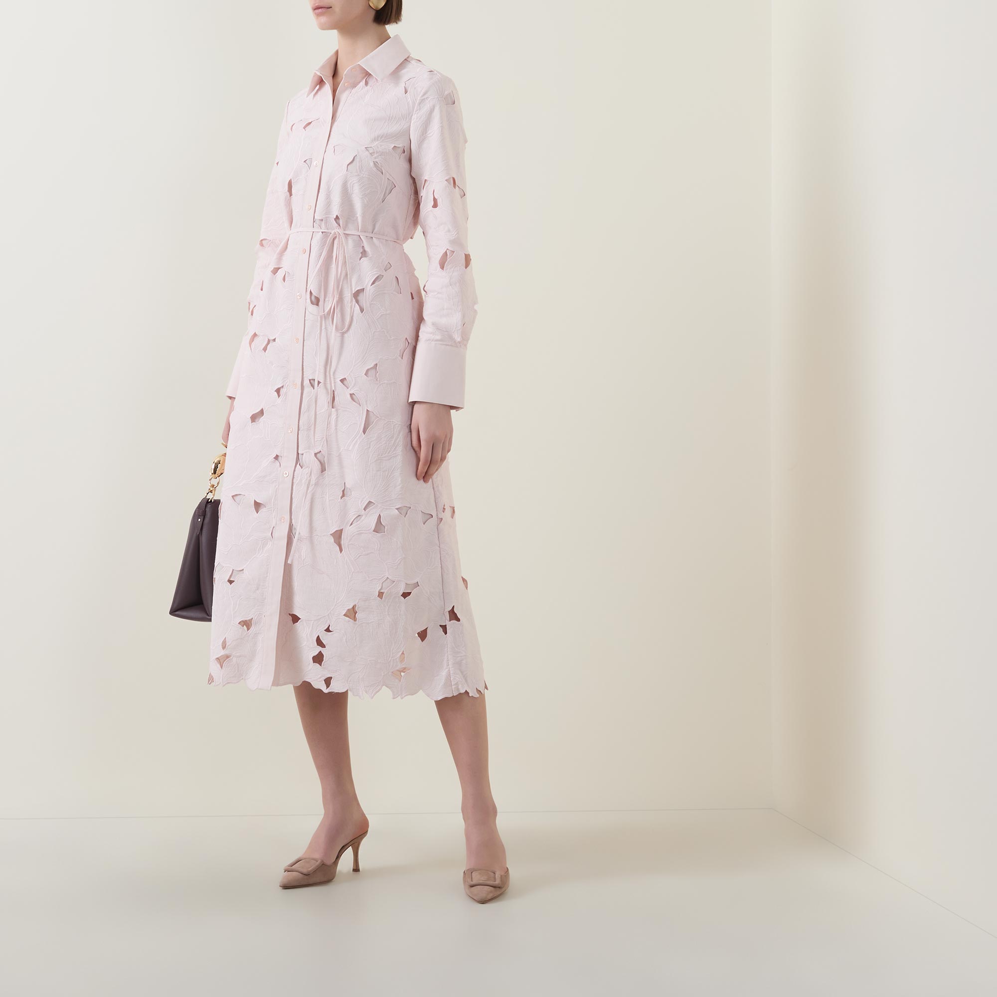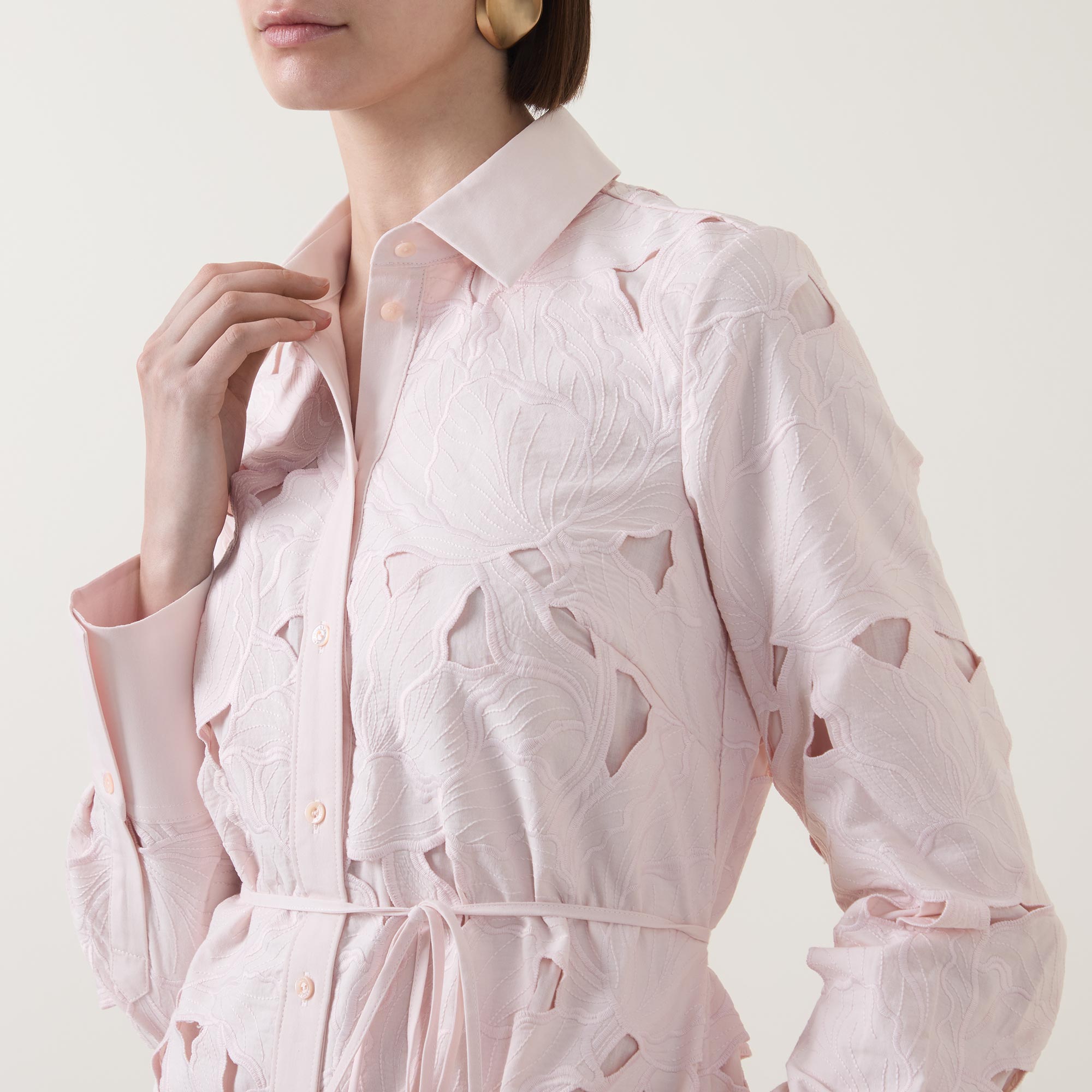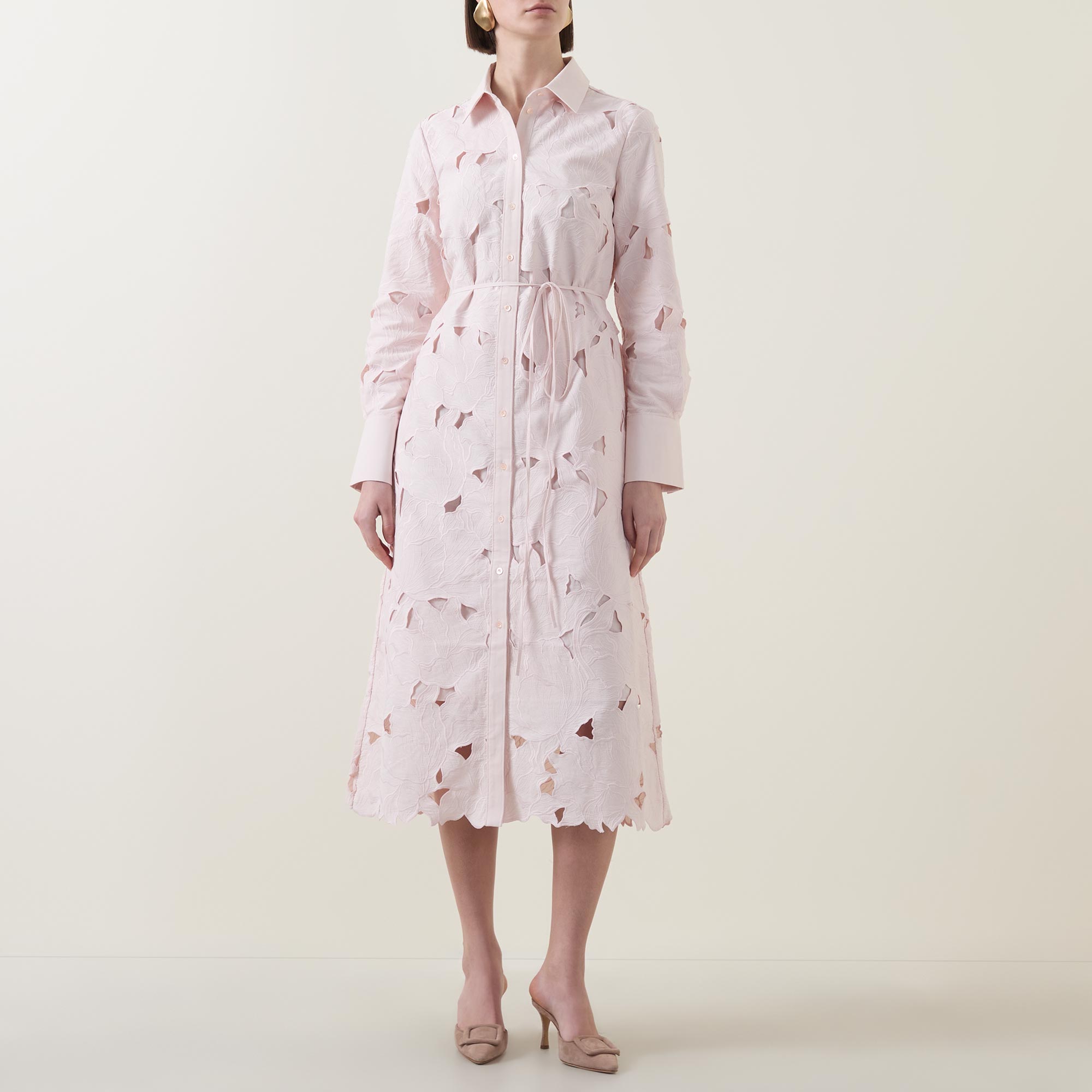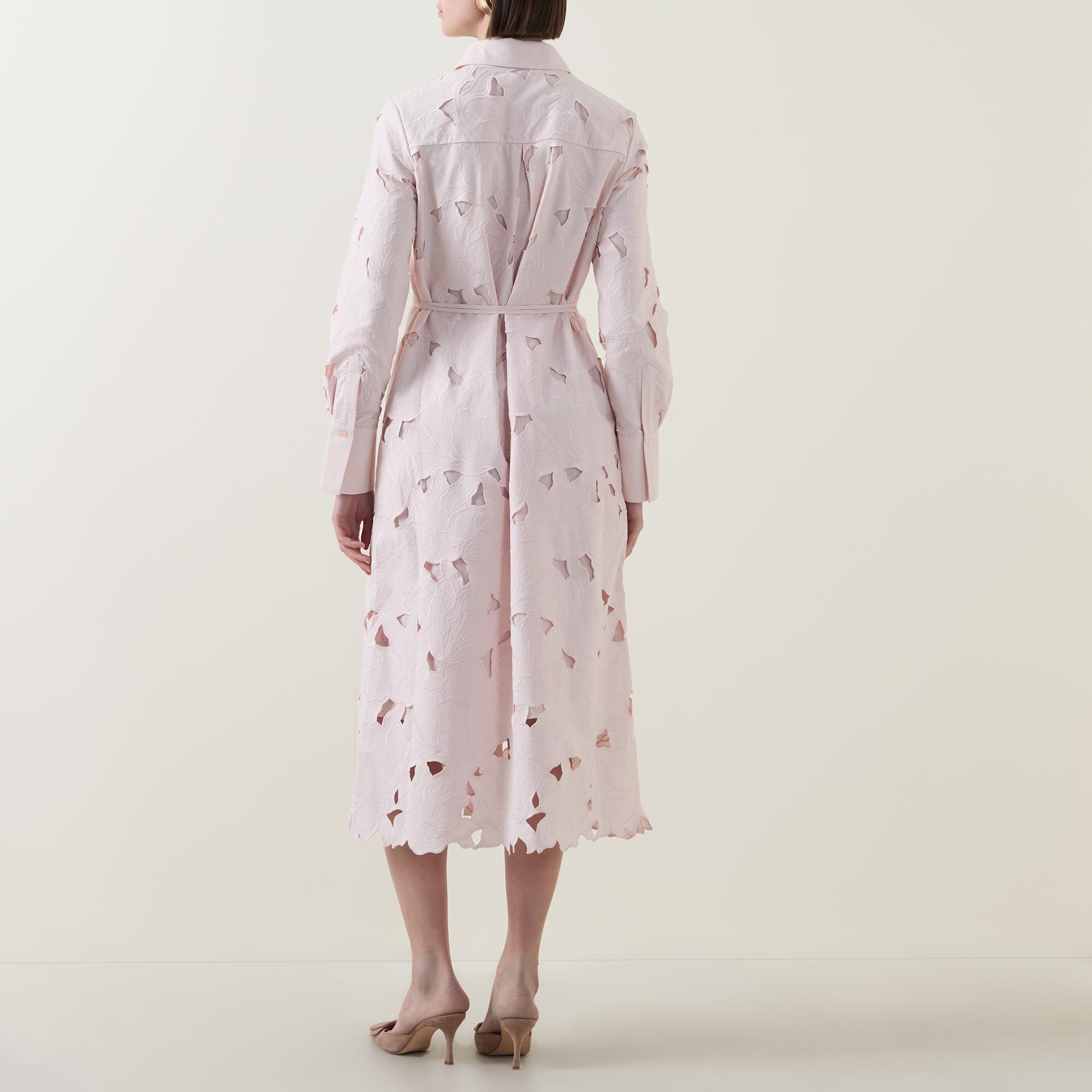 • Collared neckline, full button fastening, self-tie belt, midi length, lined, long sleeves, side entry pockets, buttoned cuffs, laser-cut floral details