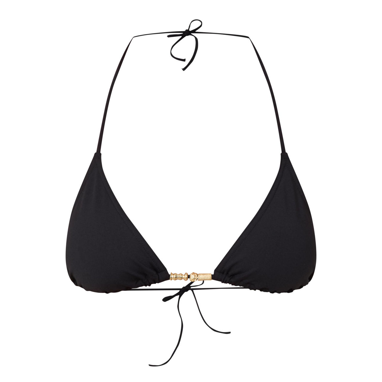 • Adjustable tie-fastening halter neckline, triangle cups, gold-tone hardware details, adjustable tie-fastening back straps