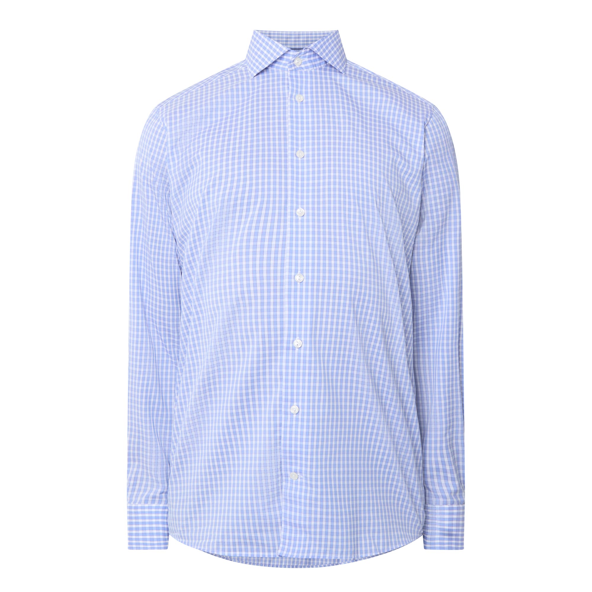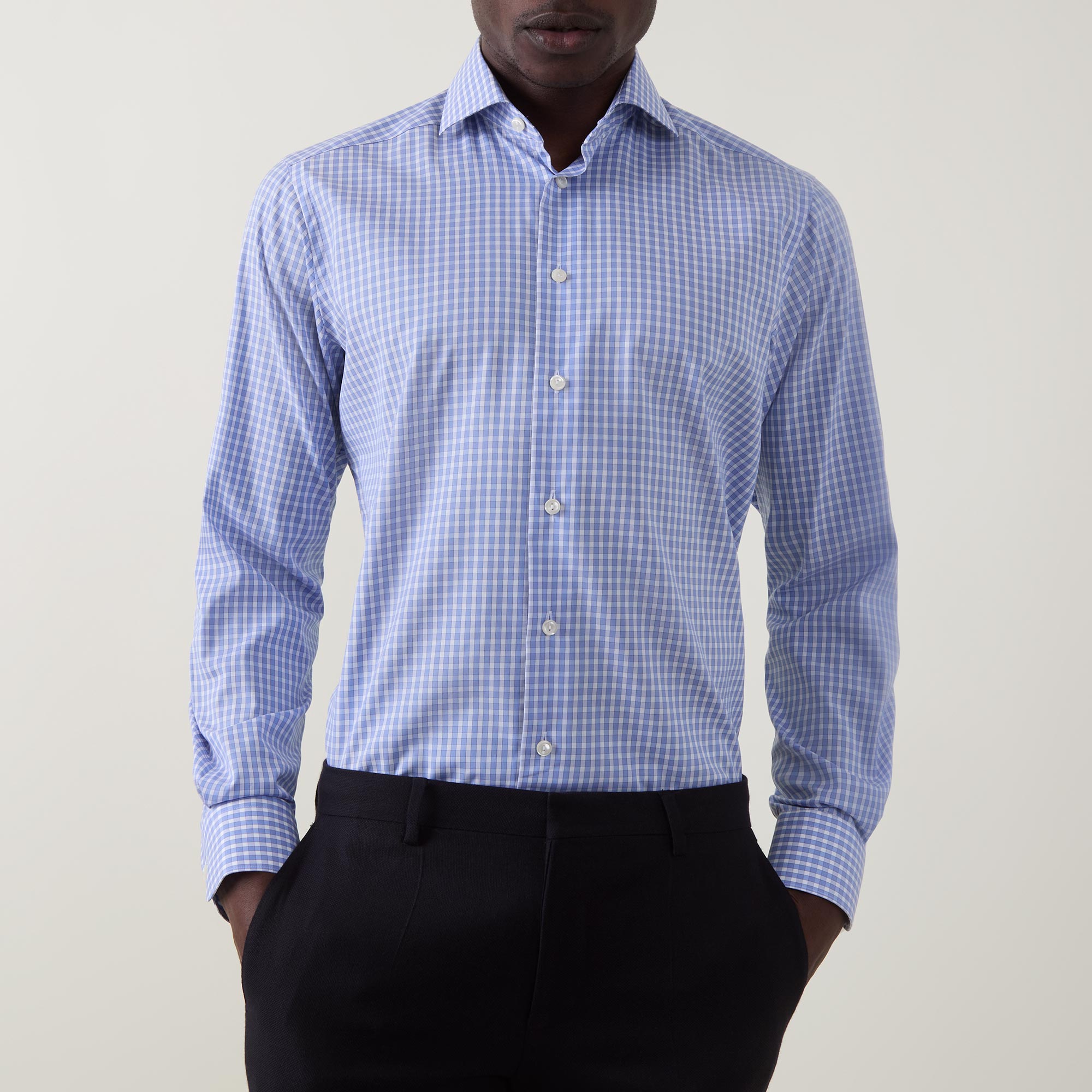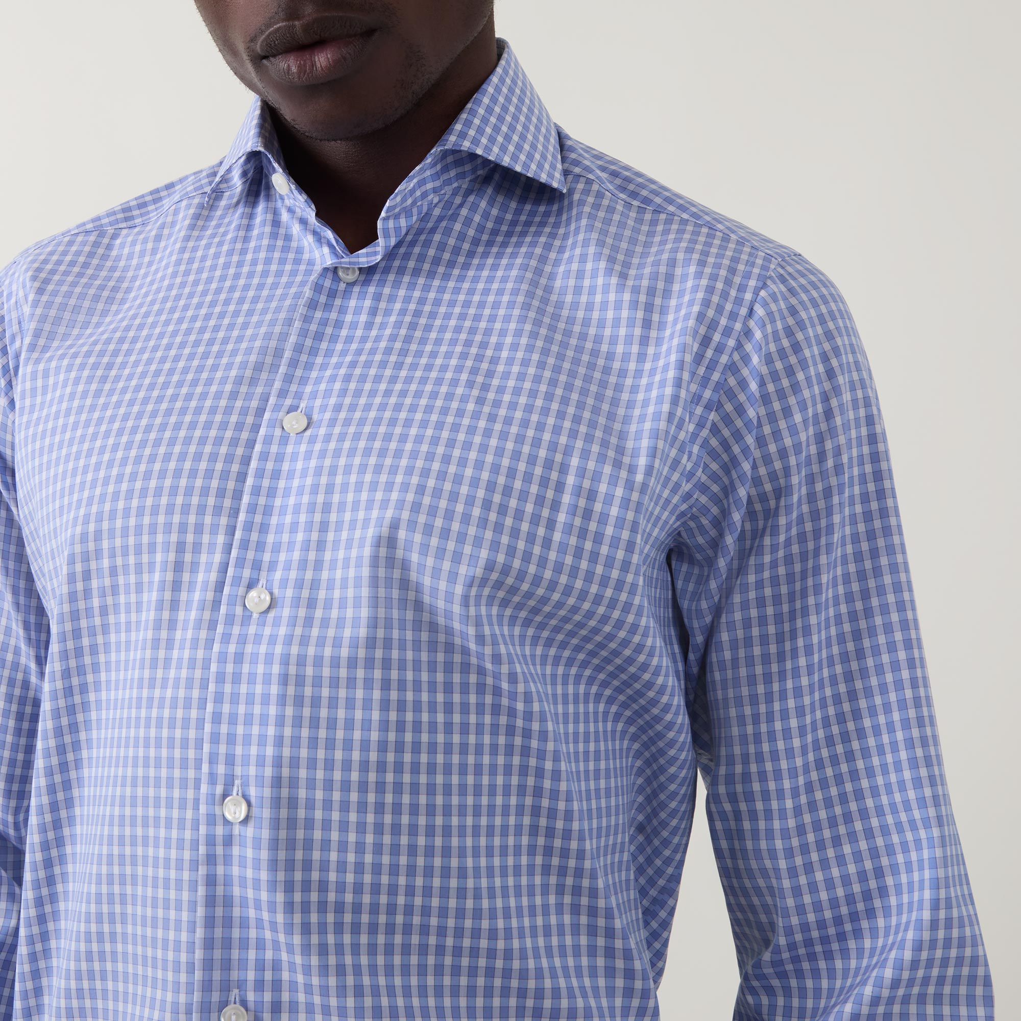 - Point collar, long sleeves, buttoned cuffs, front button placket, curved hem, tonal check print, tonal stitching