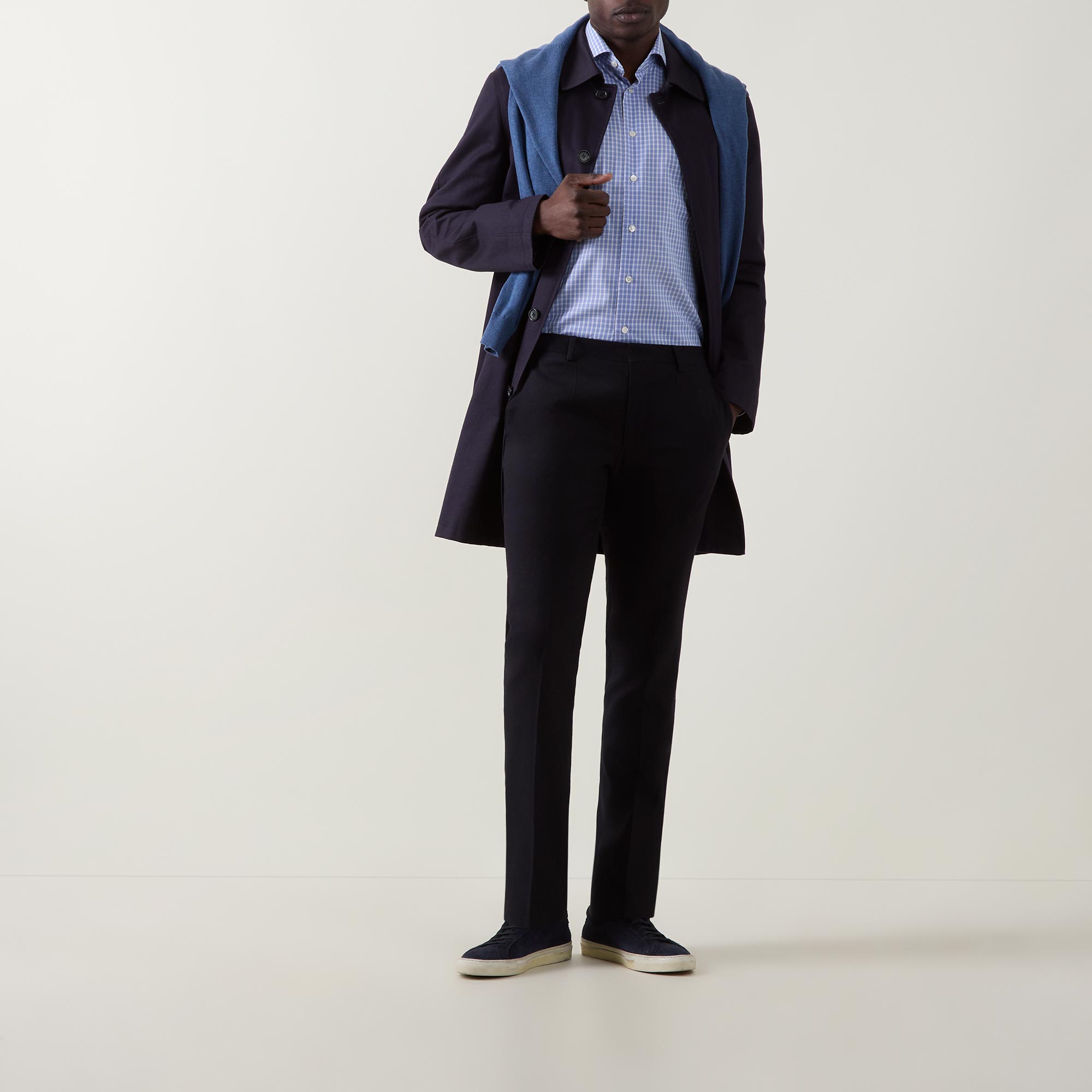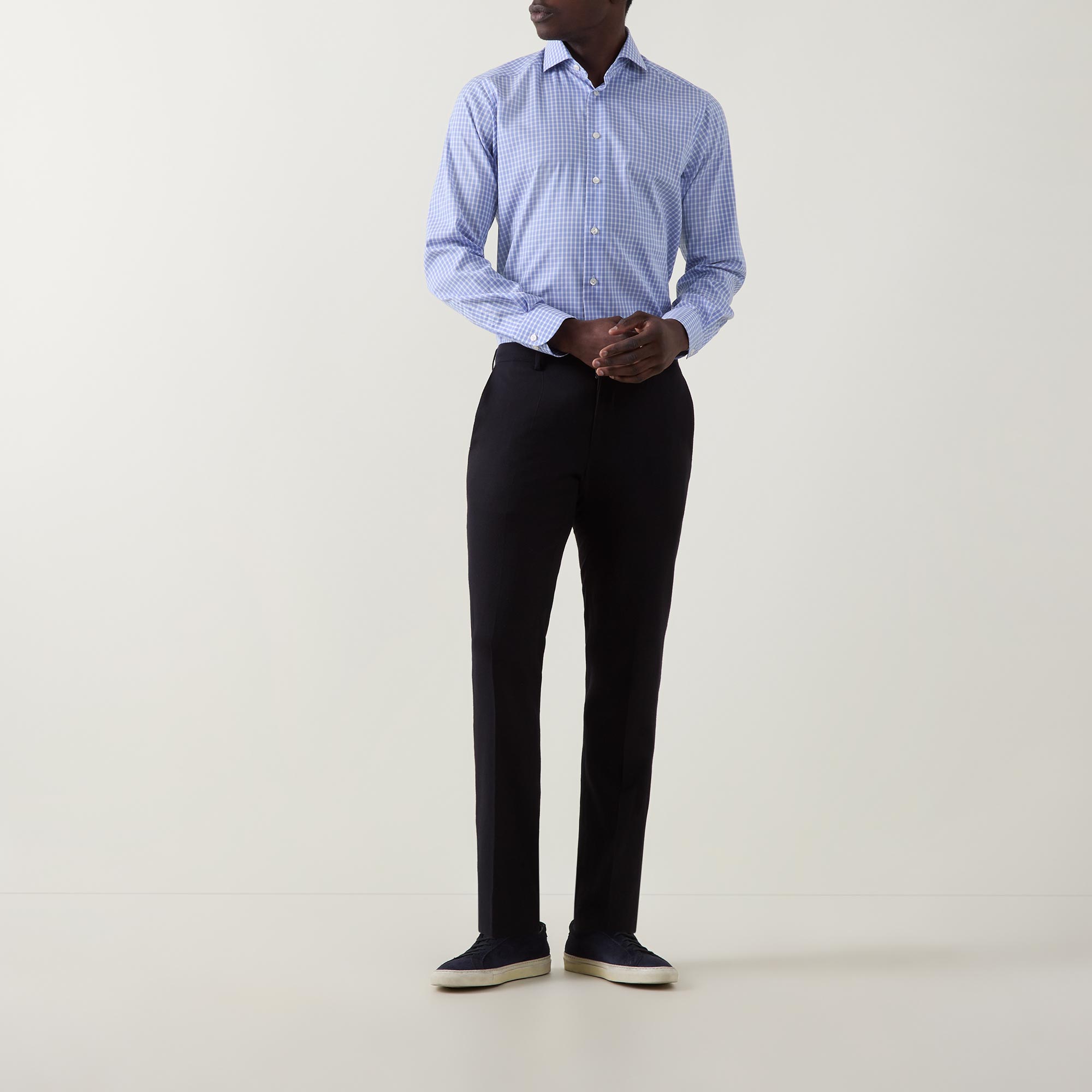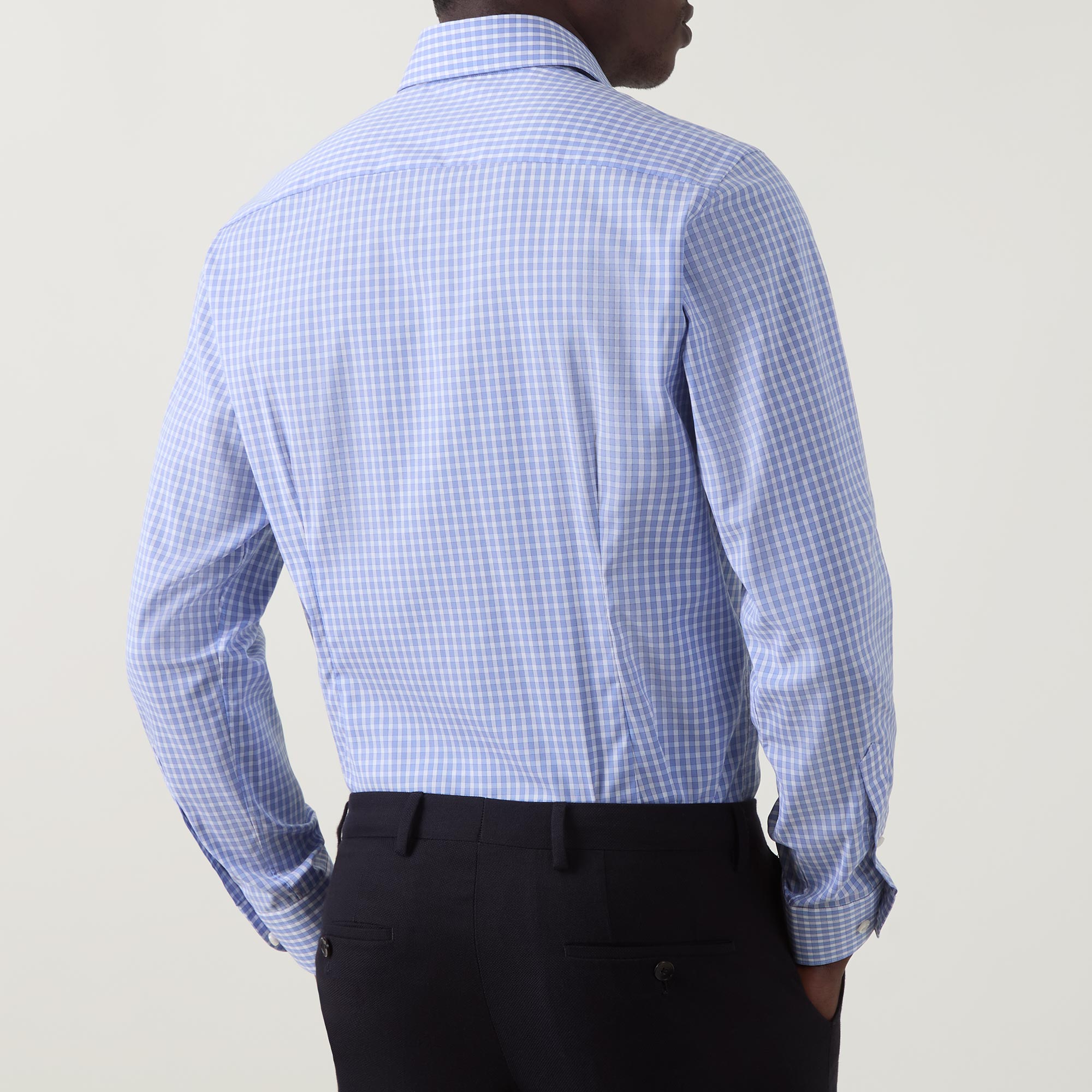 - Point collar, long sleeves, buttoned cuffs, front button placket, curved hem, tonal check print, tonal stitching