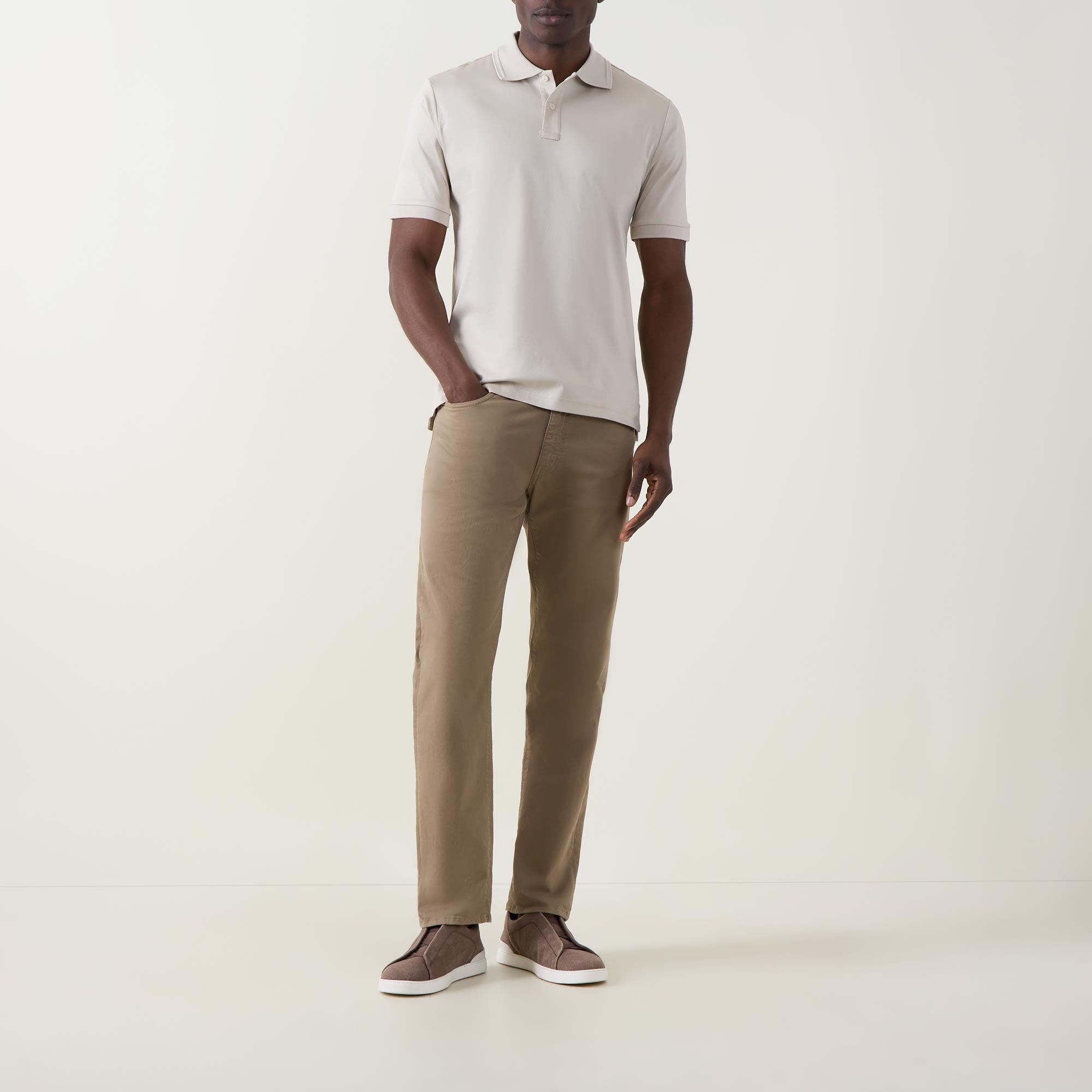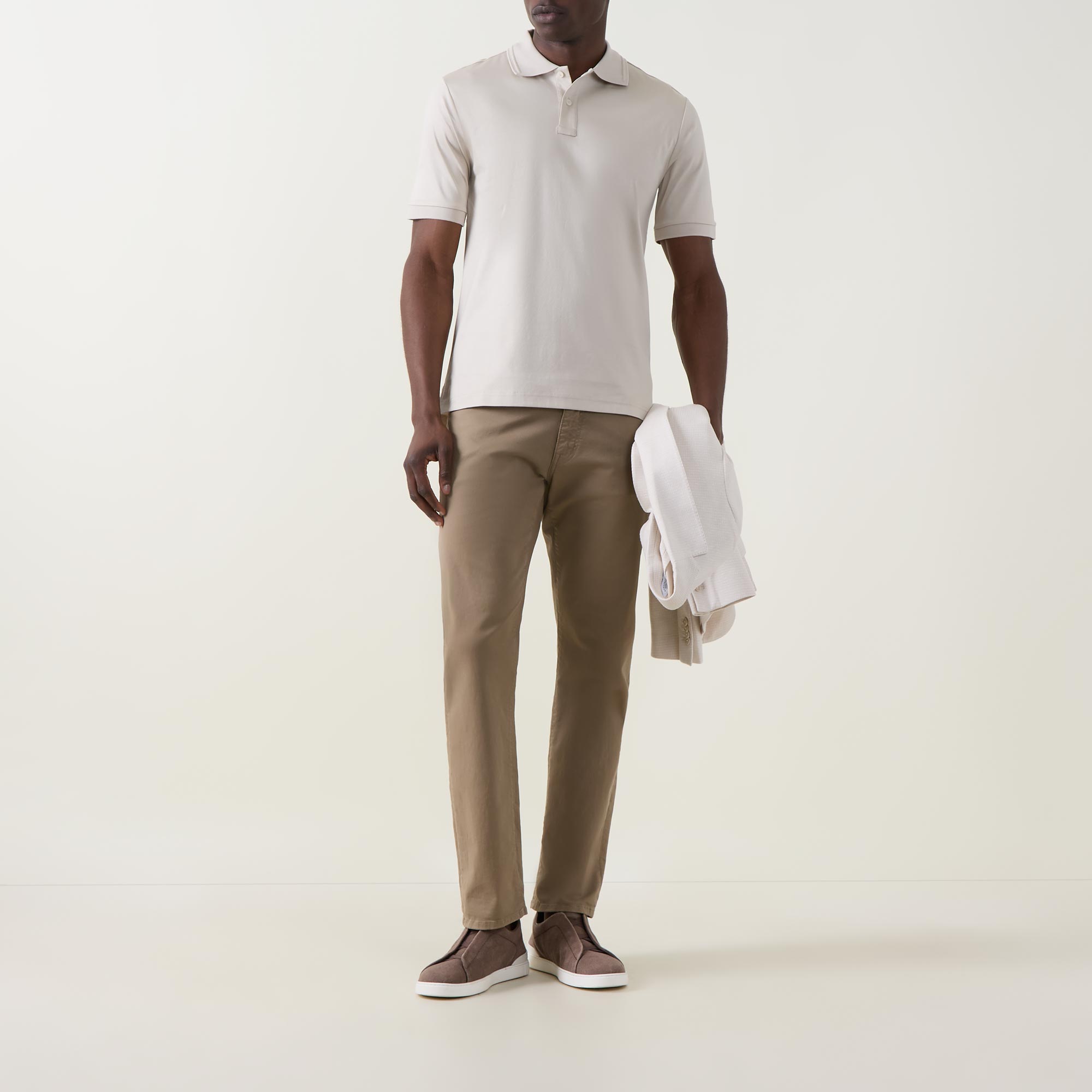 - Polo collar, two-button placket, short sleeves, straight hem, side split detailing, subtle sheen
