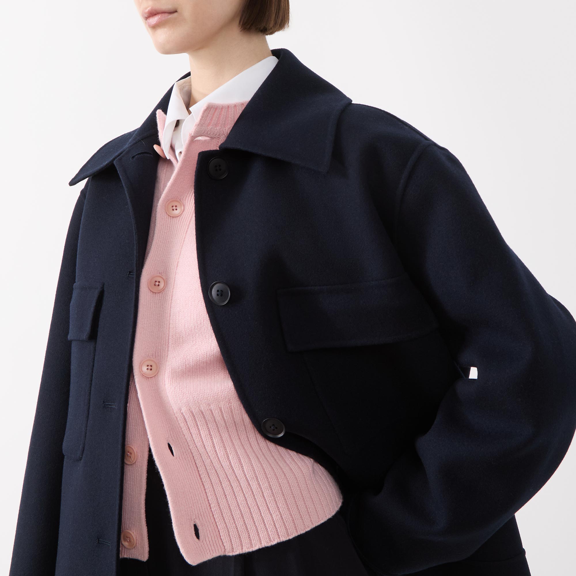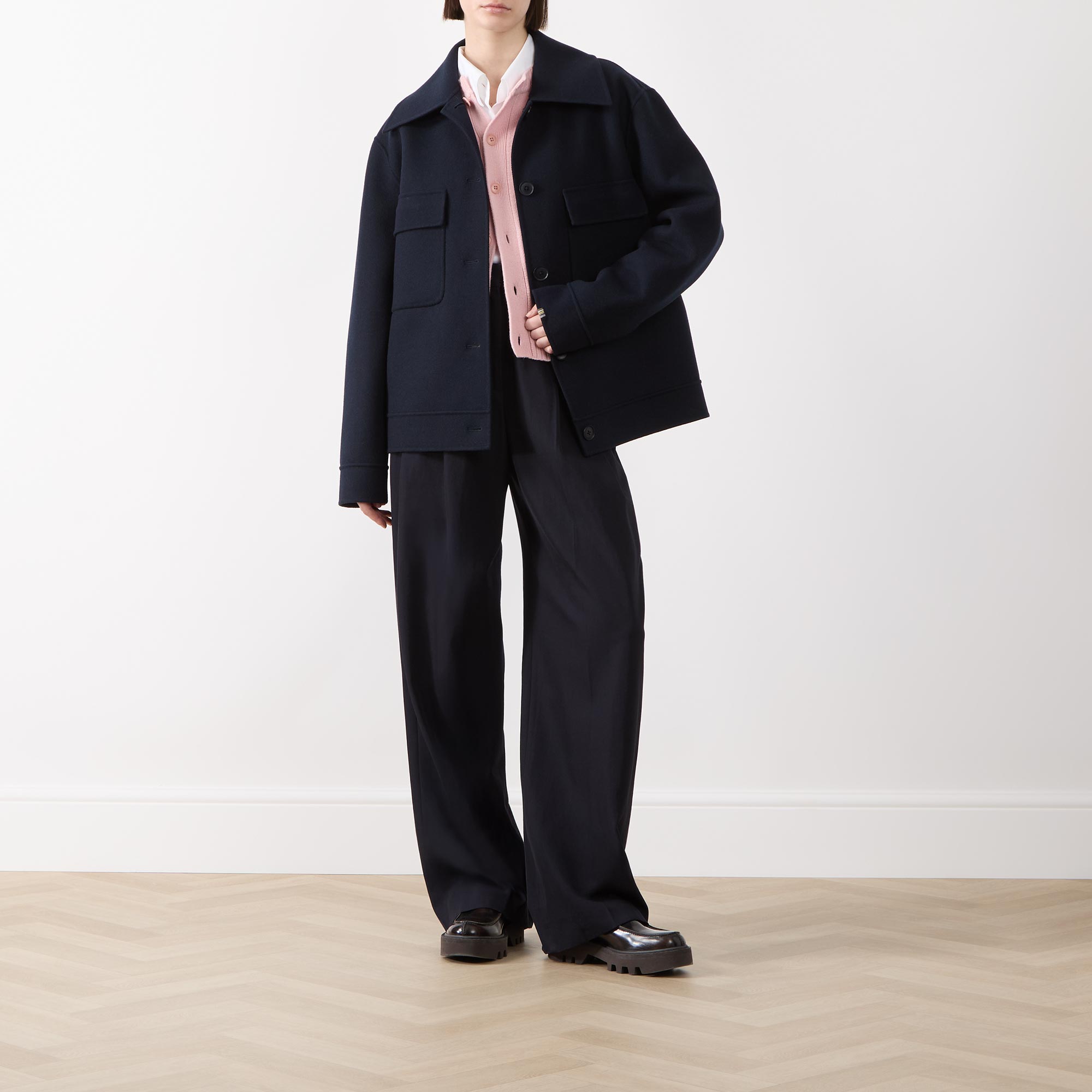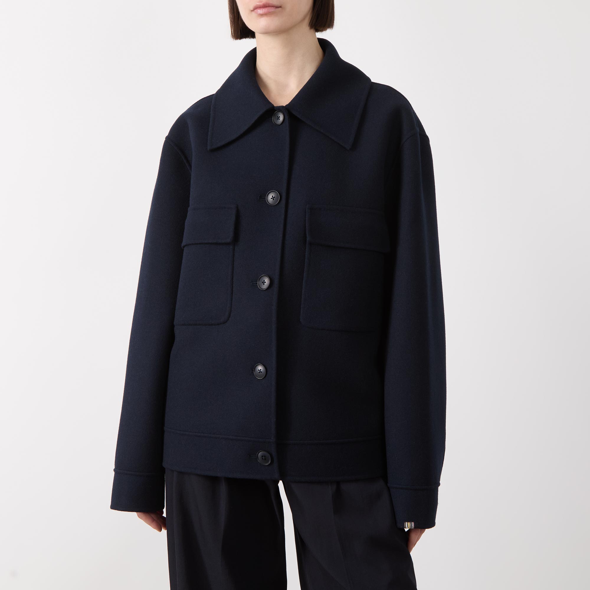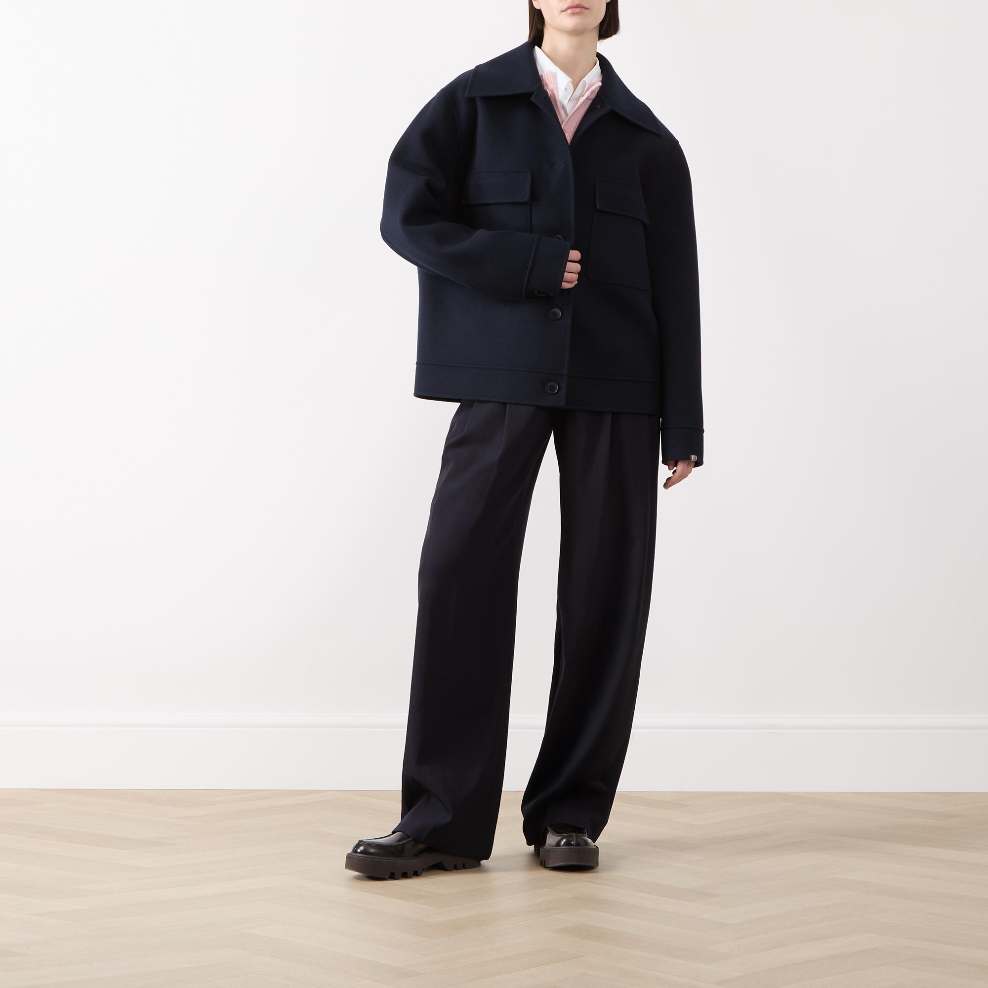 • Exaggerated collar, dropped shoulders, long sleeves, buttoned cuffs, front button fastening, two chest flap pockets, straight hem, soft finish