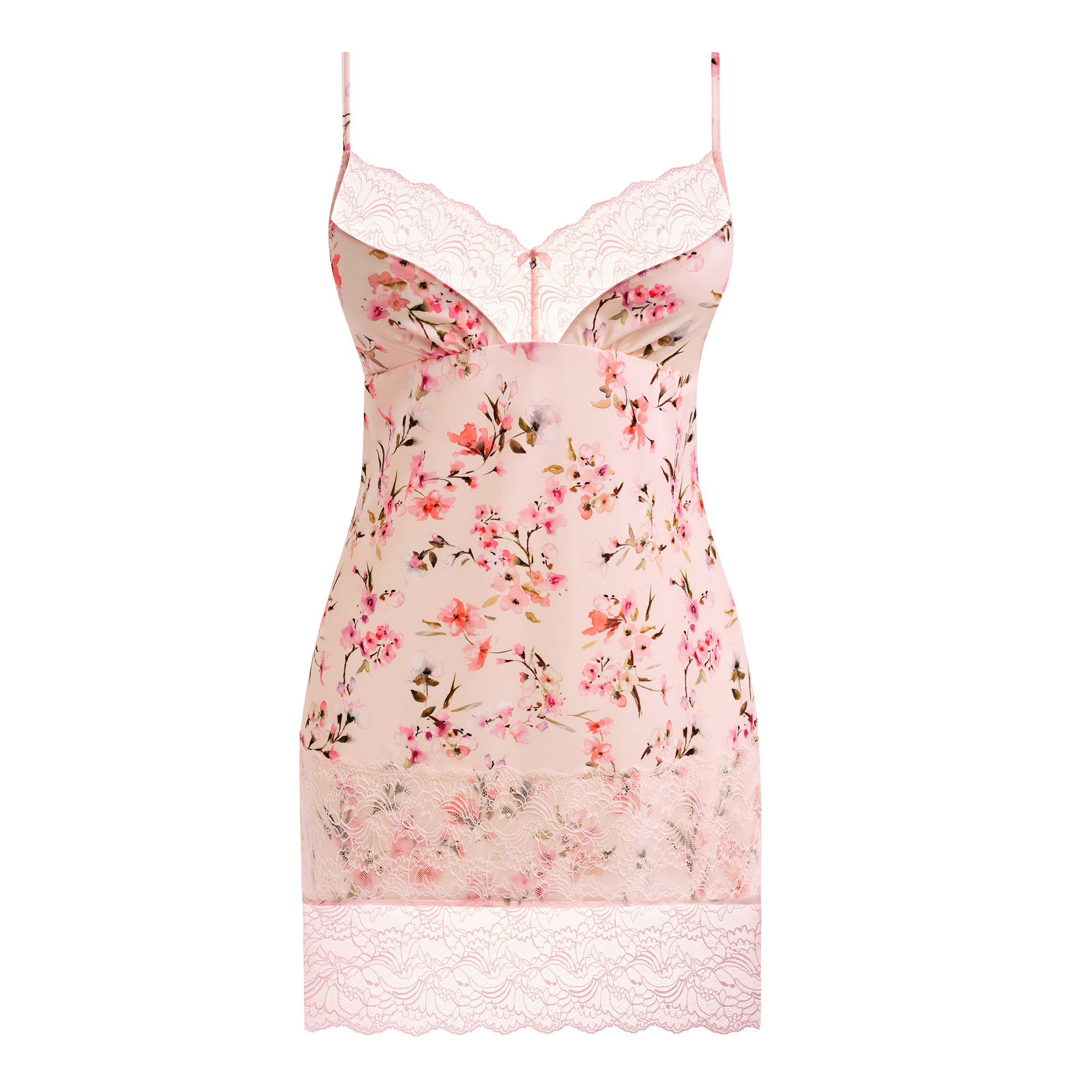 - Floral print, stretch-fused lace trim, deep lace hem, fully adjustable rouleau straps, bow detail, front metallic charm