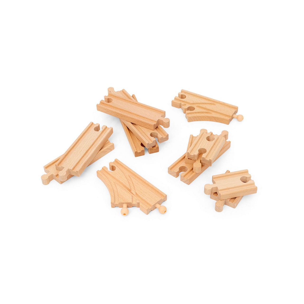 Expand your BRIO World Starter Train Sets with the Starter Track Pack. This train track expansion pack includes a selection of wooden railway pieces that can be used to create five additional layouts. Combine different length straight tracks, switching tracks and connector tracks and either follow the suggested layouts included or create your own open-ended designs.