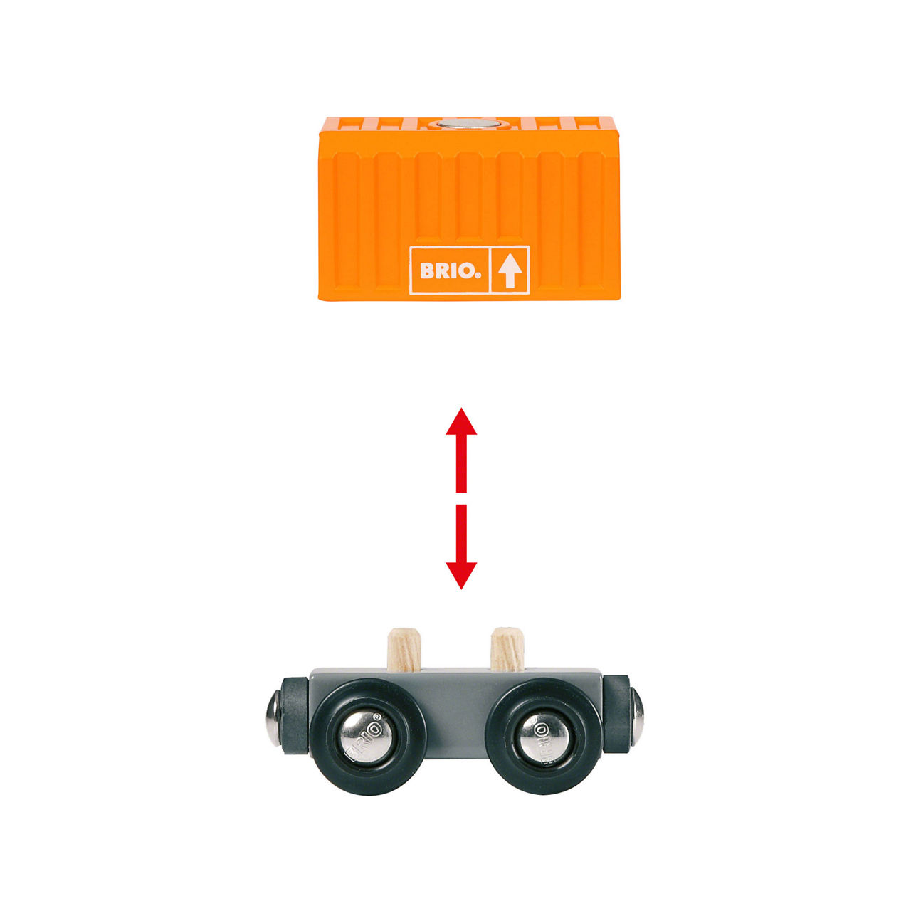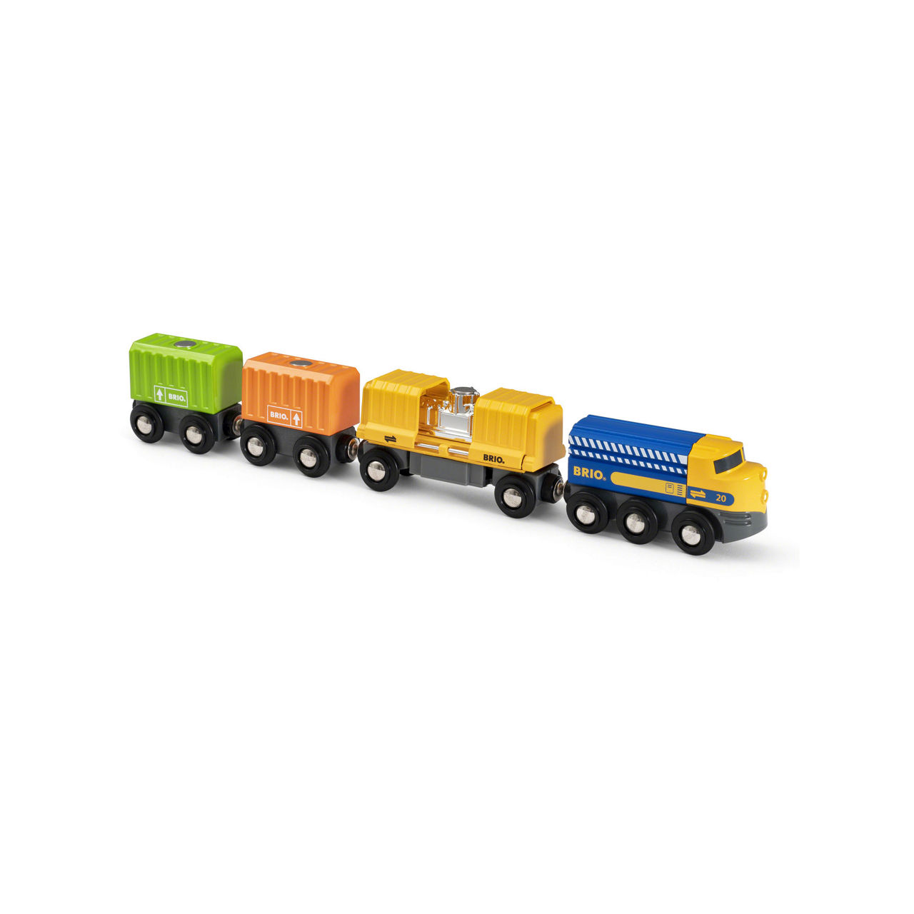 - One wooden cargo engine, one cargo wagon with sliding doors, one silver metallic motor load, two wagons for loads, one orange container load, one light green container load, magnetic connections