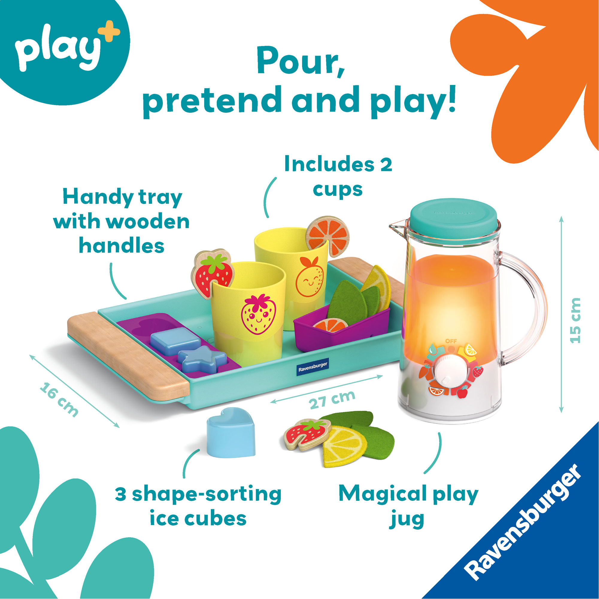 - 19 pieces total, pretend play set, magical jug with colour-changing technology, real-life pouring sounds, multisensory details, ice cube tray for shape sorting, two cups, three ice cubes, ten fun accessories, one container