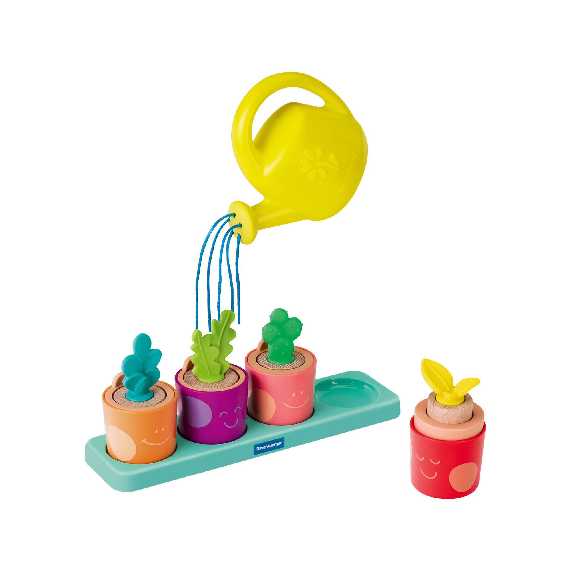 - 14 pieces, one watering can, four planters, four plant pots, one shelf for plants, four plants, role play plant set, based on Montessori concepts, encourages fine motor skills