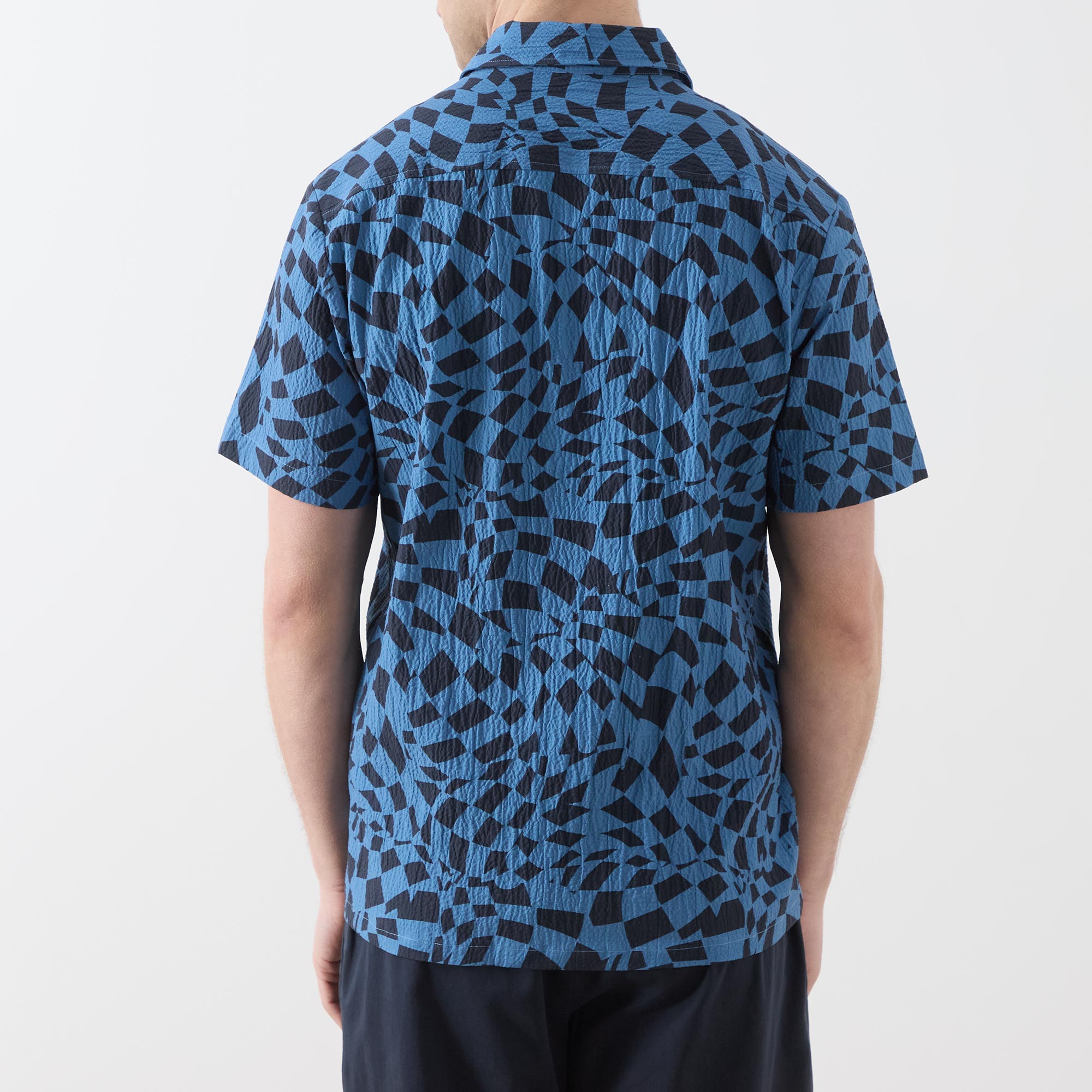 • Pointed collar, short sleeves, logo detail, curved hemline, button fastenings, check print