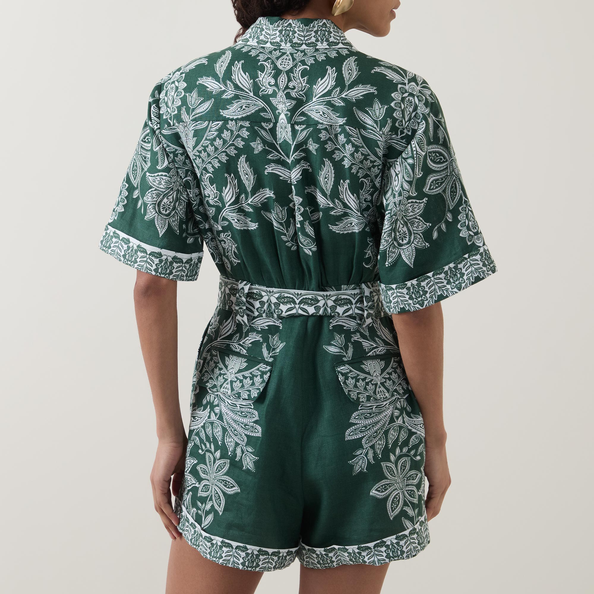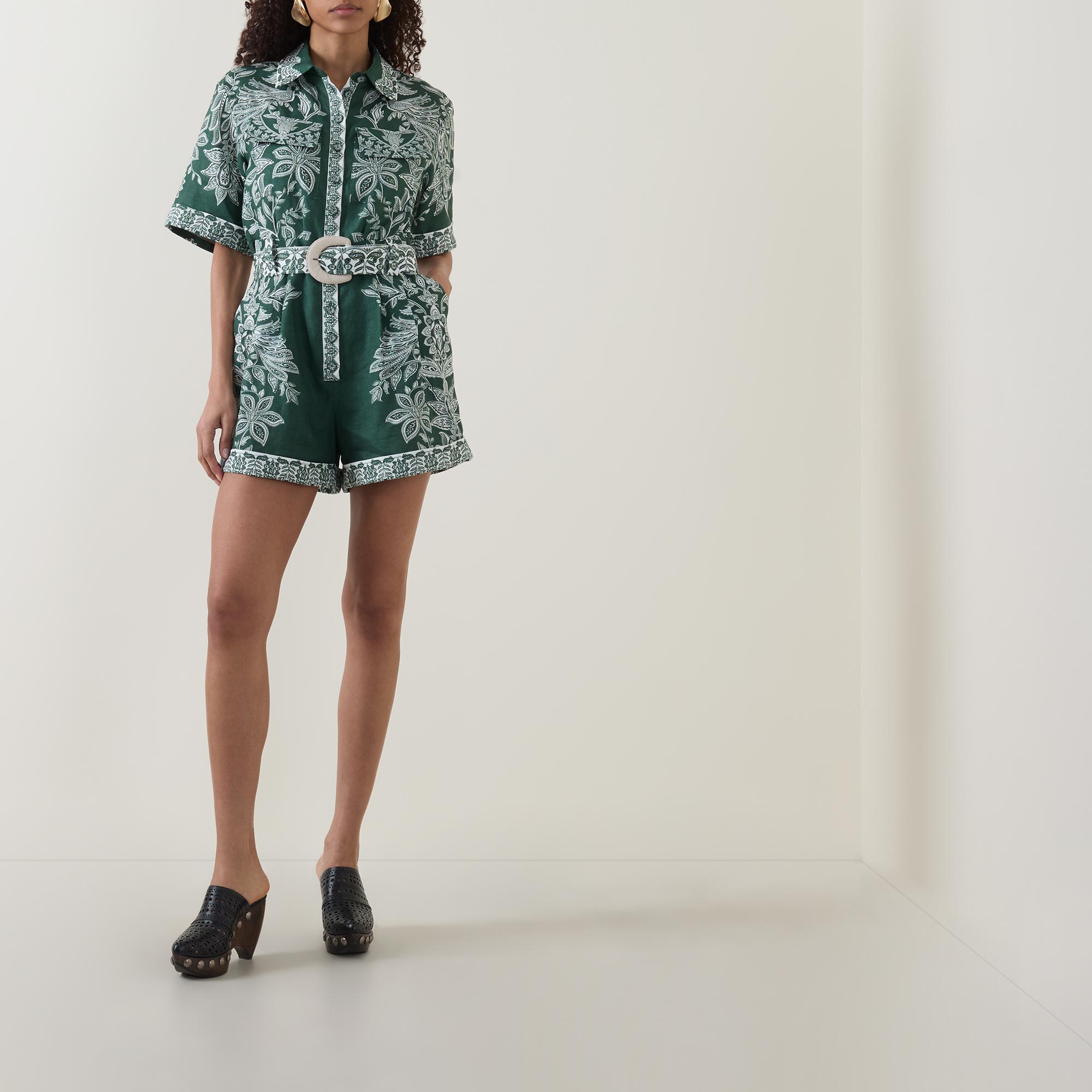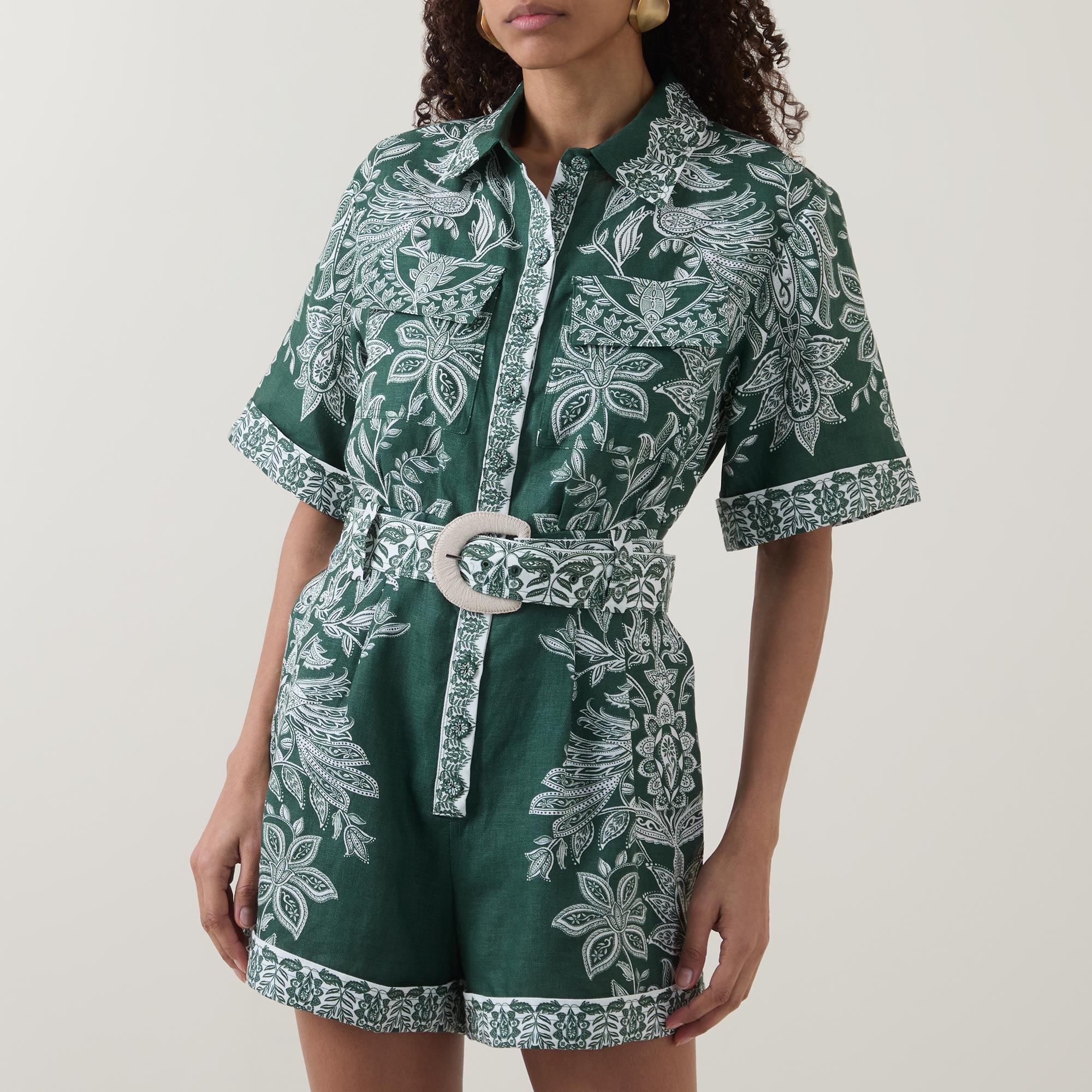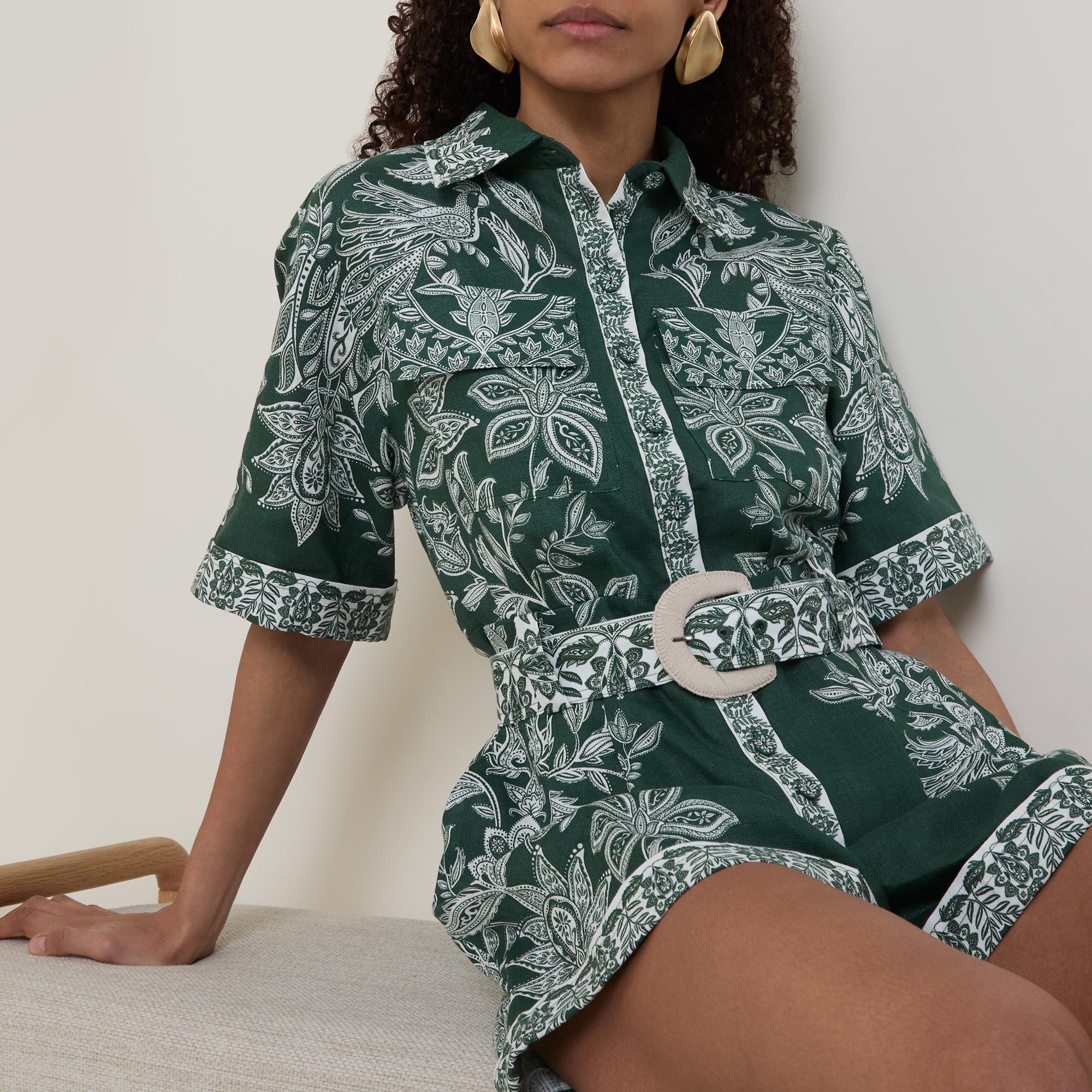 • Point collar, dropped shoulders, short sleeves, turn up cuffs, front button fastening, two chest flap pockets, two rear flap pockets, belt loops, matching belt with buckle closure, rear elasticated design, two side entry pockets, straight leg, above the knee length, printed design, lightweight, breathable
