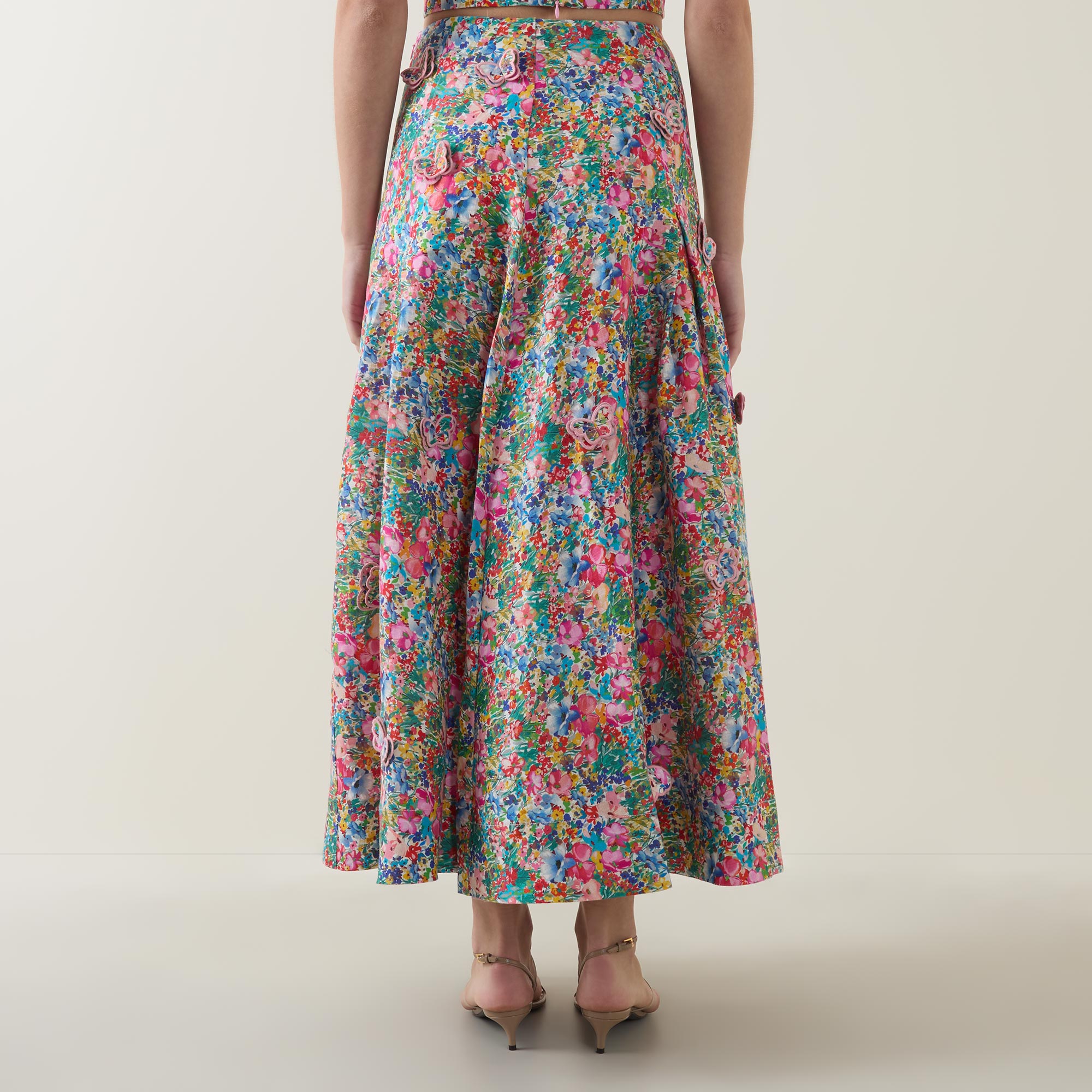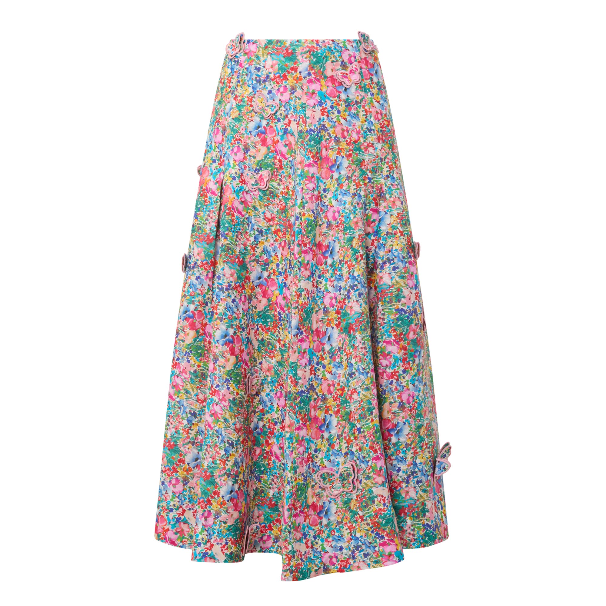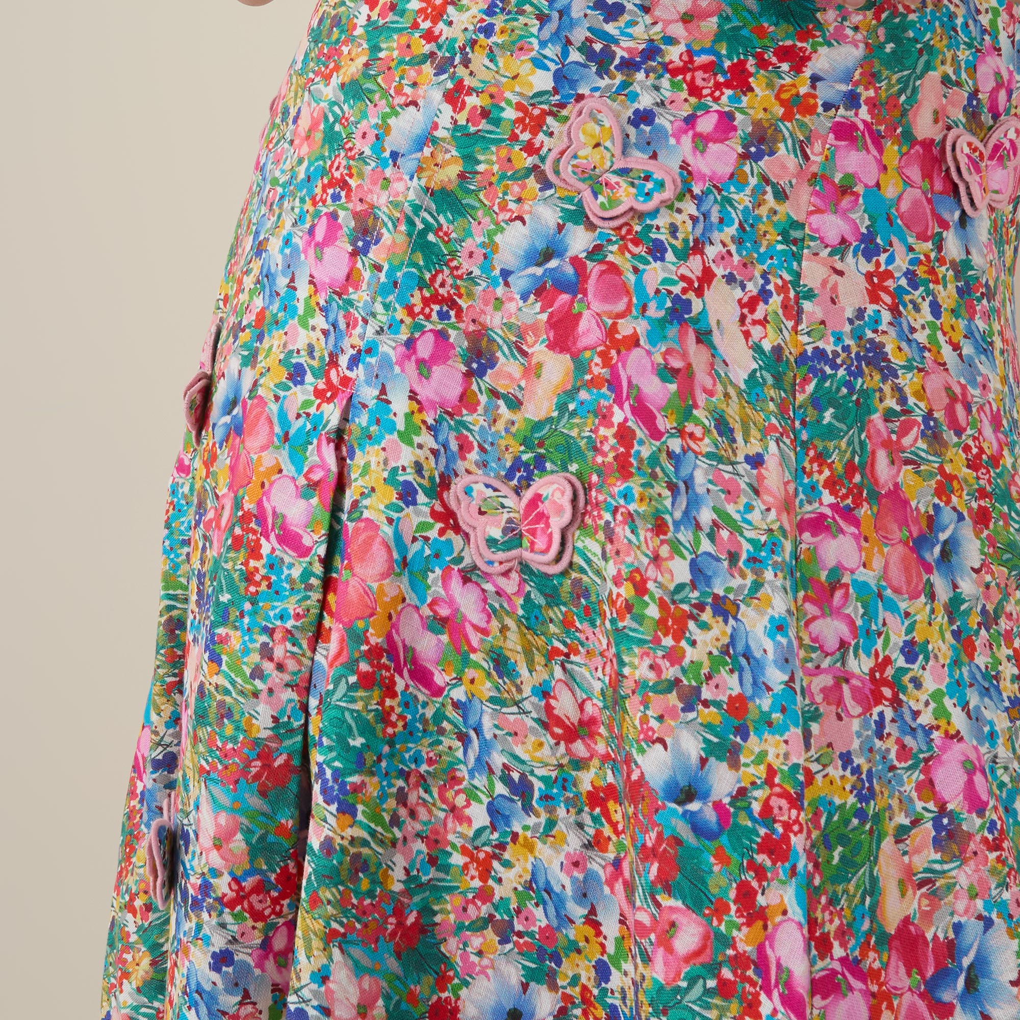 - Midi length, floral pattern, butterfly appliqués, pleated details, zip fastening