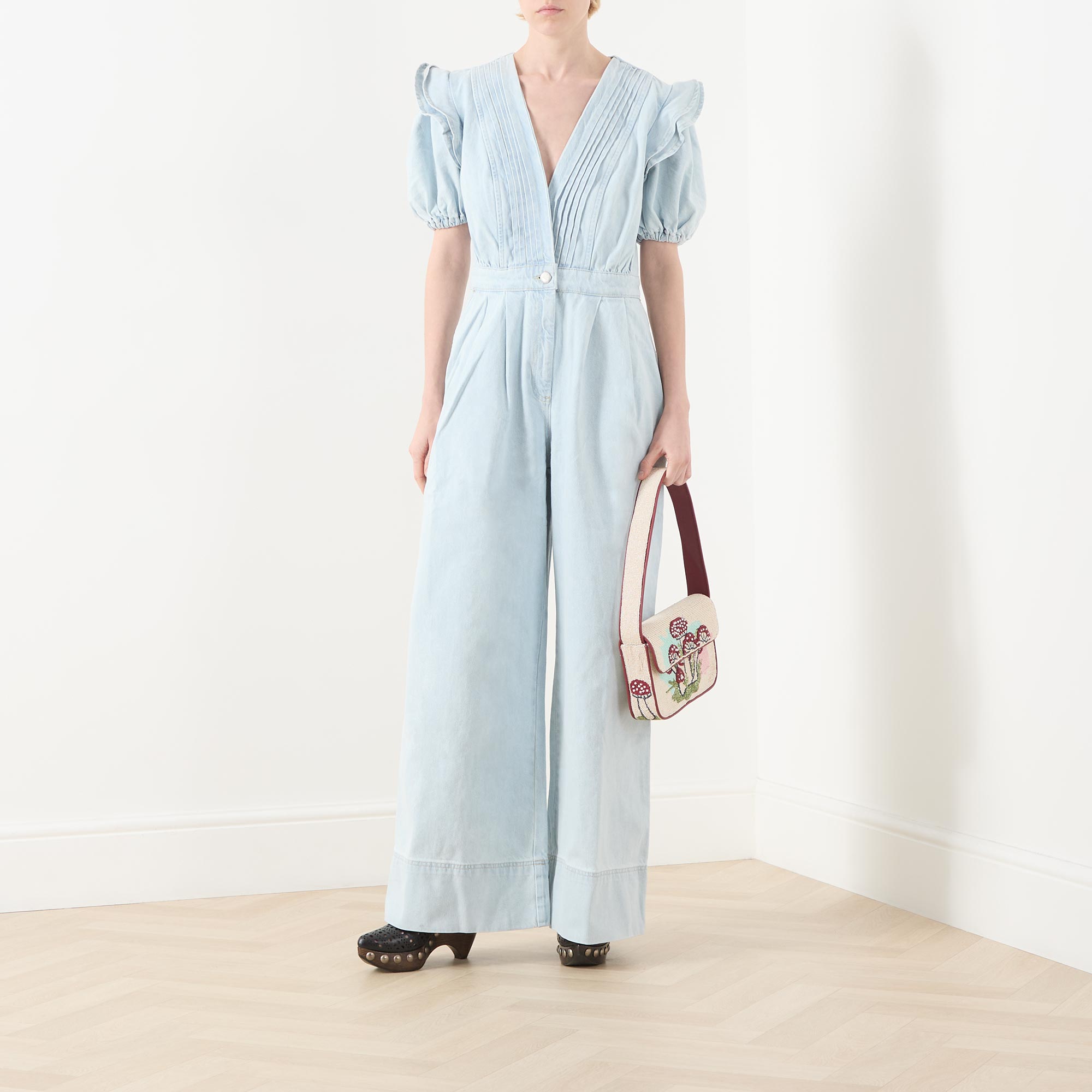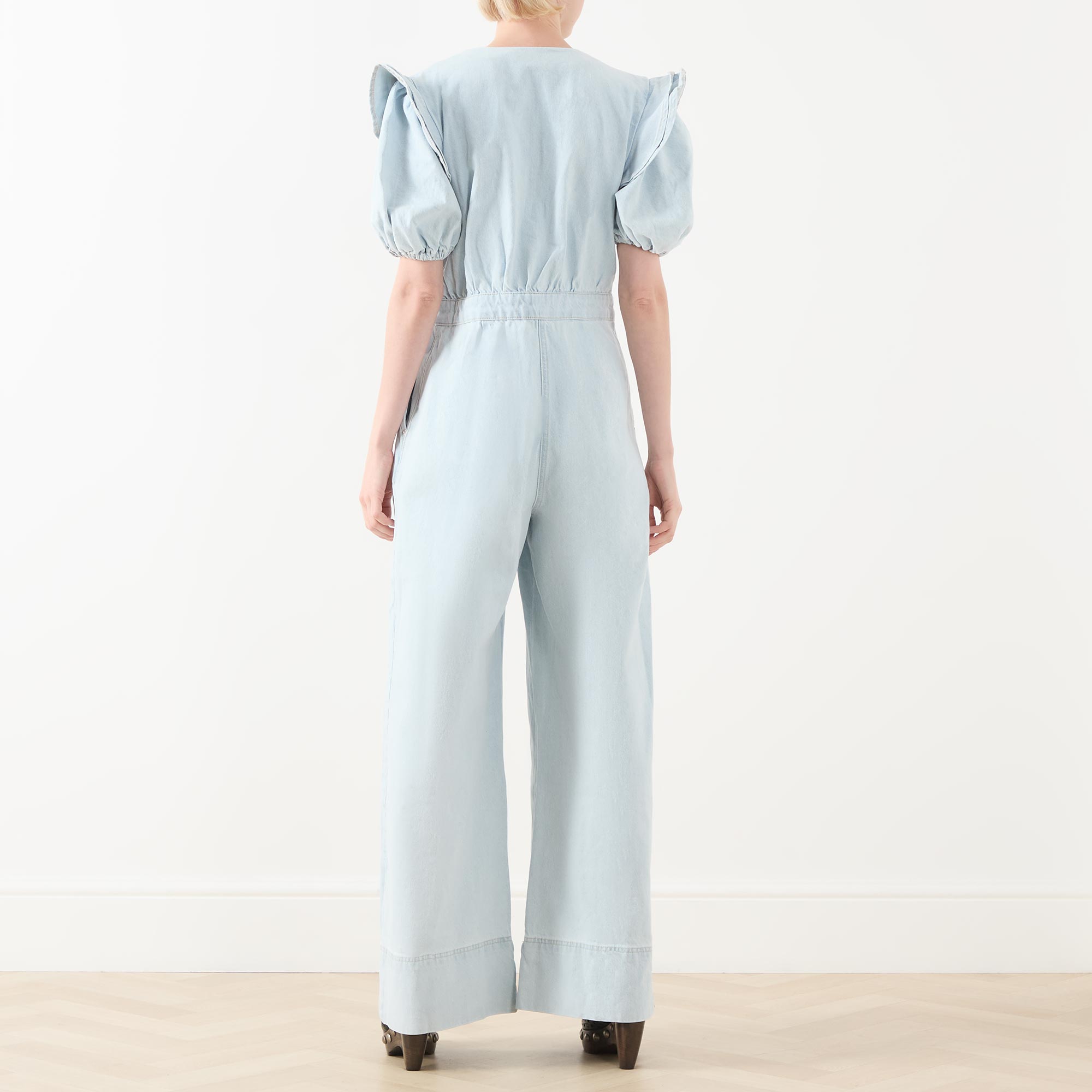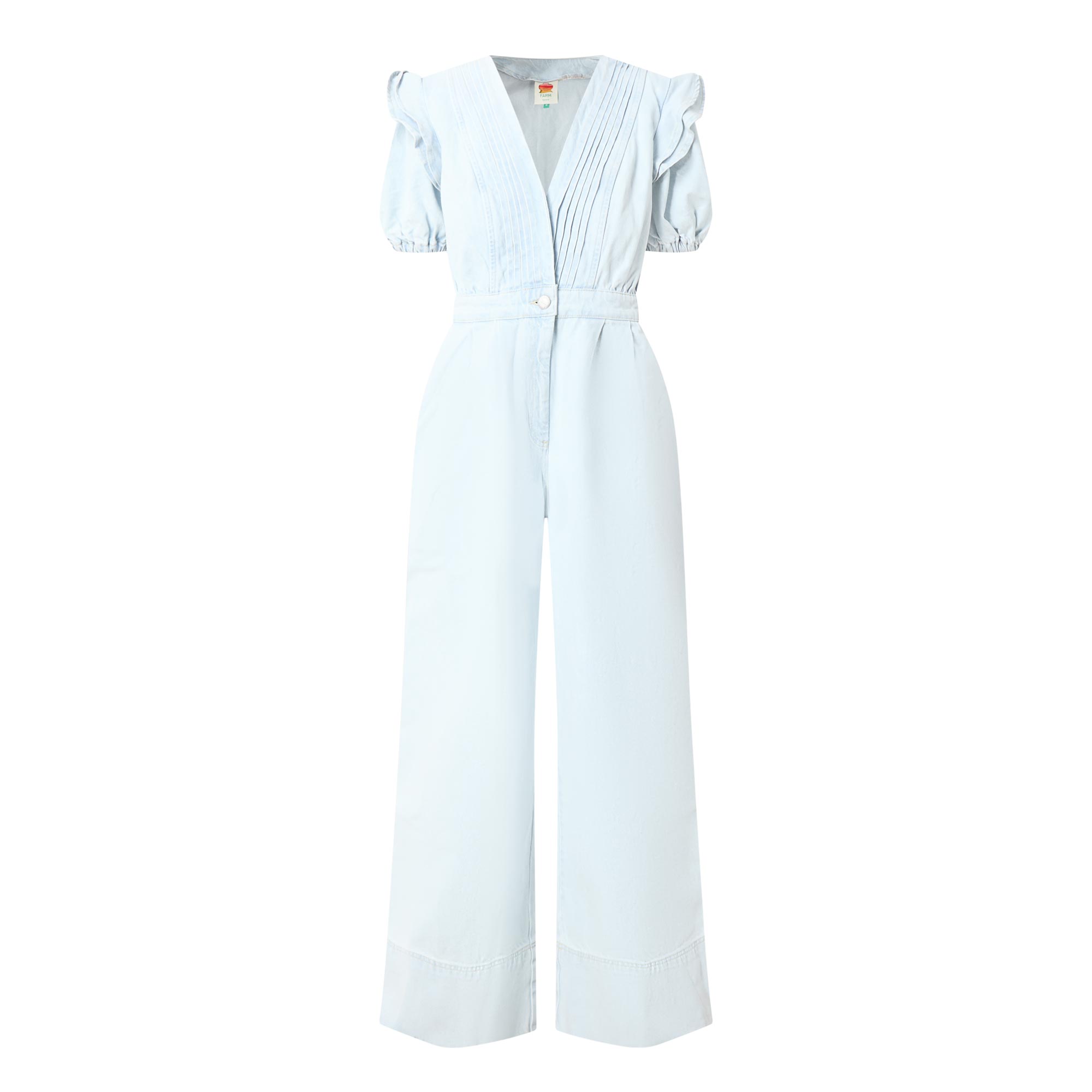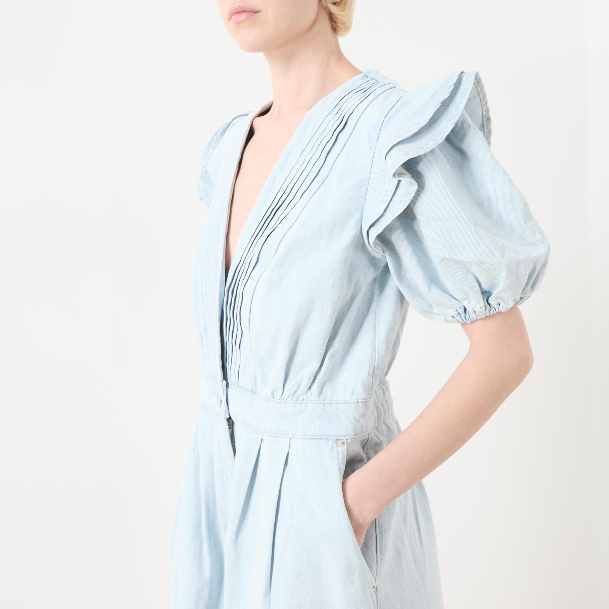 - Short puff sleeves, plunging V-neckline, ruffle shoulder details, pintuck pleating, elasticated cuffs, button fastening, two side in-seam pockets, wide-cut leg, smooth denim finish
