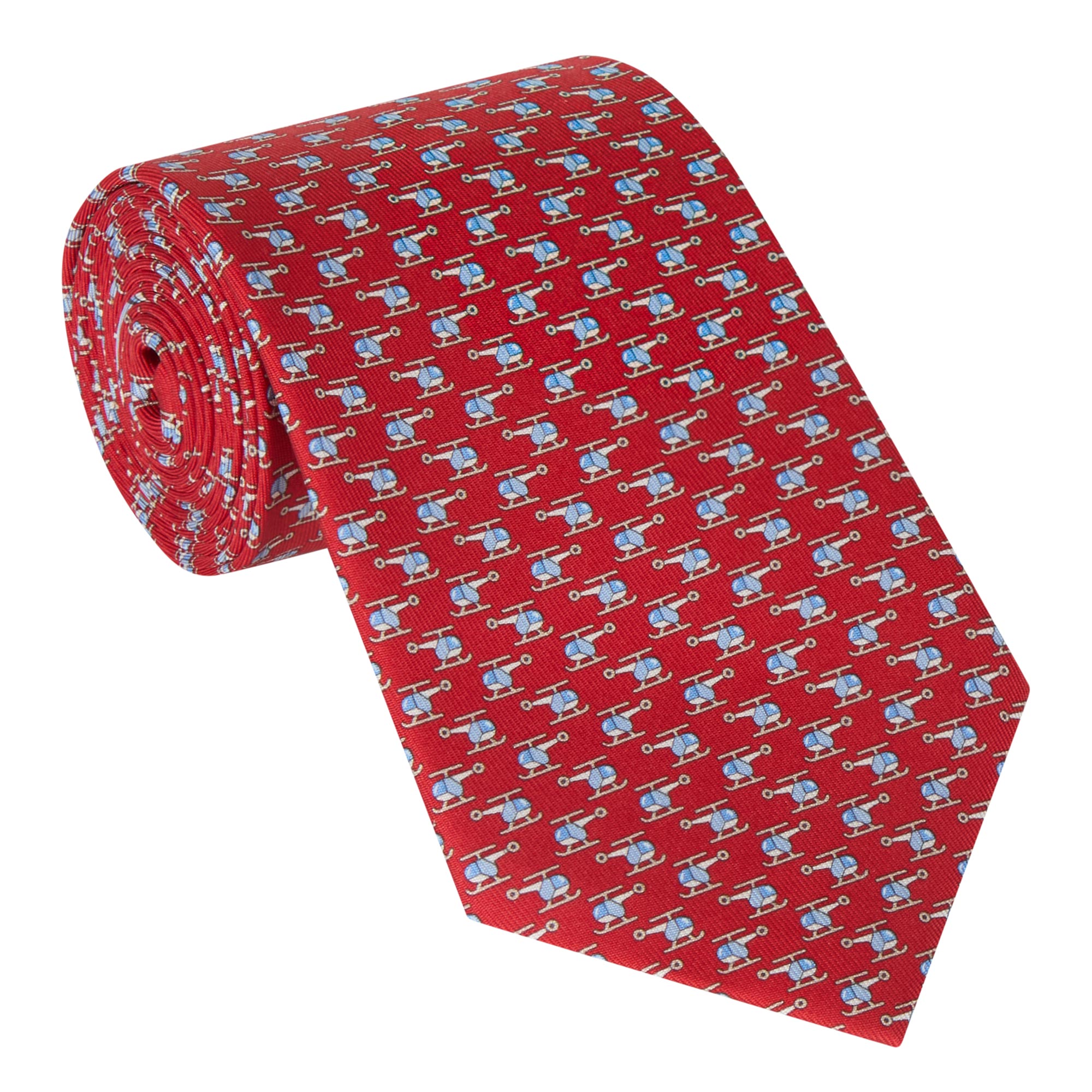 • Helicopter print, wide blade, pointed tip, fully lined